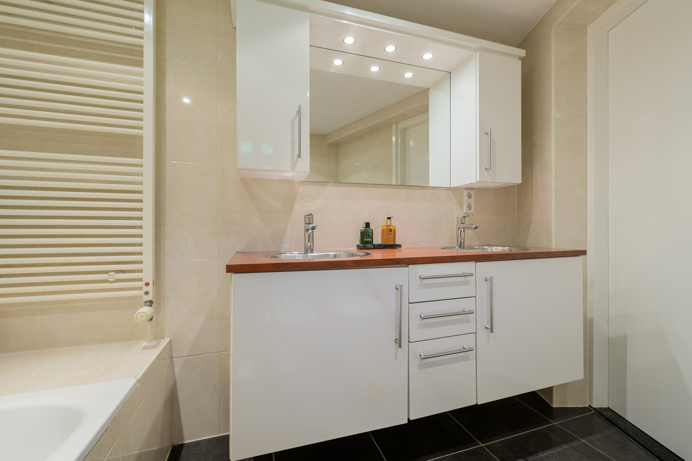 Utility room with (anthracite) tiled floor. Here you will find the connections for the washing machines, wall cabinets, and extra space for a refrigerator or freezer.