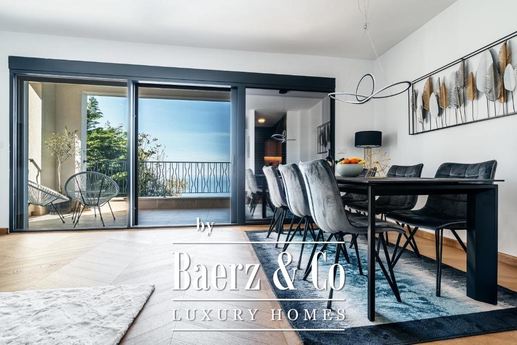 The curated layout comprises a hallway, living room with kitchen and dining area, three bedrooms, two bathrooms, and a terrace oriented toward sweeping sea and mountain views. Every space is fully furnished and ready for immediate occupancy. Residents of the complex enjoy access to a shared pool and an onsite restaurant, heightening the sense of community and ease.