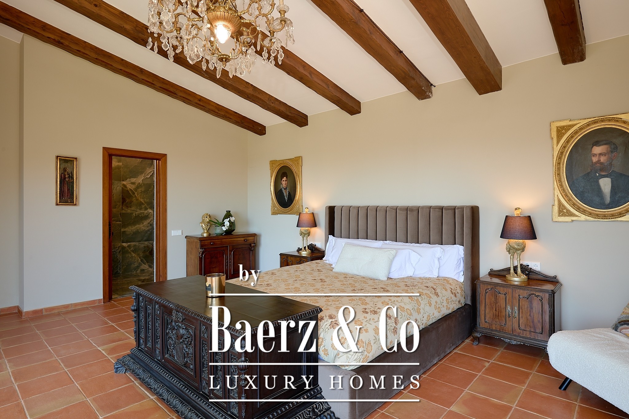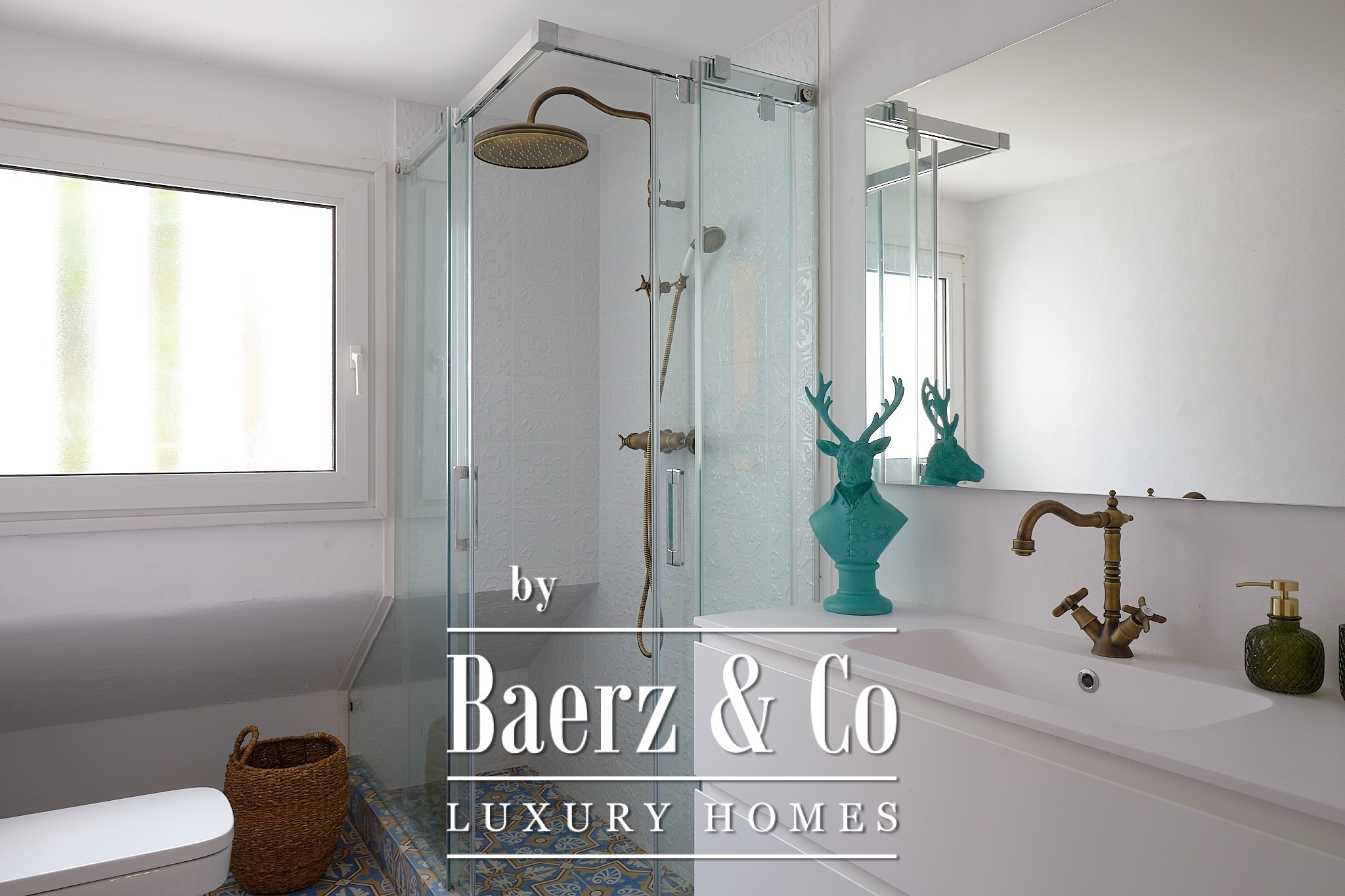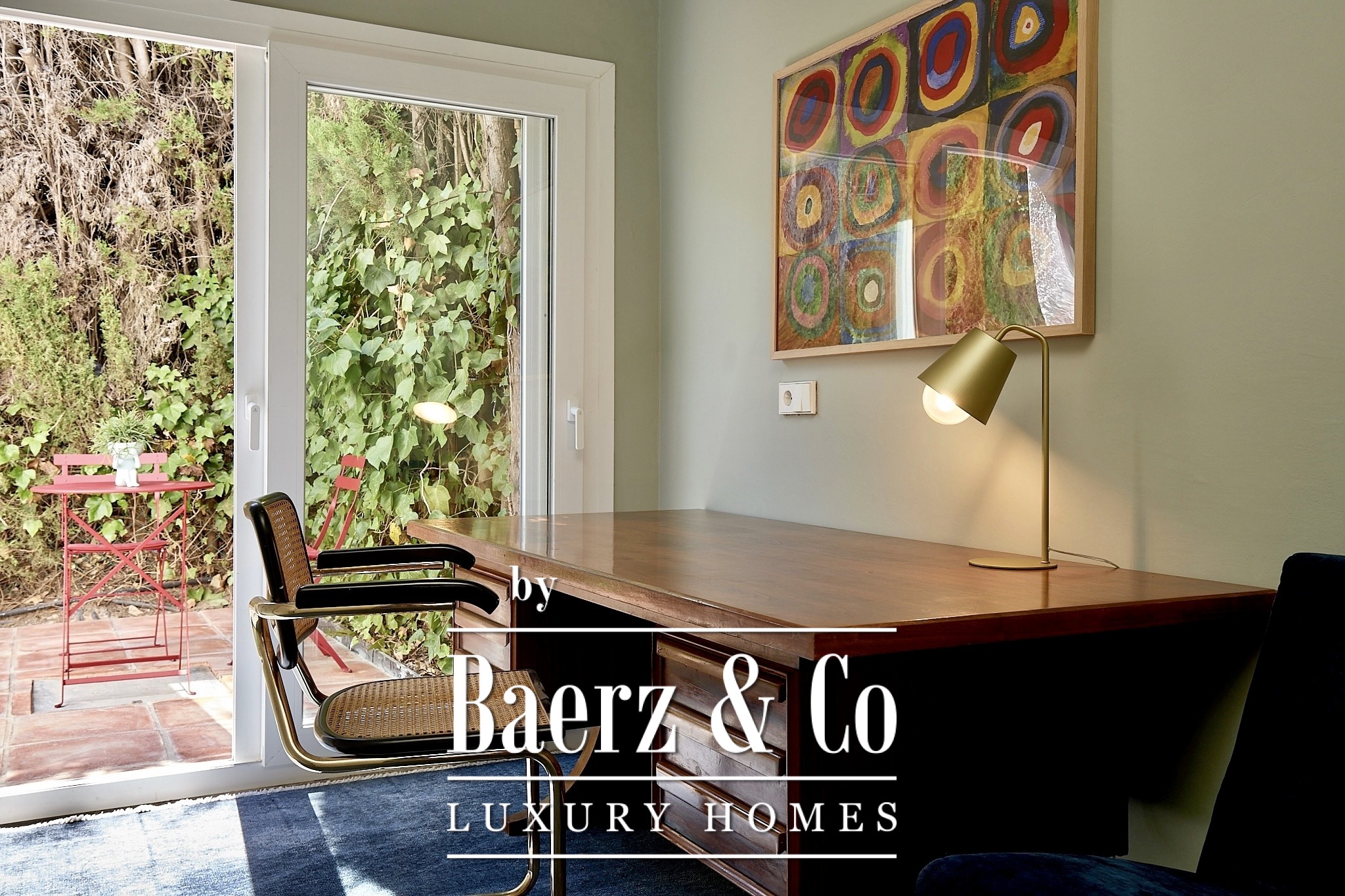 A separate loft-style guest house provides guests with complete autonomy, including its own kitchen and bathroom. Outside, a new swimming pool, solarium, landscaped gardens, and a covered dining and barbecue area evoke authentic Mediterranean retreat. A large private garage accentuates practical luxury.