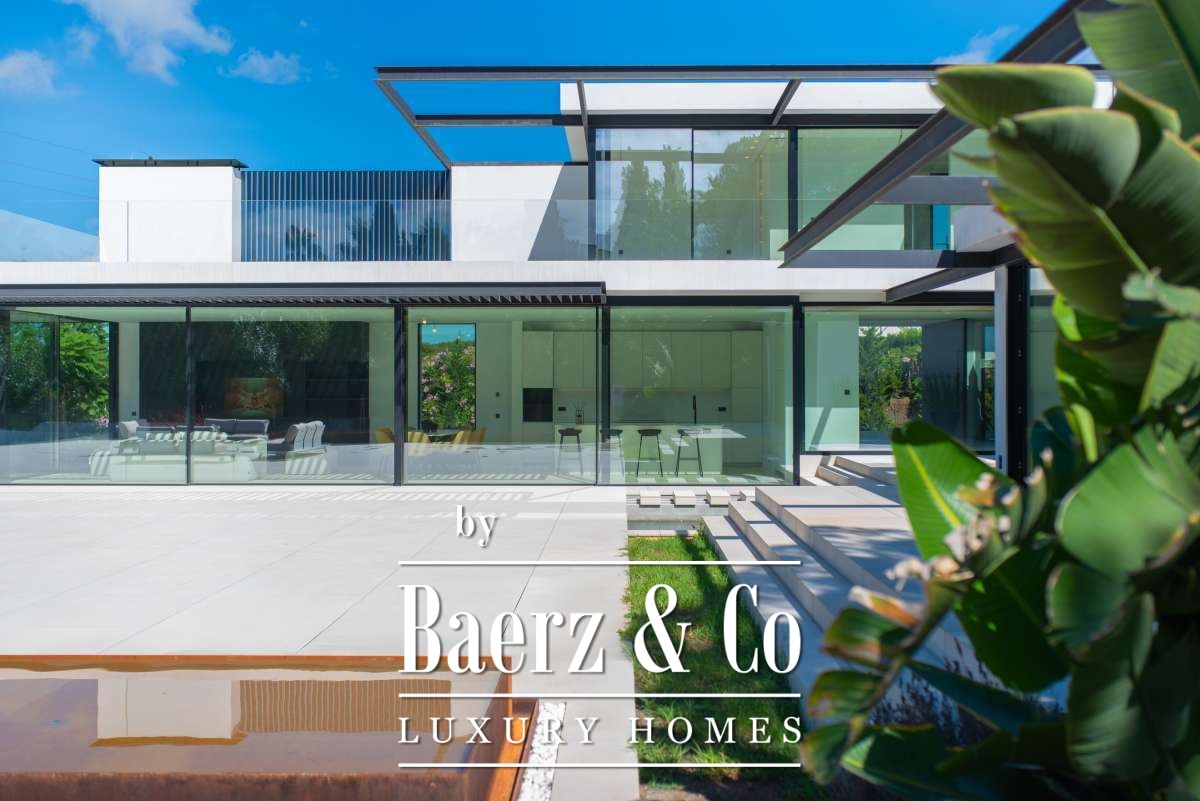 Each bedroom features built-in wardrobes and garden or terrace access, with the master suite enhanced by an en-suite bathroom including a designer bath, his-and-hers sinks, and a rain shower. The villa is thoughtfully equipped with mood lighting, smart temperature systems, and an integrated alarm. Outdoors, a Zen-inspired garden guides you to the entrance, where bonsai trees and a tranquil pond create a serene welcome. The backyard encompasses a sculptural infinity pool, a sun-bathed terrace, and tropical landscaping reminiscent of Bali, all set for privacy and contemplation.