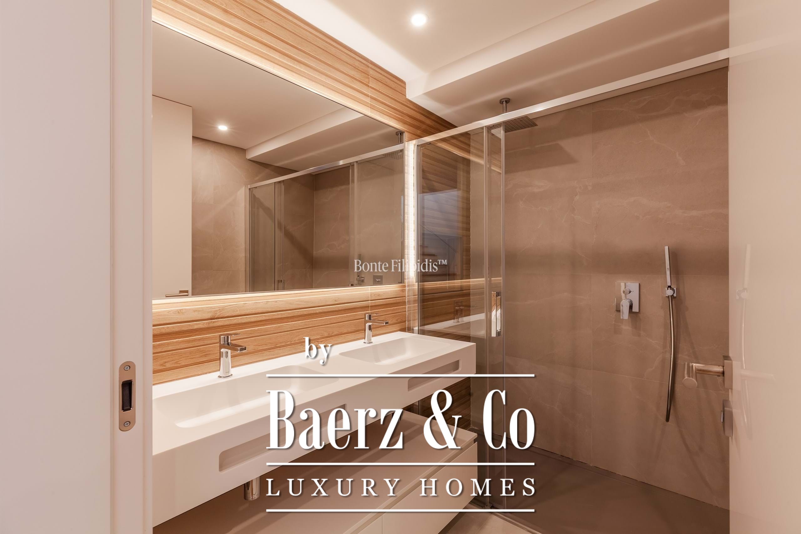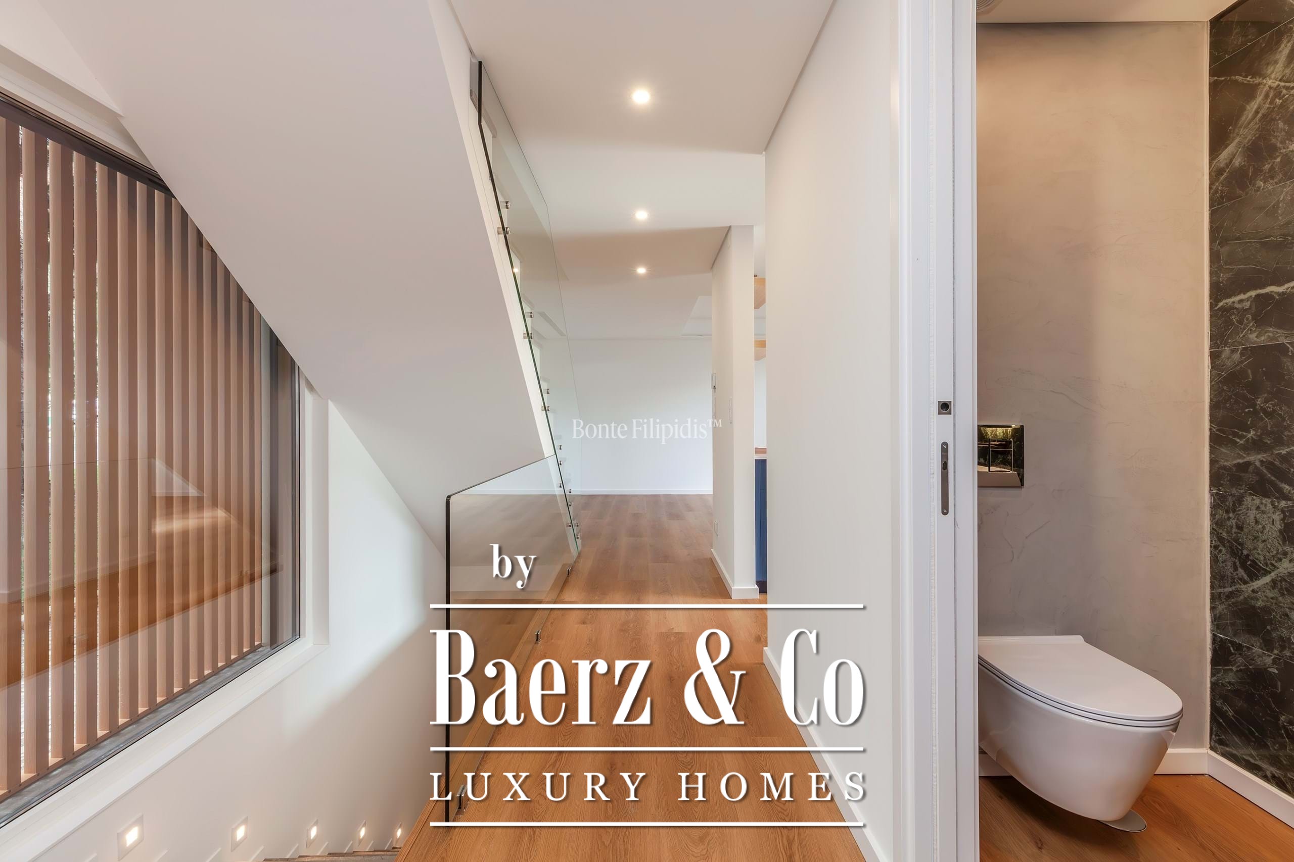 This townhouse Carcavelos e Parede draws on contemporary architecture to create a quietly distinguished living environment, spanning 217 m² across three well-considered floors. The open-plan kitchen, equipped with high-end appliances, connects seamlessly with the living room, inviting natural light while linking interiors to outdoor spaces and the landscaped terrace. An additional suite on the entrance level lends versatility and privacy, suitable for guests or adaptable living.