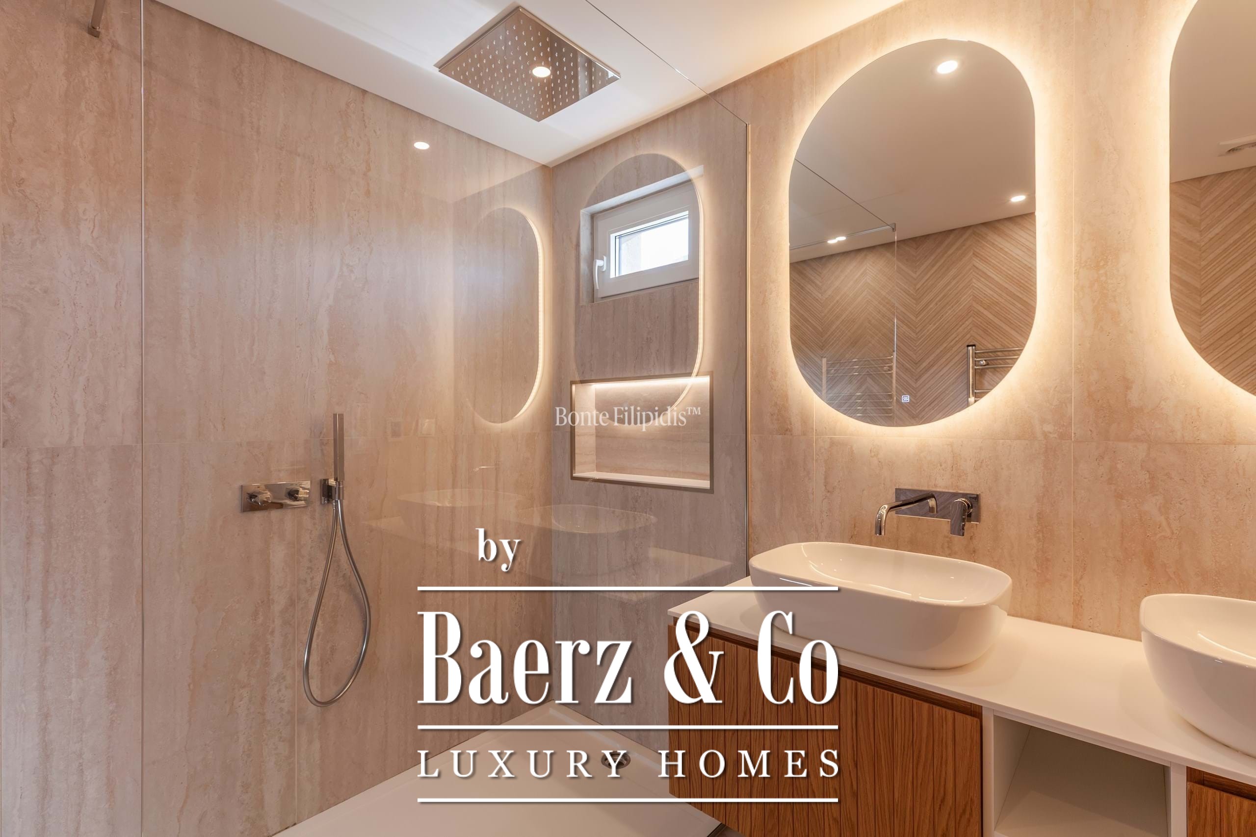 Upstairs, the primary suite features a walk-in closet, while two further bedrooms and a shared bathroom support family life. The top-floor multipurpose room, with its own full bathroom and access to a generous terrace, becomes the ideal vantage point for sunsets, leisure, and reflection under the coastal sky. Each bathroom benefits from electric underfloor heating, and sustainability is integrated through solar panels and pre-installed electric vehicle charging.
