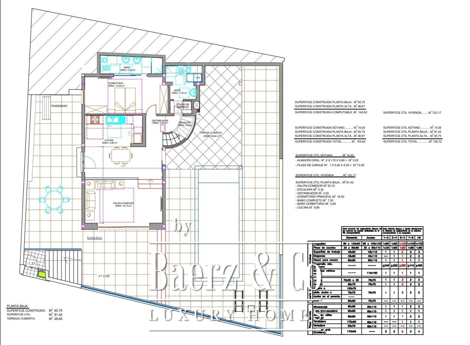 The intelligent floor plan includes three bedrooms and four bathrooms, laid out across 140 m² of bright, open living space. Double-height terraces, a private swimming pool, and expansive outdoor areas create a seamless transition between indoor and outdoor living. Ocean views provide a constant presence, especially from upper floor bedrooms, each with its own terrace, en-suite bathroom, and walk-in closet. The design offers customization possibilities, making the villa adaptable to individual taste.