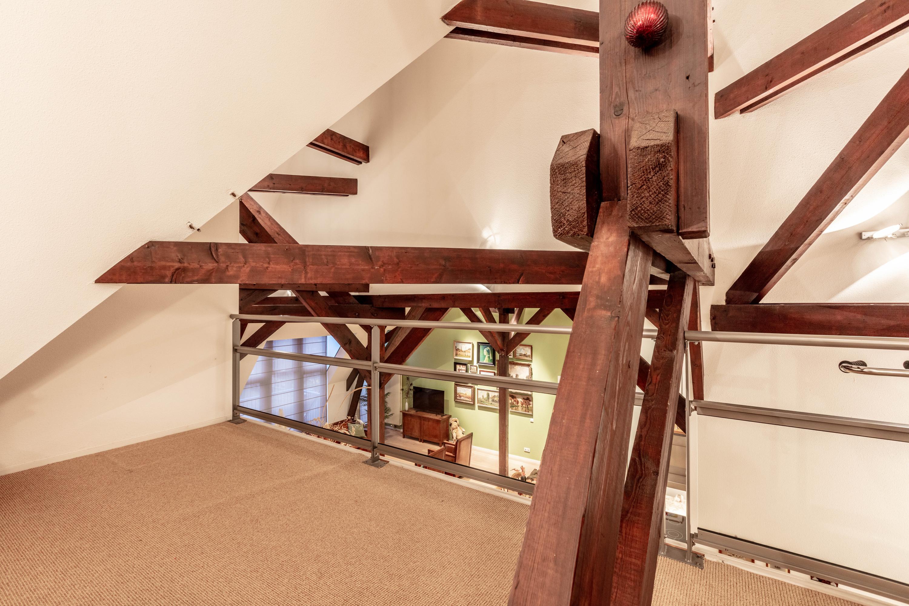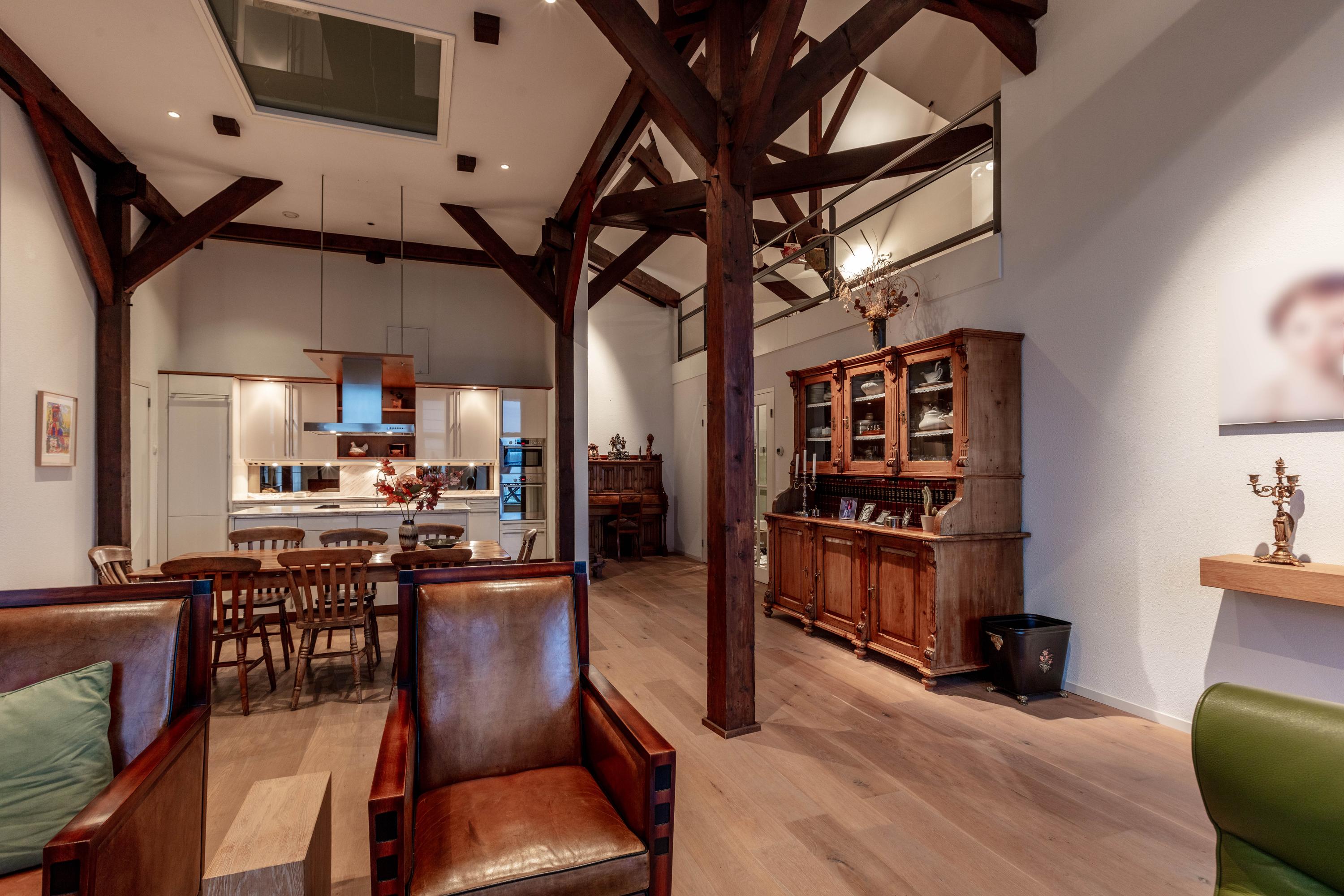 De bijzonder sfeervolle woonkamer is indrukwekkend door de unieke hoogte en fraaie zichtbare kapconstructie. De open keuken bevindt zich aan de achterzijde en beschikt over een kookeiland, volop kastruimte en diverse inbouwapparatuur. Vanuit de keuken is er prettig zicht op de woonkamer met een gezellig zitgedeelte en een apart eetgedeelte.