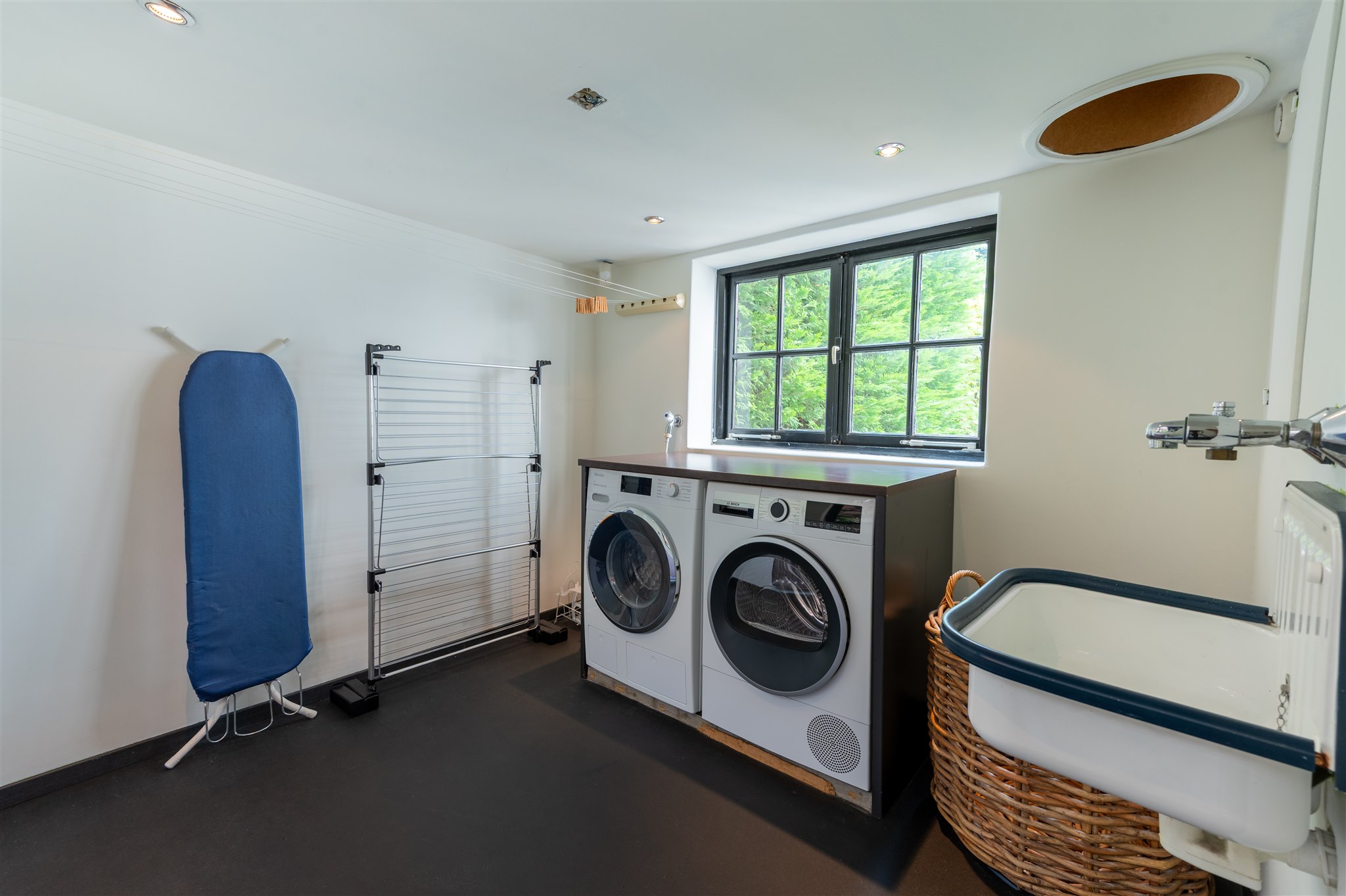 From the hallway, access is provided to the 27 m² vaulted cellar and further on to the garden room, complete with underfloor heating and painterly wall coverings. Adjacent is a small pantry/summer kitchen leading to a covered patio and the tropically landscaped rear garden of approx. 100 m². The garden includes a stone shed and rear access to the courtyard of the neighbouring complex, where three parking spaces are available by right of way.