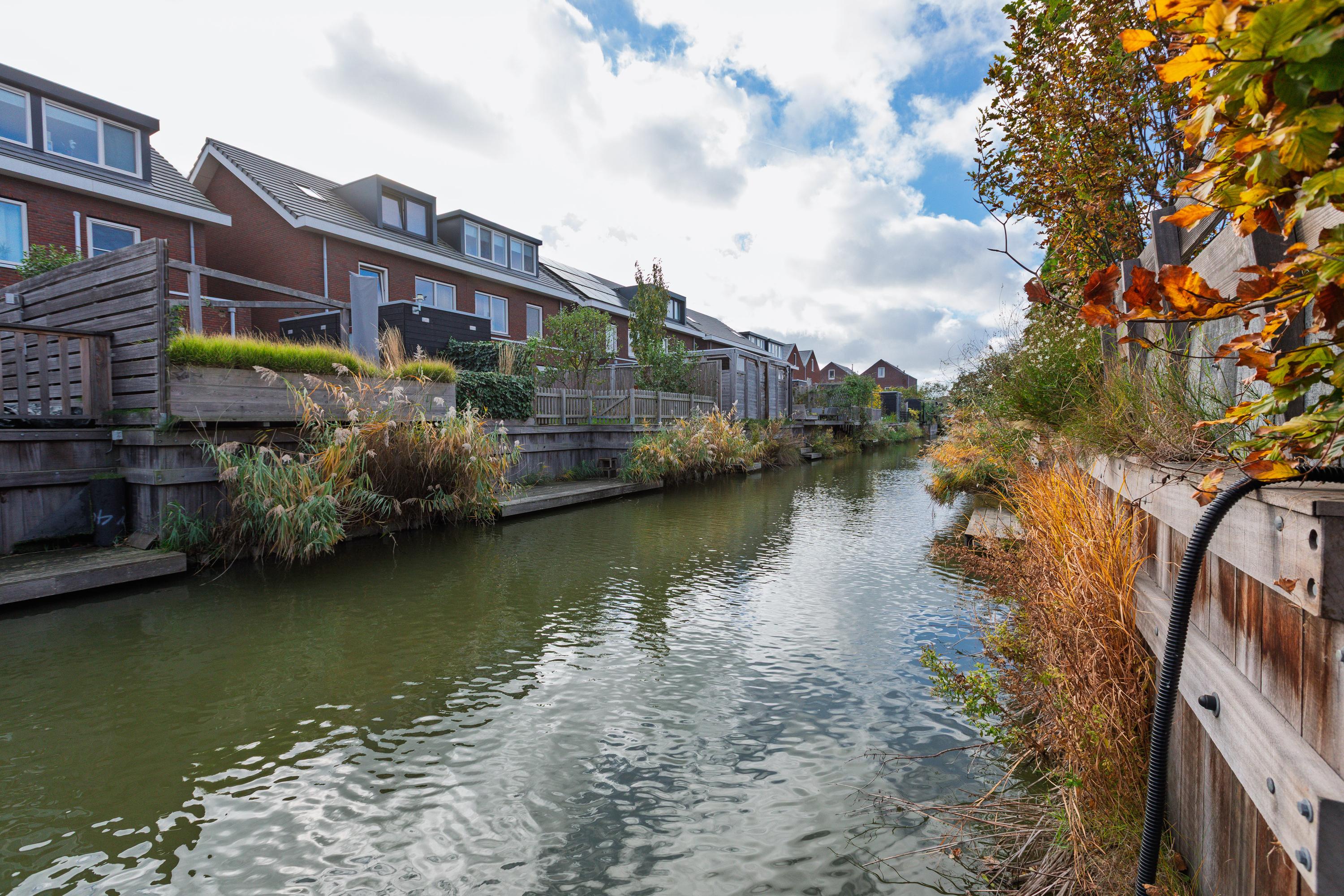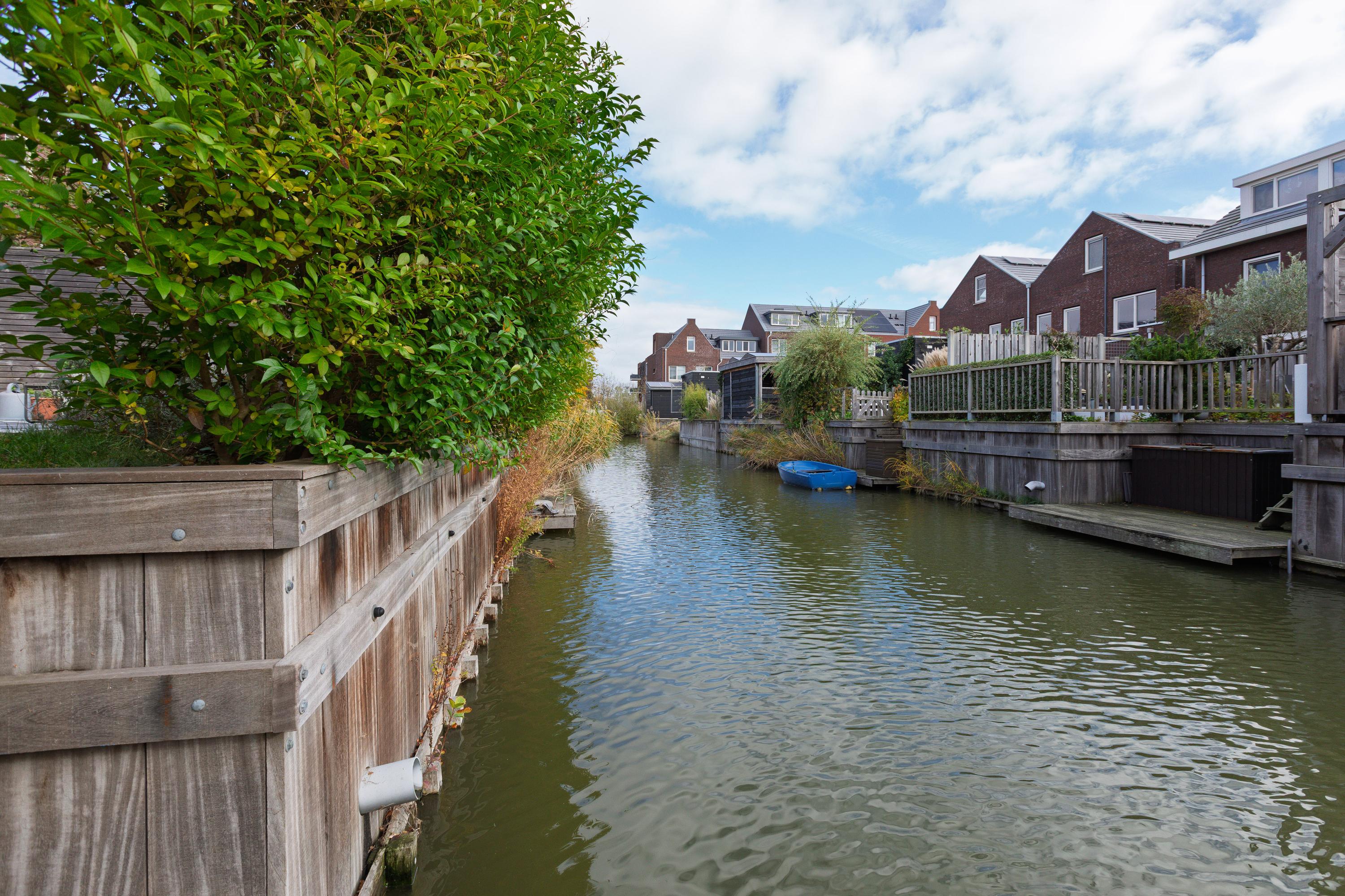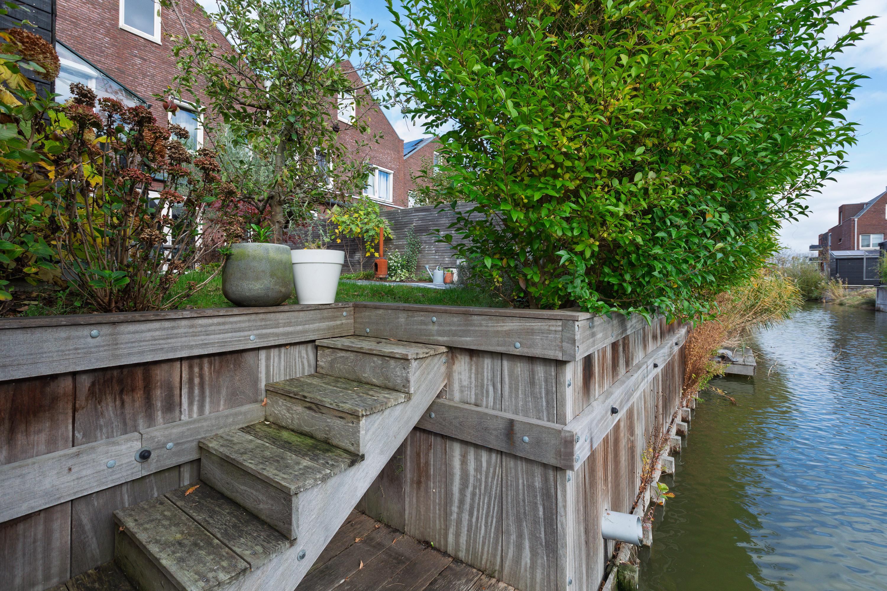 At the rear is the living area with a view of the beautifully landscaped garden. The living room is wide and offers enough space for a spacious sitting area. The sunny south-facing back garden has a large terrace, a greenhouse, a wooden shed and a jetty on the water. In summer, you can step right from your own garden onto your SUP board! The garden is also accessible via a back entrance along the house.