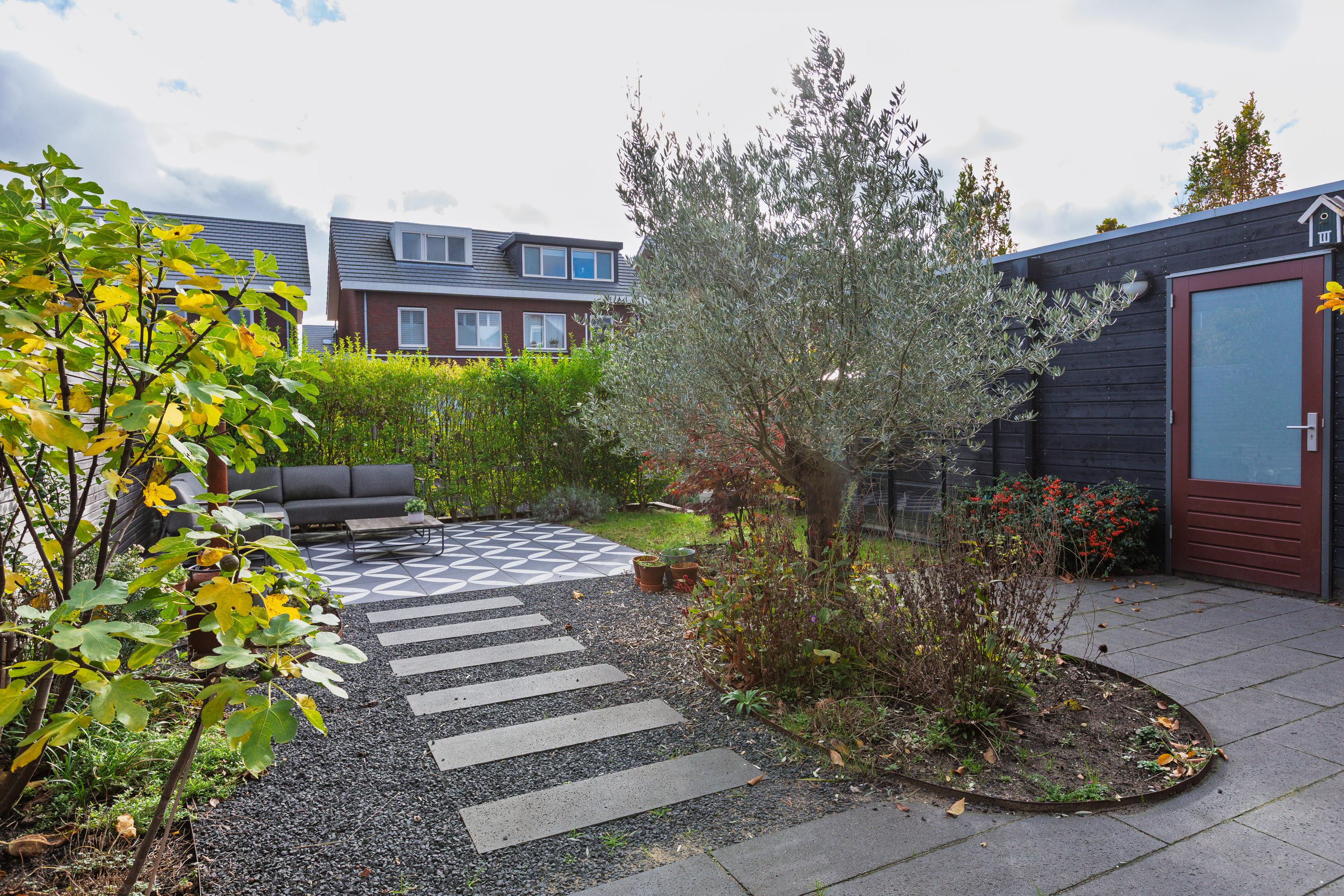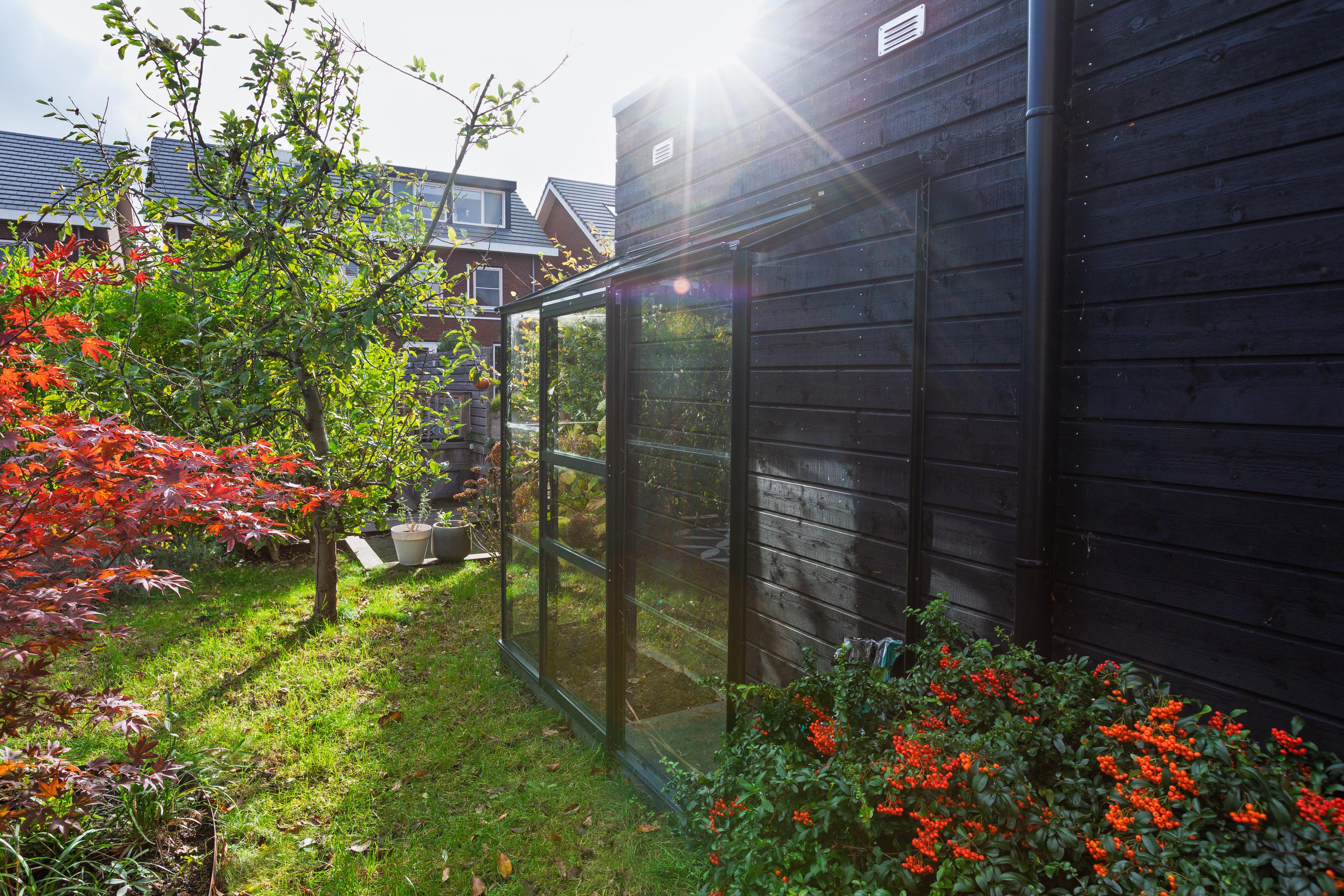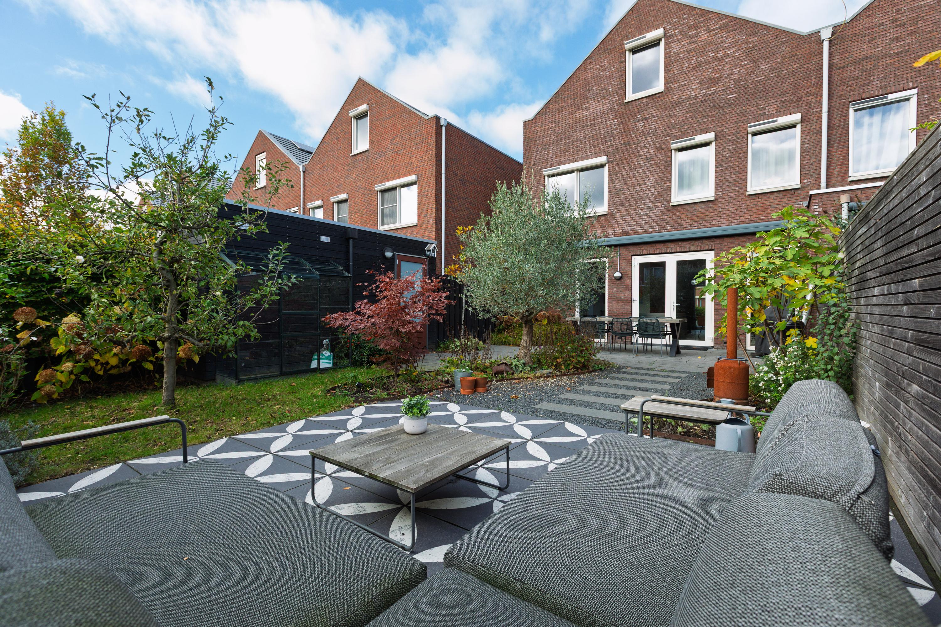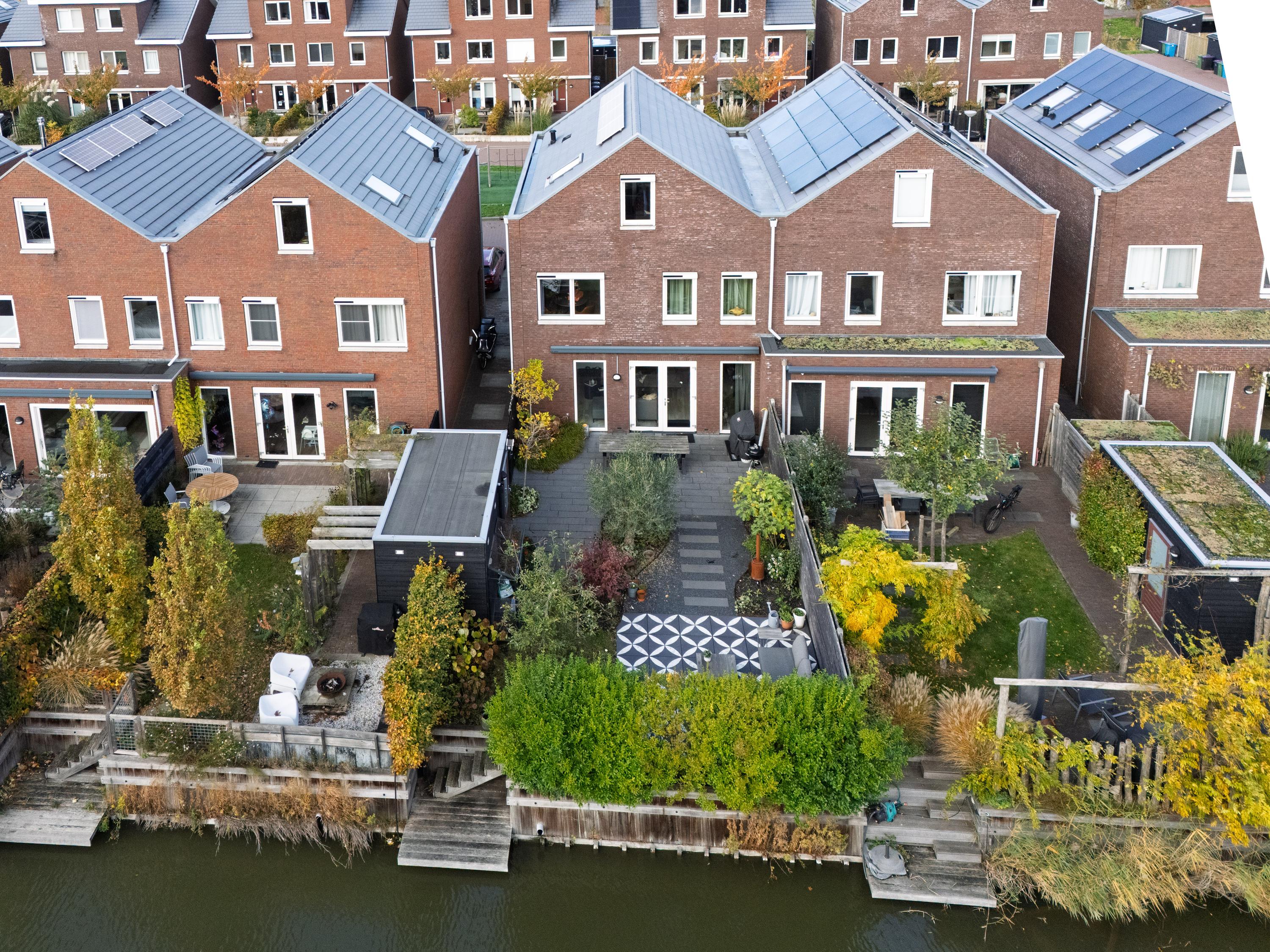 At the rear is the living area with a view of the beautifully landscaped garden. The living room is wide and offers enough space for a spacious sitting area. The sunny south-facing back garden has a large terrace, a greenhouse, a wooden shed and a jetty on the water. In summer, you can step right from your own garden onto your SUP board! The garden is also accessible via a back entrance along the house.