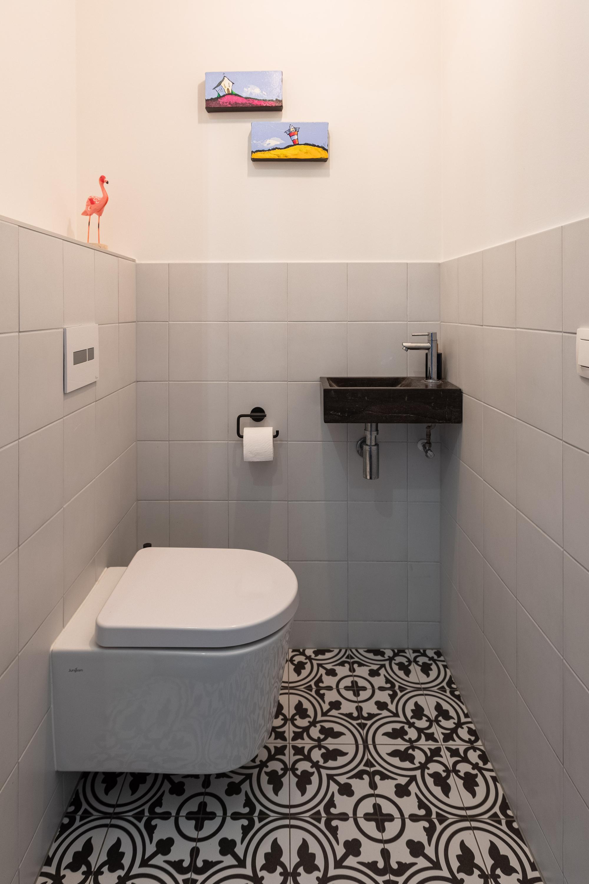 Entrance to the house with hall, meter cupboard, a practical walk-in cupboard and a luxurious toilet with wall-mounted toilet and washbasin.