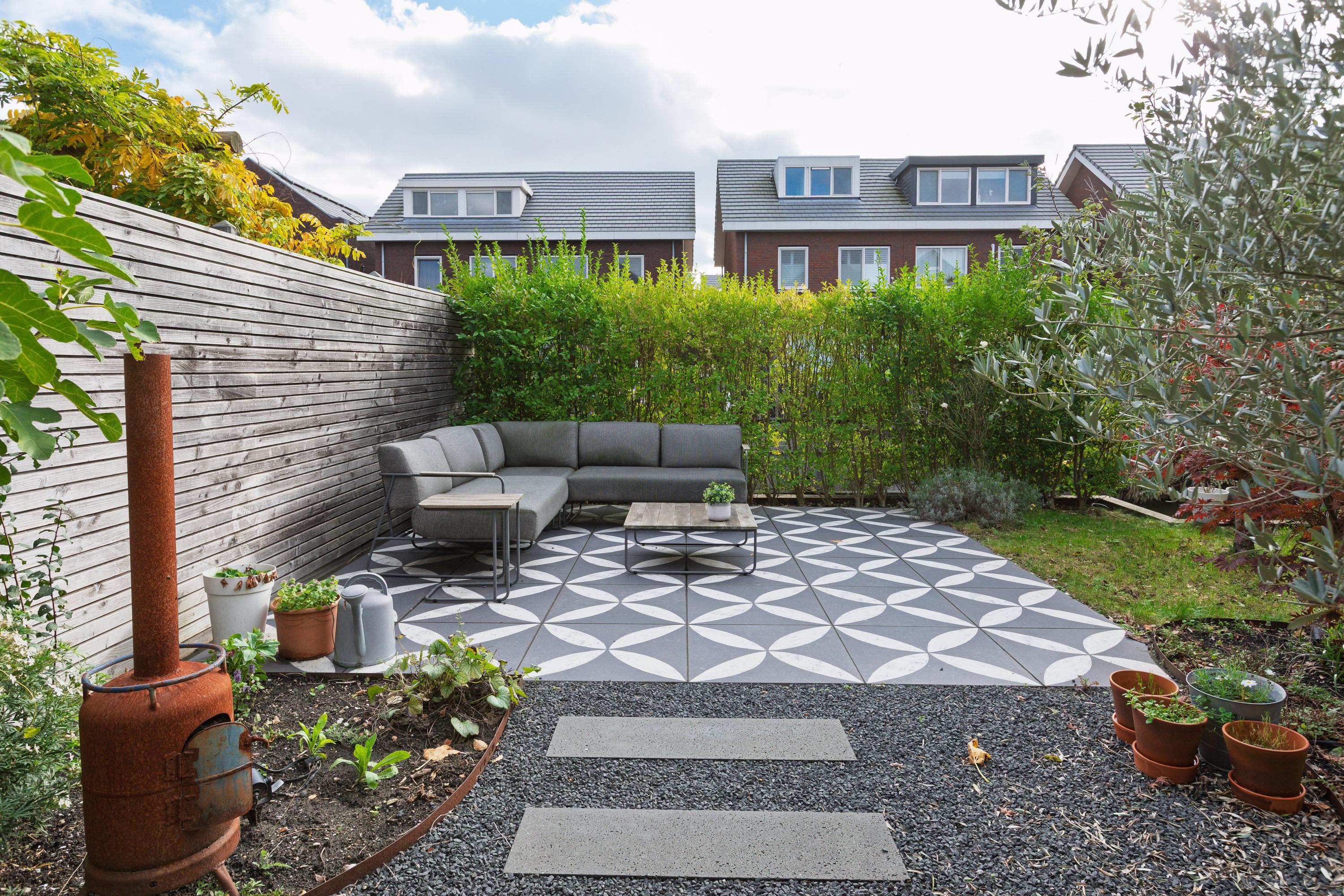 Spacious, well-maintained front garden with parking, greenery and a cosy terrace.