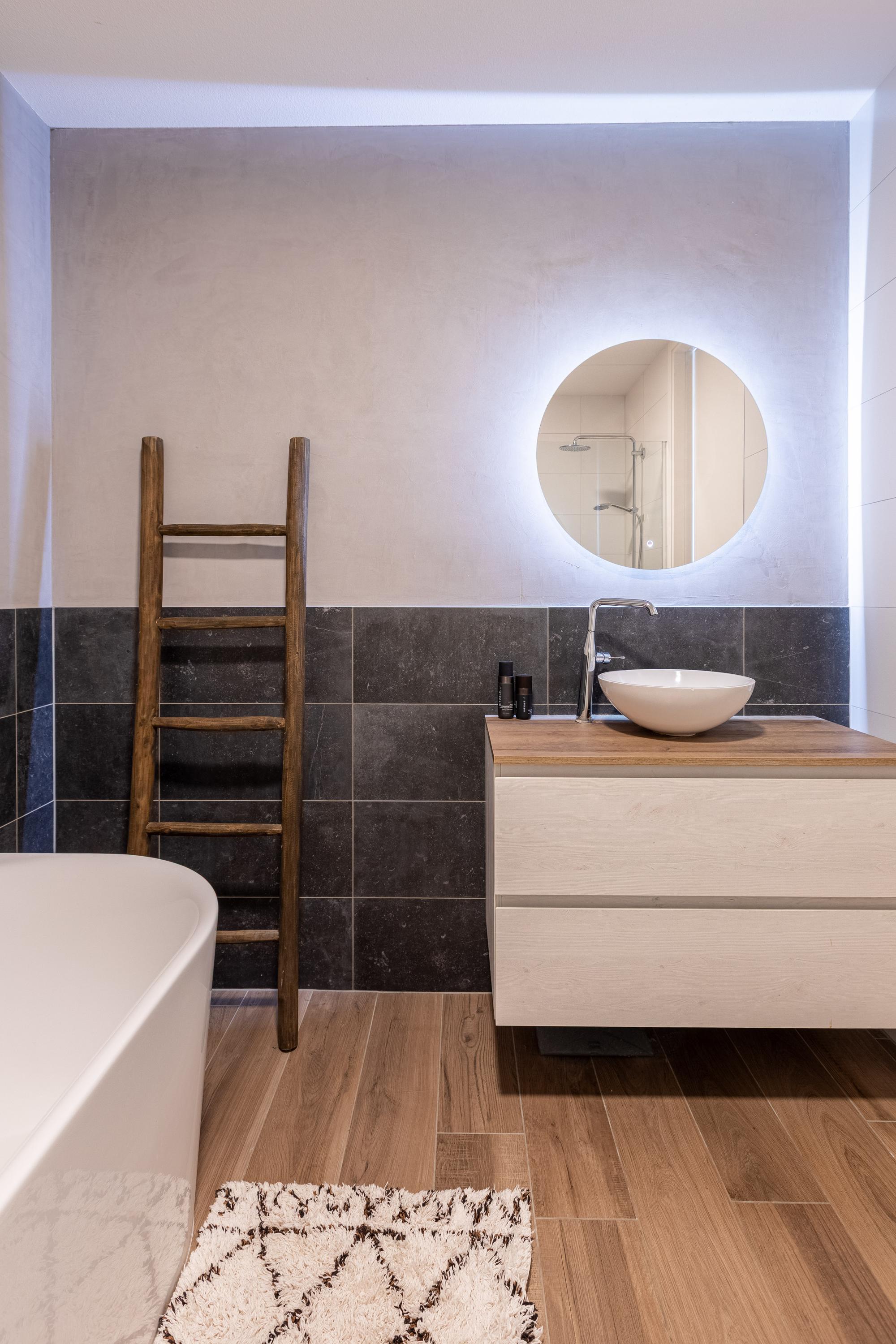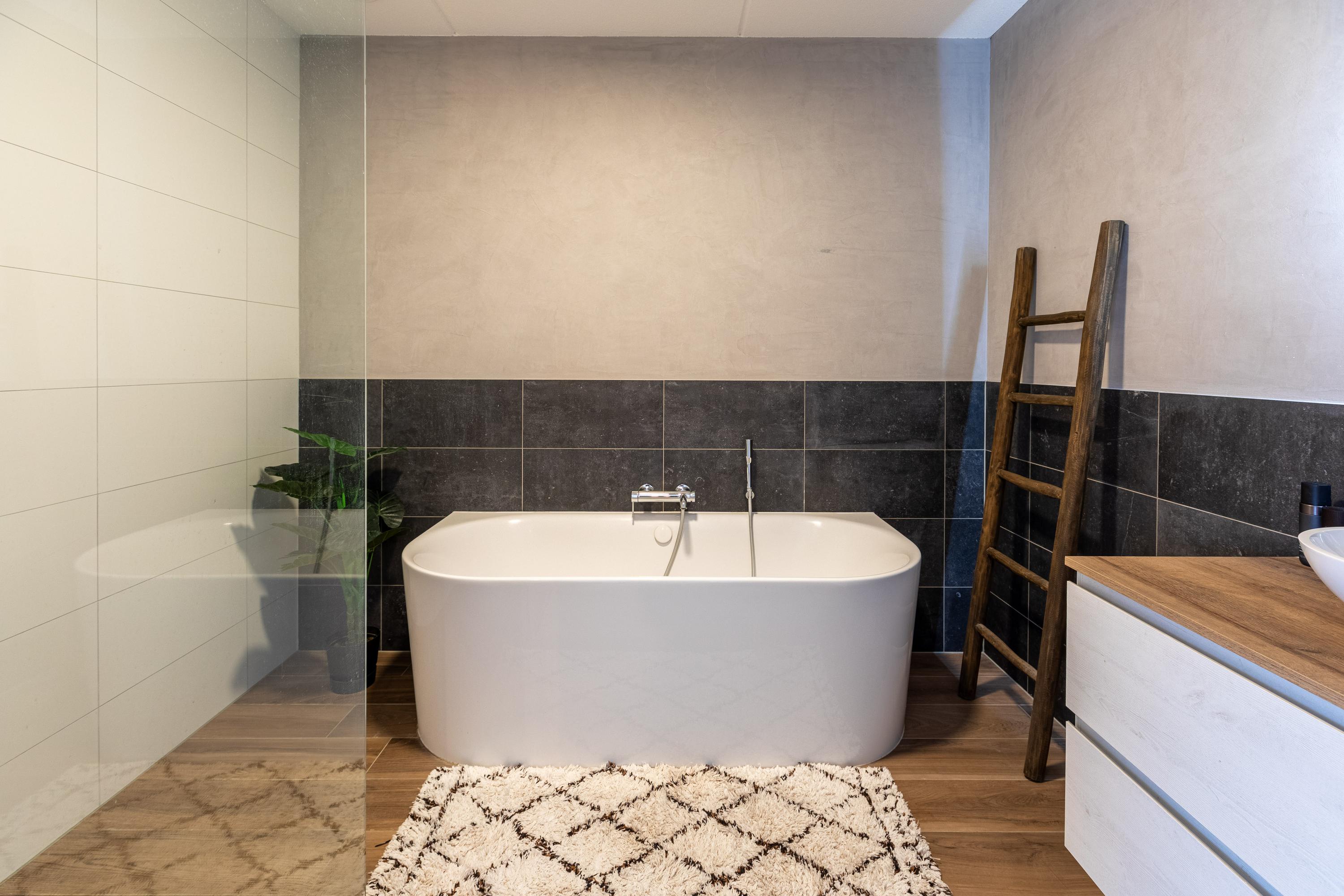 There are two spacious rooms at the rear, while two more bedrooms are located at the front. In the middle is the luxurious bathroom with a walk-in shower, bathtub, double sink and designer radiator. There is also a separate second toilet on this floor.