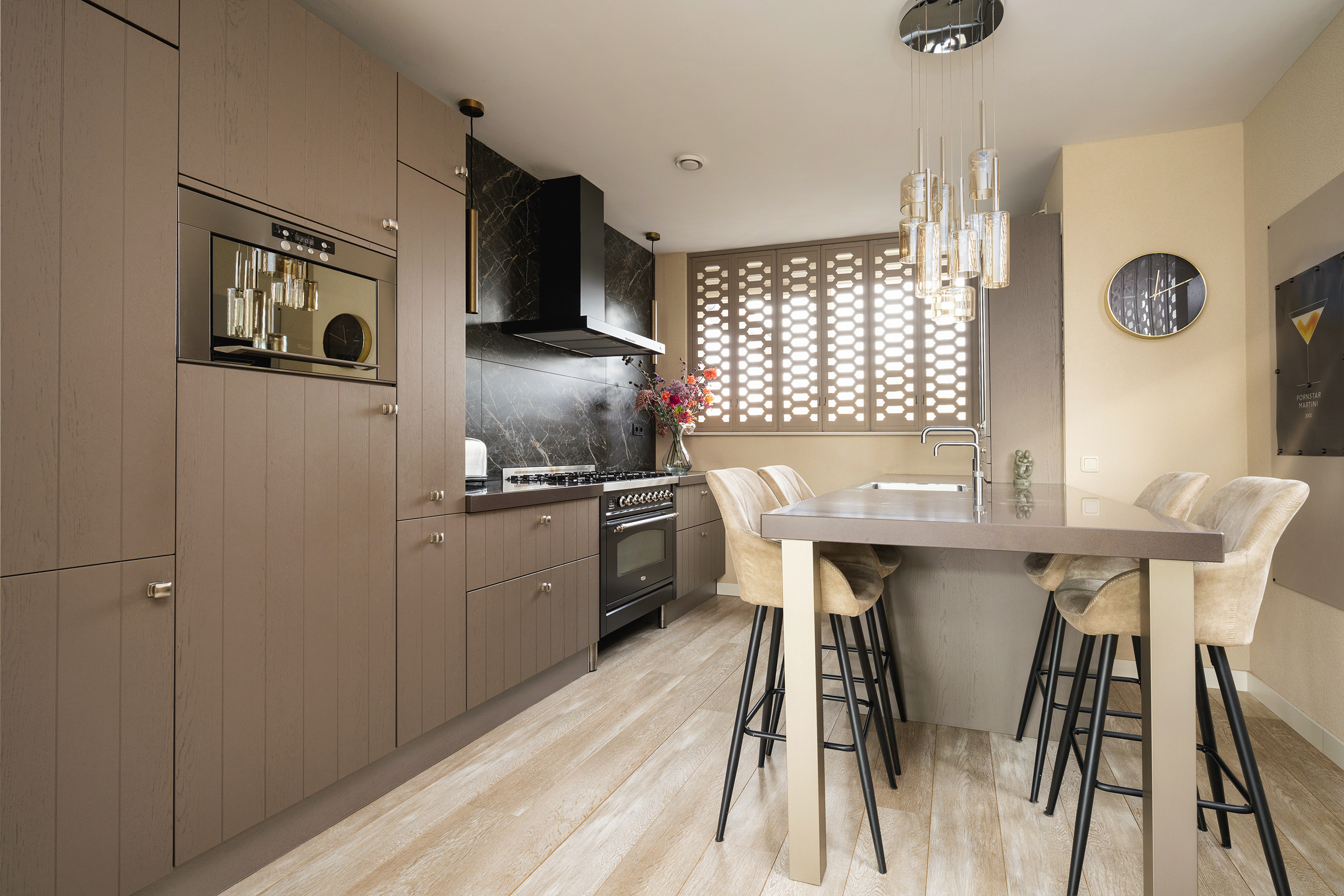 Entrance via the hall with meter cupboard, wardrobe, toilet, and staircase. From the hall you reach the spacious and bright living room at the rear, with a beautiful view of the garden and the water. The living room is connected to the dining room and the open kitchen at the front. The kitchen is luxuriously equipped with an extra-large refrigerator and freezer and a Boretti stove with a large oven – a dream for cooking enthusiasts. The bar with 4 stools is ideal for breakfast or for use with guests while cooking.