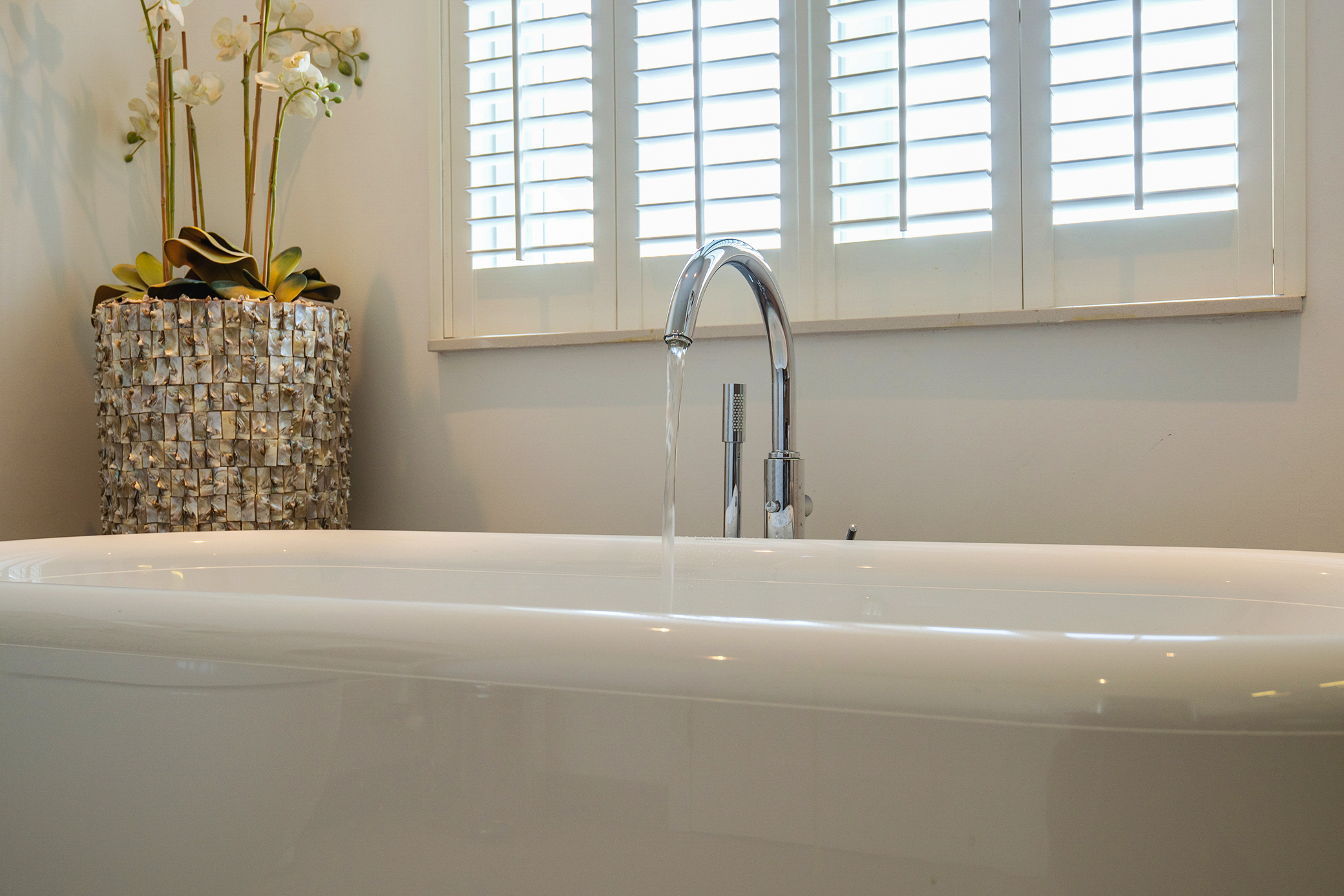 Landing with access to 2 bedrooms, one of which is a very spacious (master) bedroom at the rear with French balconies and a view of the water. The bathroom is luxuriously finished and equipped with a freestanding bathtub, a spacious double shower with steam cabin function, and an oak vanity with double sinks. Opposite the bathroom is a spacious walk-in closet.