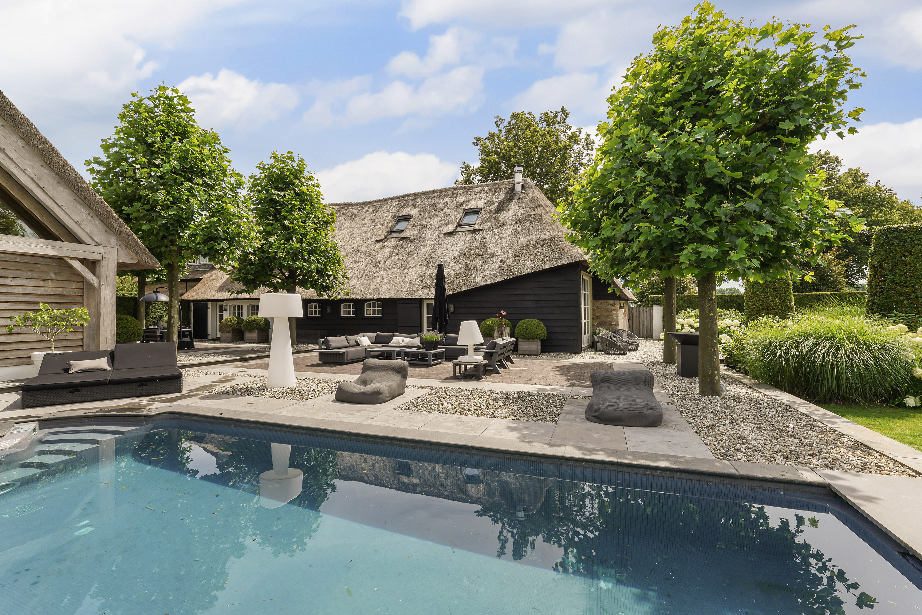 The “Handmade by Rasenberg” guesthouse is a true gem, with a spacious living area, a four-person sauna, a pantry kitchen, and an open fireplace. The guesthouse is beautifully insulated and features large sliding doors, allowing natural light to flood the space. A steel spiral staircase leads to the study and private bedroom on the upper floor. The high-quality thatched roof complements the farmhouse, creating a harmonious and luxurious atmosphere.