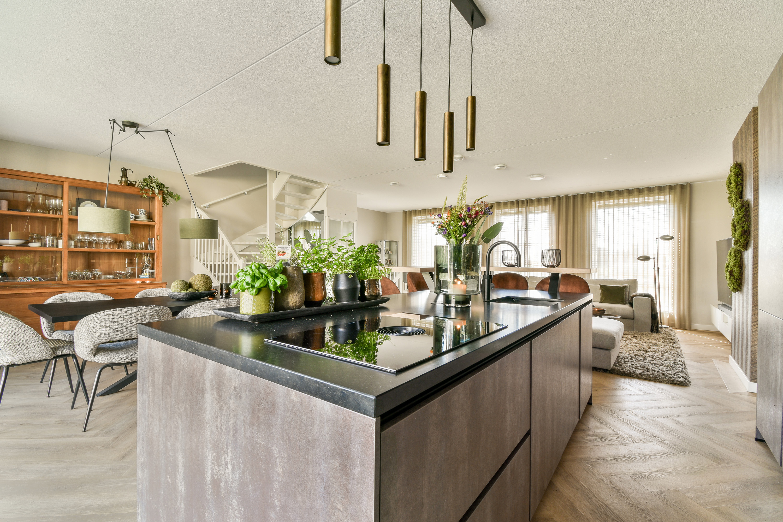 * First Floor: A spacious and stylish living room with open-concept luxury kitchen and cooking island, plus a private terrace.