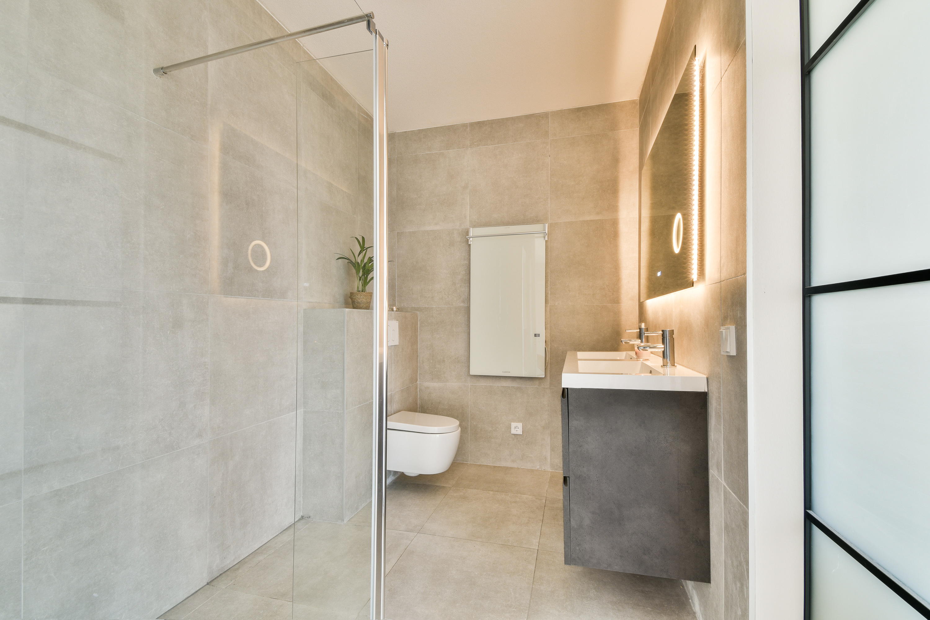 * Large walk-in shower with thermostat controls