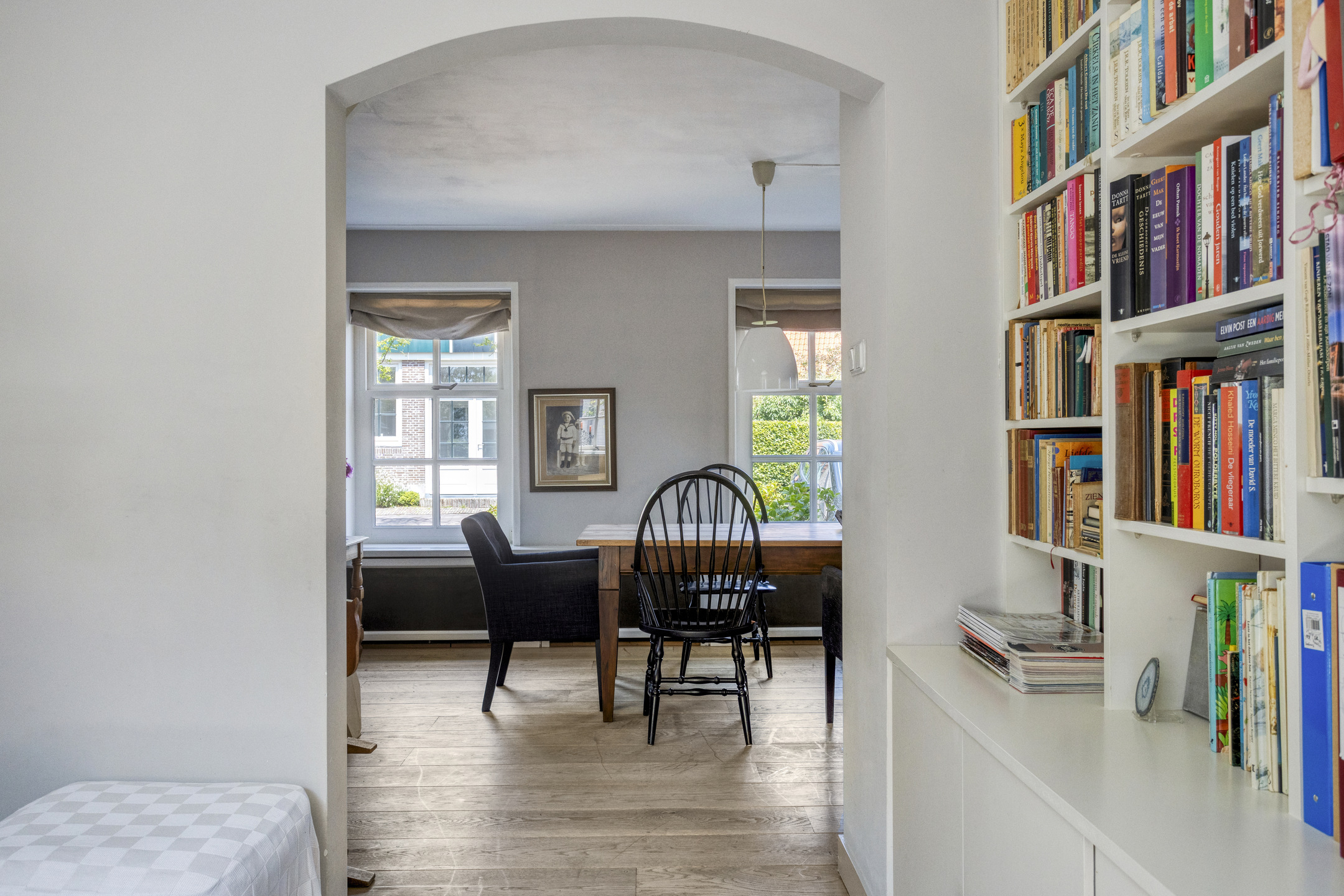 Through the front door, you enter a hallway that leads to the front house. At the front is the semi-open kitchen, equipped with a 5-burner gas hob, oven, dishwasher, and a freestanding fridge-freezer. Adjacent to the kitchen is the cozy dining room with beautiful light from the large windows, forming the warm heart of the home. Next to the dining room is a comfortable living room, which can easily switch functions with the dining room if desired. From the dining room, a staircase also leads to the first floor of the front part of the house.