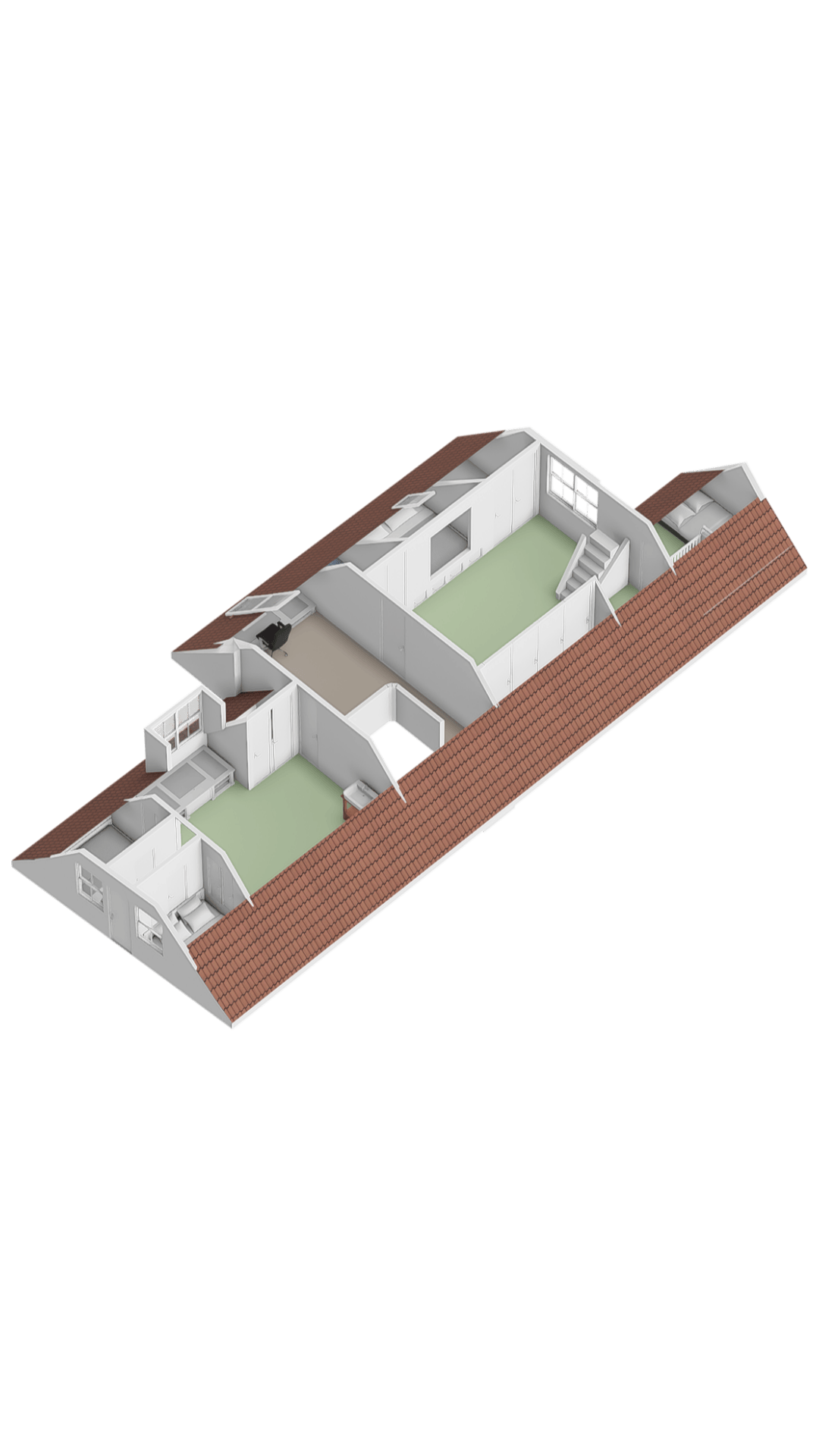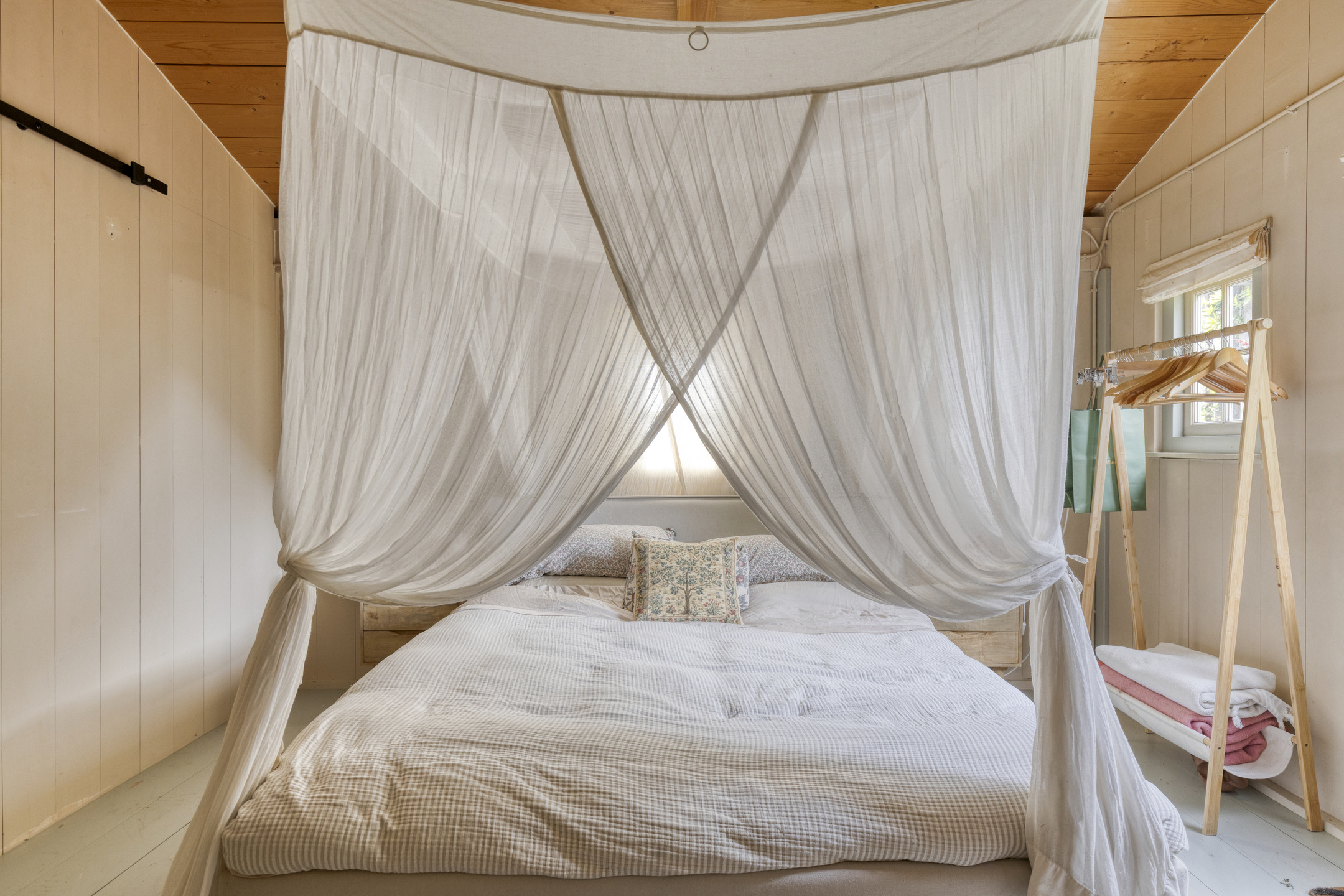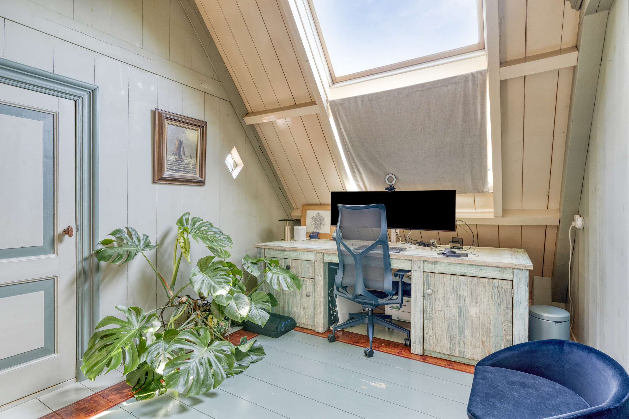 The staircase from the living room leads to a bright landing with skylights, currently used as a comfortable home office. From here, two spacious bedrooms are accessible. The front bedroom features built-in wardrobes, two traditional sleeping alcoves, a washbasin and access to a storage loft. The rear bedroom also has built-in wardrobes, a sleeping alcove, a washbasin and a third toilet. An additional adjoining room is ideal as a playroom or extra storage. A fixed staircase leads to the spacious attic, offering ample storage.