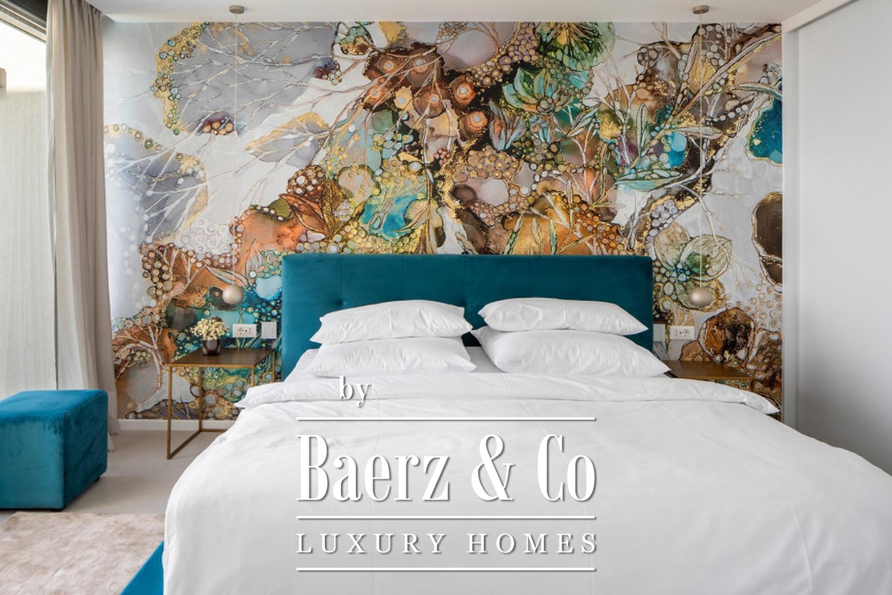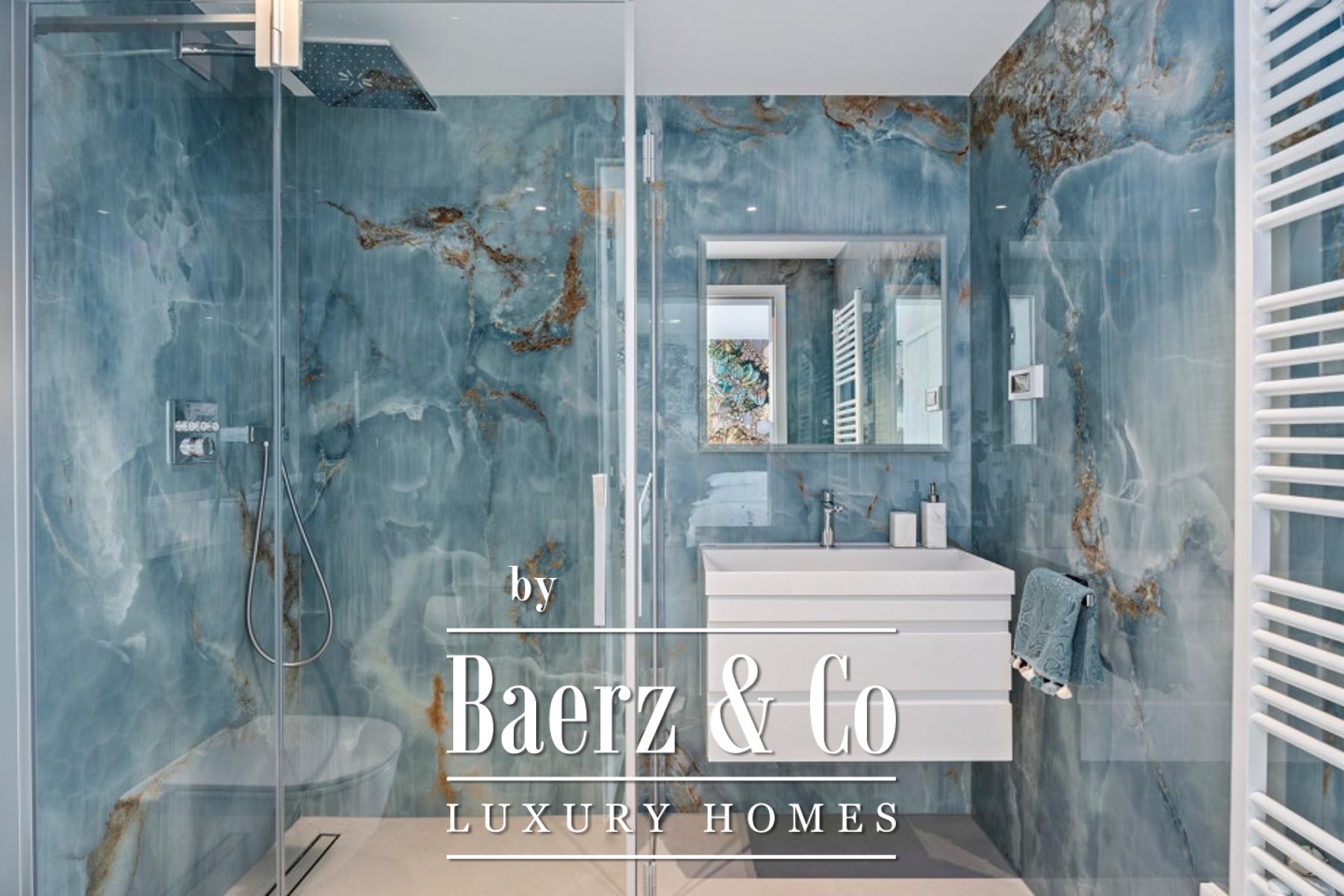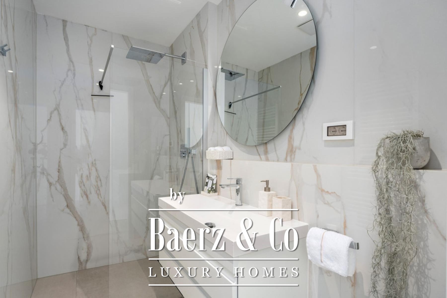 Three bedrooms, two bathrooms, and an additional guest toilet emphasize functional elegance. The upper floor reveals generous ceiling heights and panoramic sea views from the living area, creating an uplifting sense of space. Throughout, smart home technology is integrated alongside underfloor heating, air conditioning, and electrically operated roller shutters. Two dedicated parking spaces provide convenience.