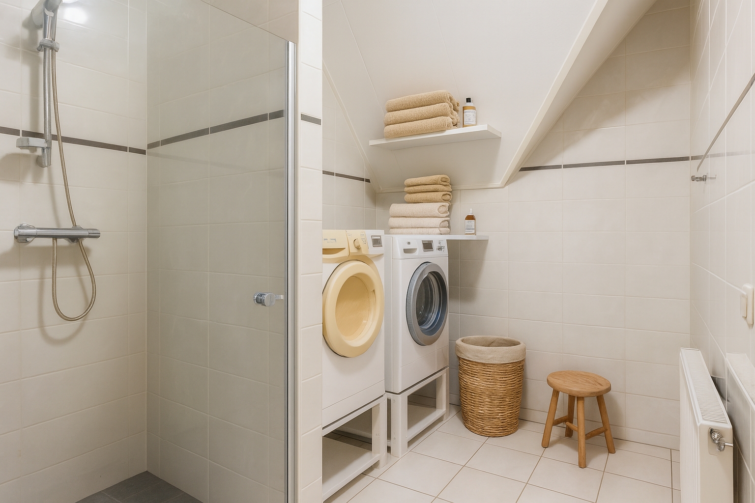 The second bedroom also has access to a balcony and features a walk-in wardrobe. The adjacent second bathroom is fitted with a walk-in shower and additional space for a washing machine and dryer. This bathroom is accessible both from the hallway and from the bedroom.
