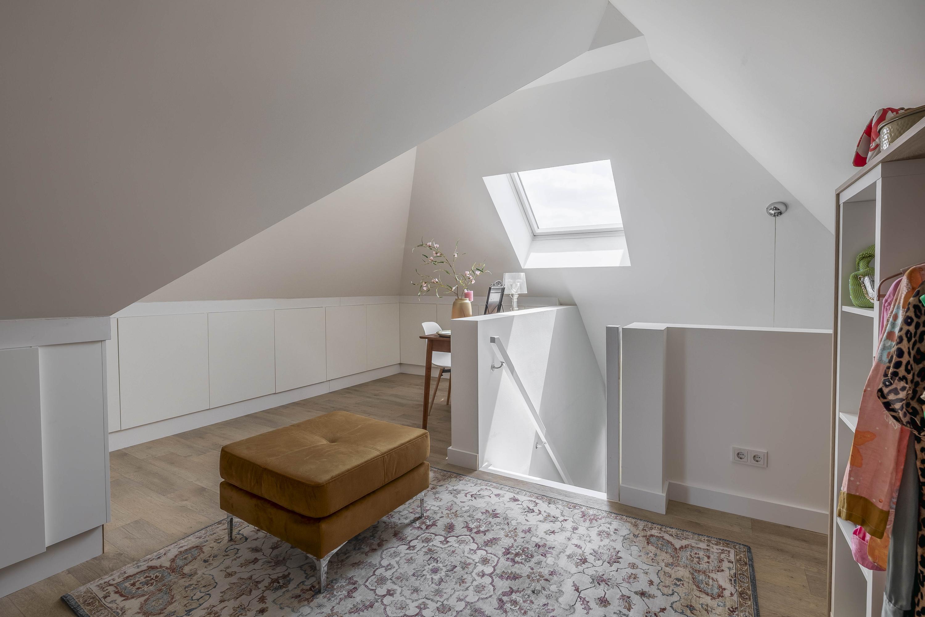 The attic floor is accessible from both the landing and the master bedroom. The floor has vinyl flooring, three Velux skylights and consists of two spacious, multifunctional areas with plenty of storage space under the slope of the roof. Ideal as a dressing room, work or hobby room.