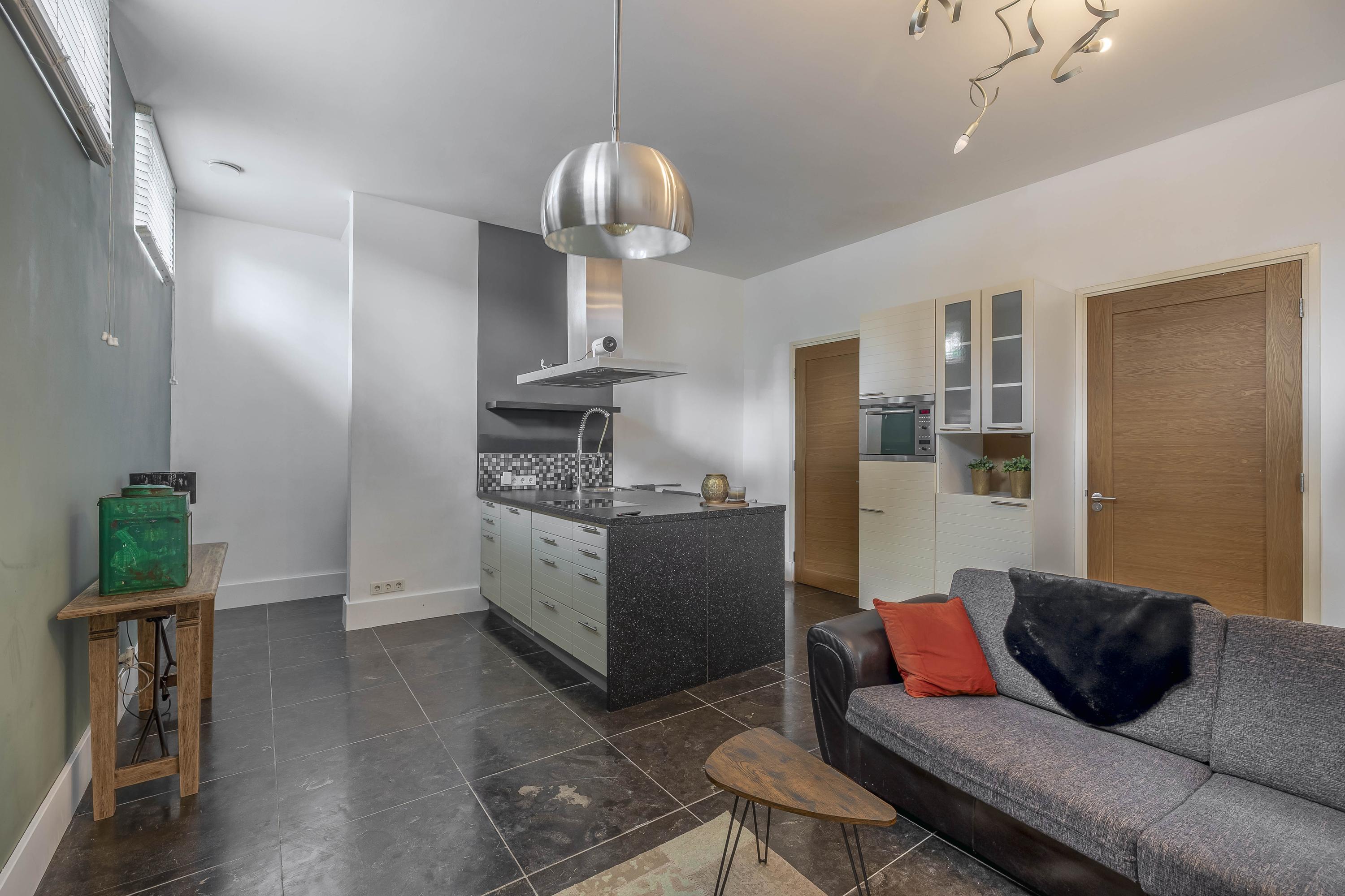 You enter this space in a bright living room with open kitchen, where the impressive ceiling height of over 3 meters immediately stands out. The kitchen is modern and fully equipped with an induction hob, extractor hood, dishwasher, refrigerator and microwave oven. In a convenient niche behind the kitchen is the connection for the washing machine.