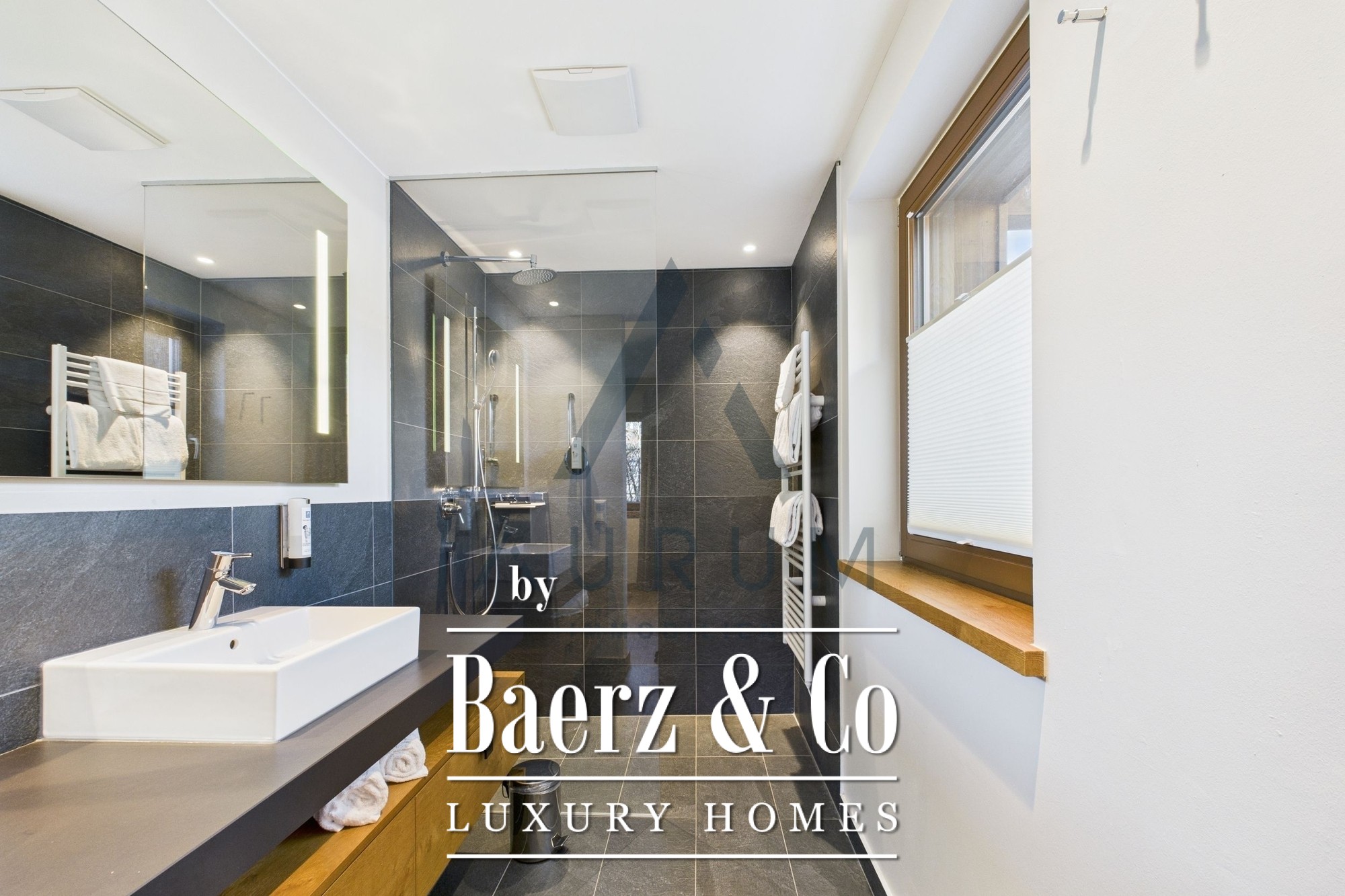 Upstairs, there are two further bedrooms, each with its own en-suite bathroom including shower, bathtub, and toilet. High-quality materials such as oak parquet flooring in the living areas and elegant porcelain stoneware in the bathrooms create a sophisticated yet cozy ambiance with alpine flair.