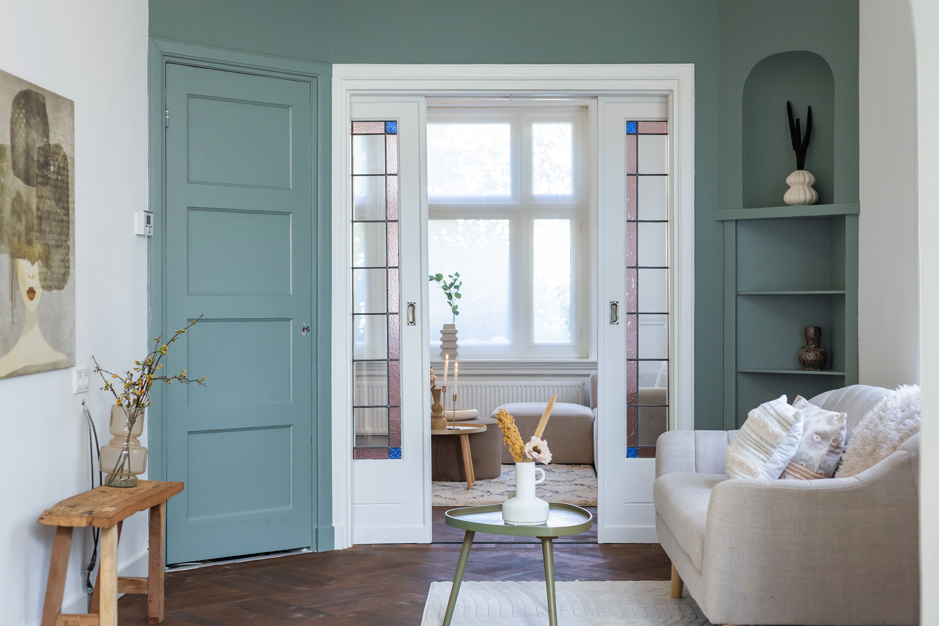 Inside, the atmosphere is warm, stylish and surprisingly spacious. The double front doors open onto a generous hallway with cloakroom space, access to the cellar and a modern toilet. From here you can reach both the kitchen-diner and the en-suite living rooms.
