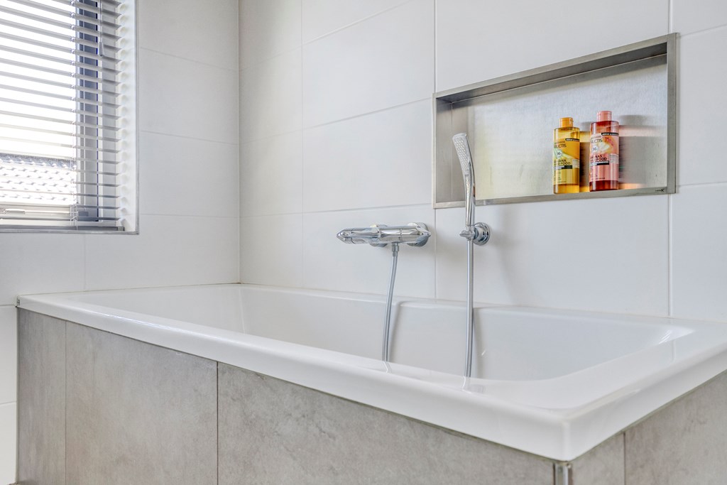 The bathroom is practical and stylish, fitted with a bathtub, walk-in shower, washbasin with mirror and storage unit, and a toilet. Fully tiled and neatly finished, it’s ready for immediate use.