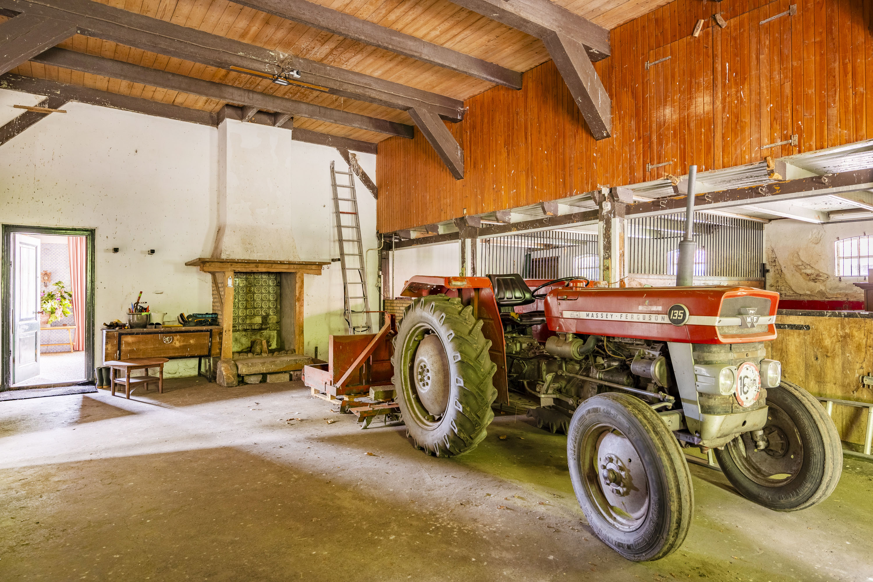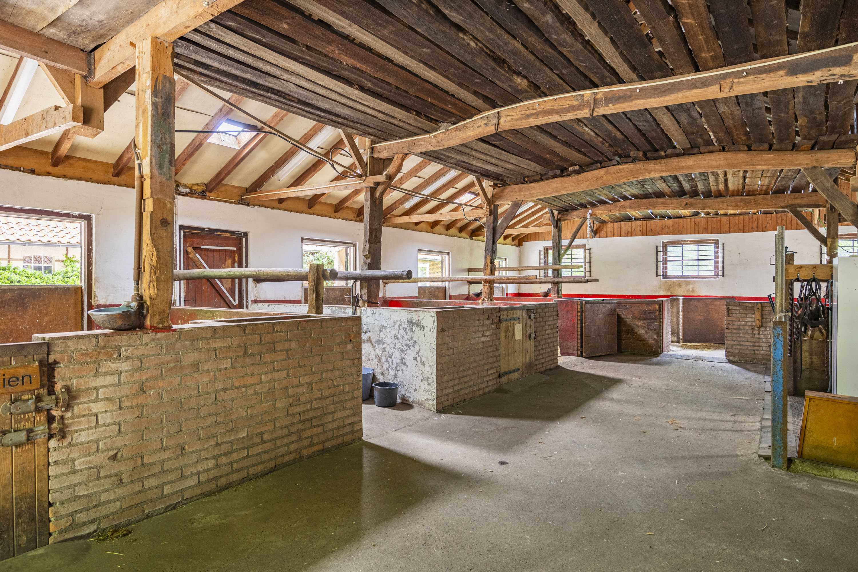 The back of the farmhouse remains structurally original, featuring beautiful wooden beams and a traditional stable door (the so called ‘niendeur’). Where cows once stood, there are now five horse stables, a tack room and additional facilities including an office, shower and laundry connections.