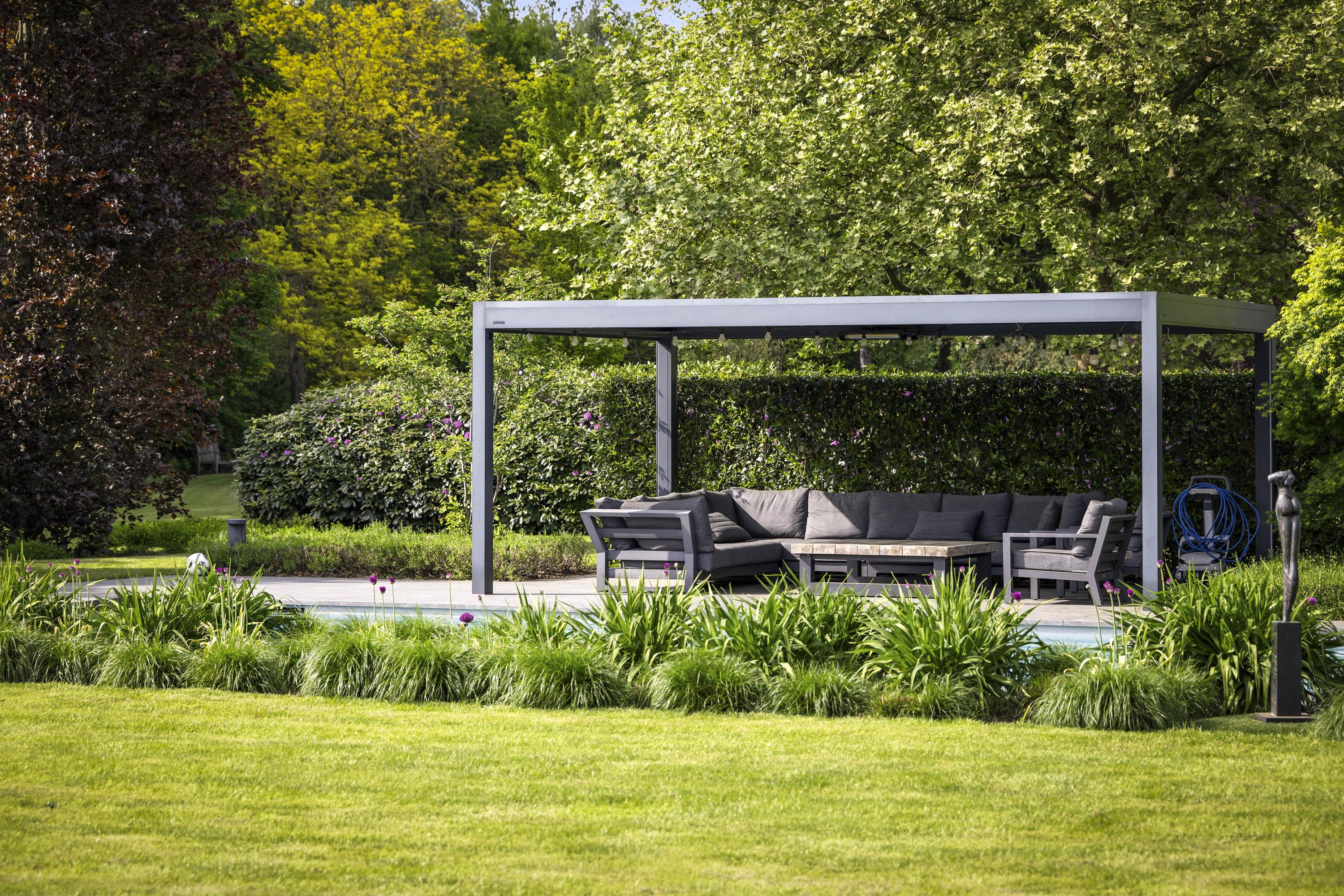 From the kitchen, there is access to a lovely sun terrace, which borders the heated swimming pool (5.40m x 11.70m) and surrounding terrace. Here you will find a canopy with sun loungers.