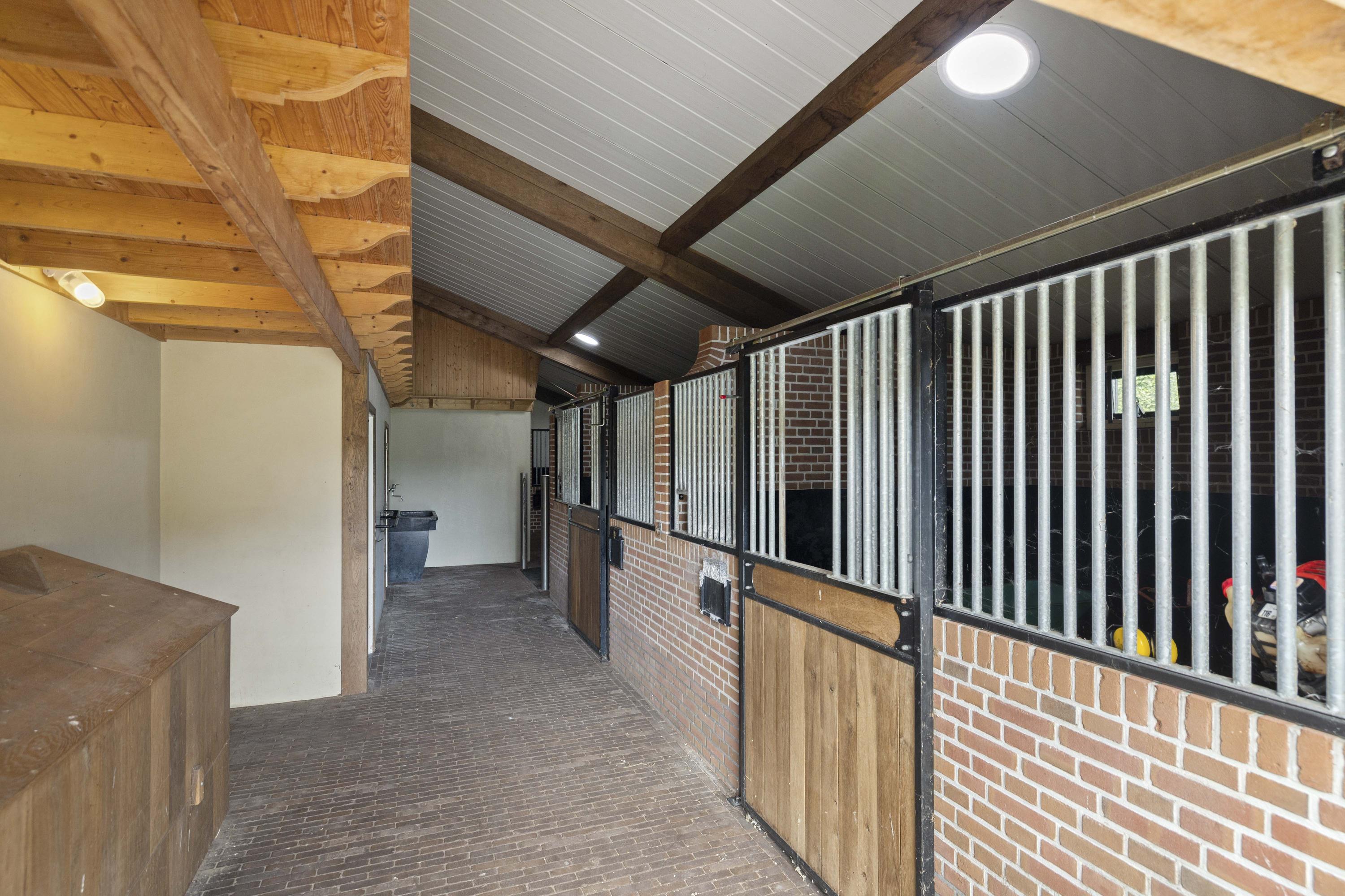 This country house is designed for keeping horses. The stable complex is therefore magnificent! At the front is the space for motorized horsepower: the large garage (56 m²) with double, electrically operated roller doors. From the garage, there is access to the spacious attic (30 m²).