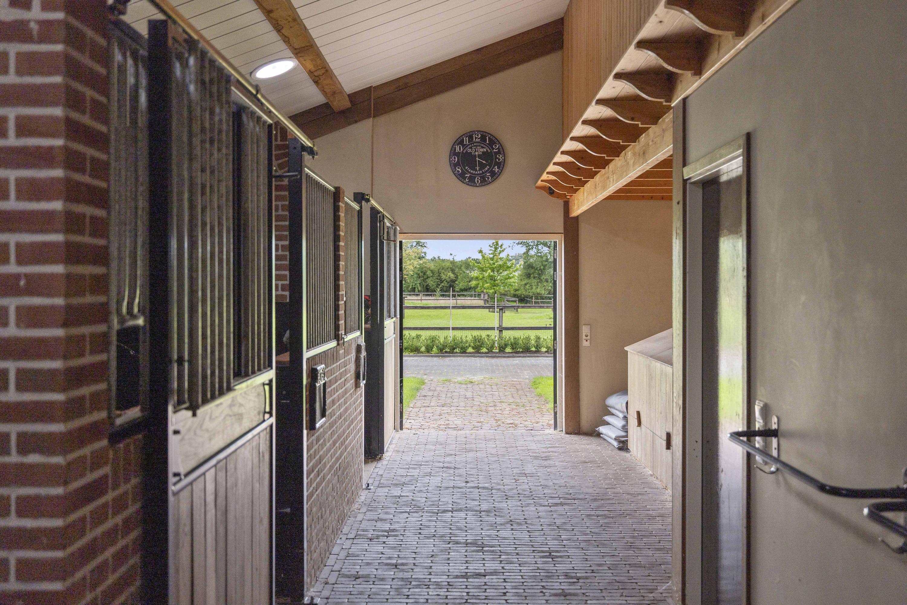 The stable complex has three large stalls, a wash area, and French doors to the paddock.