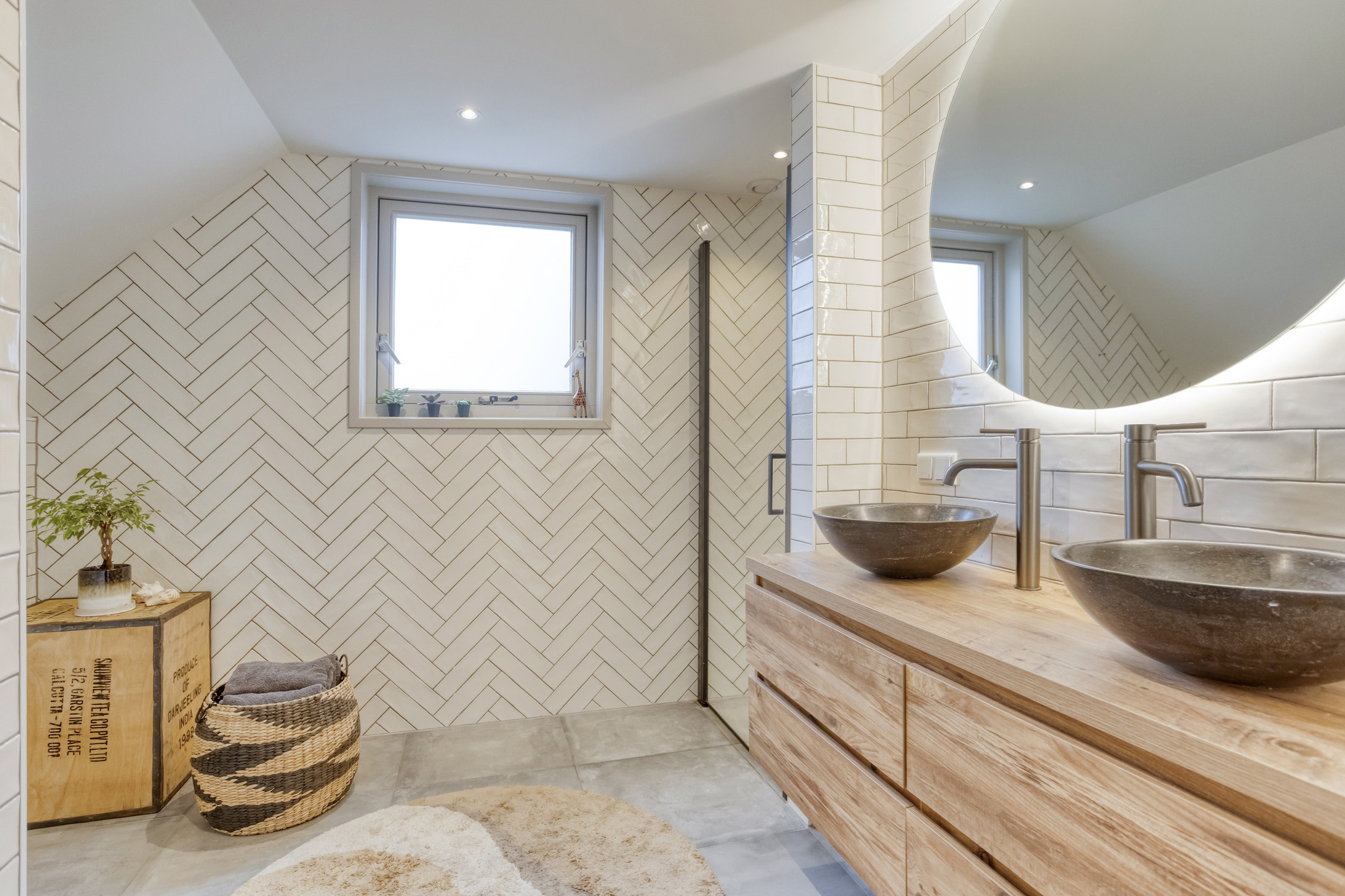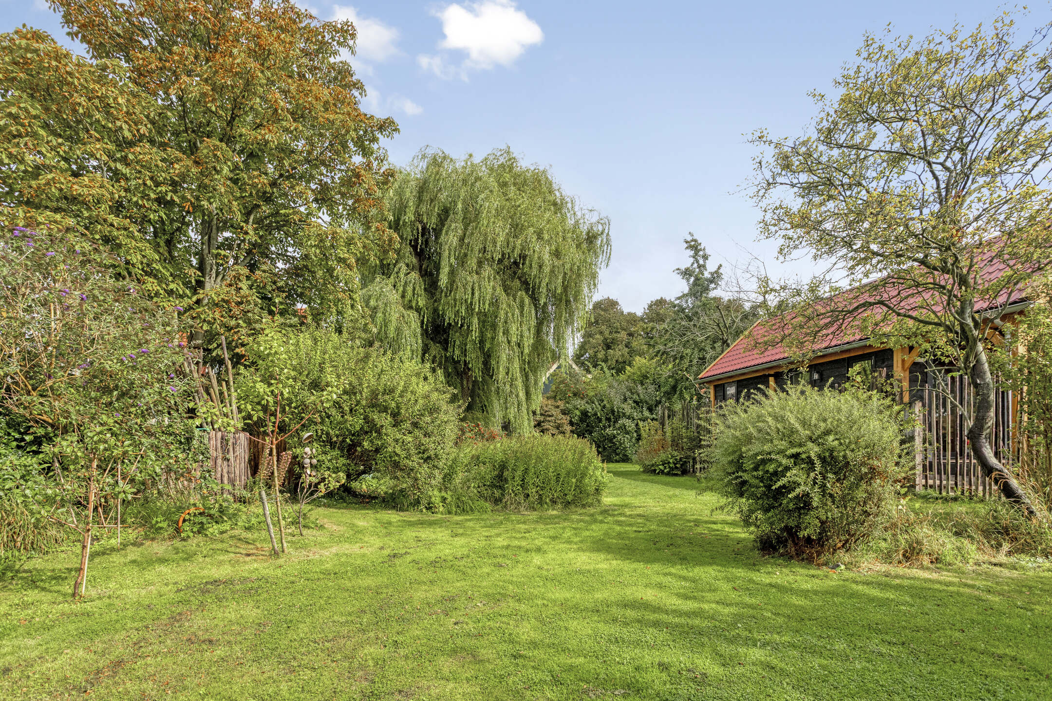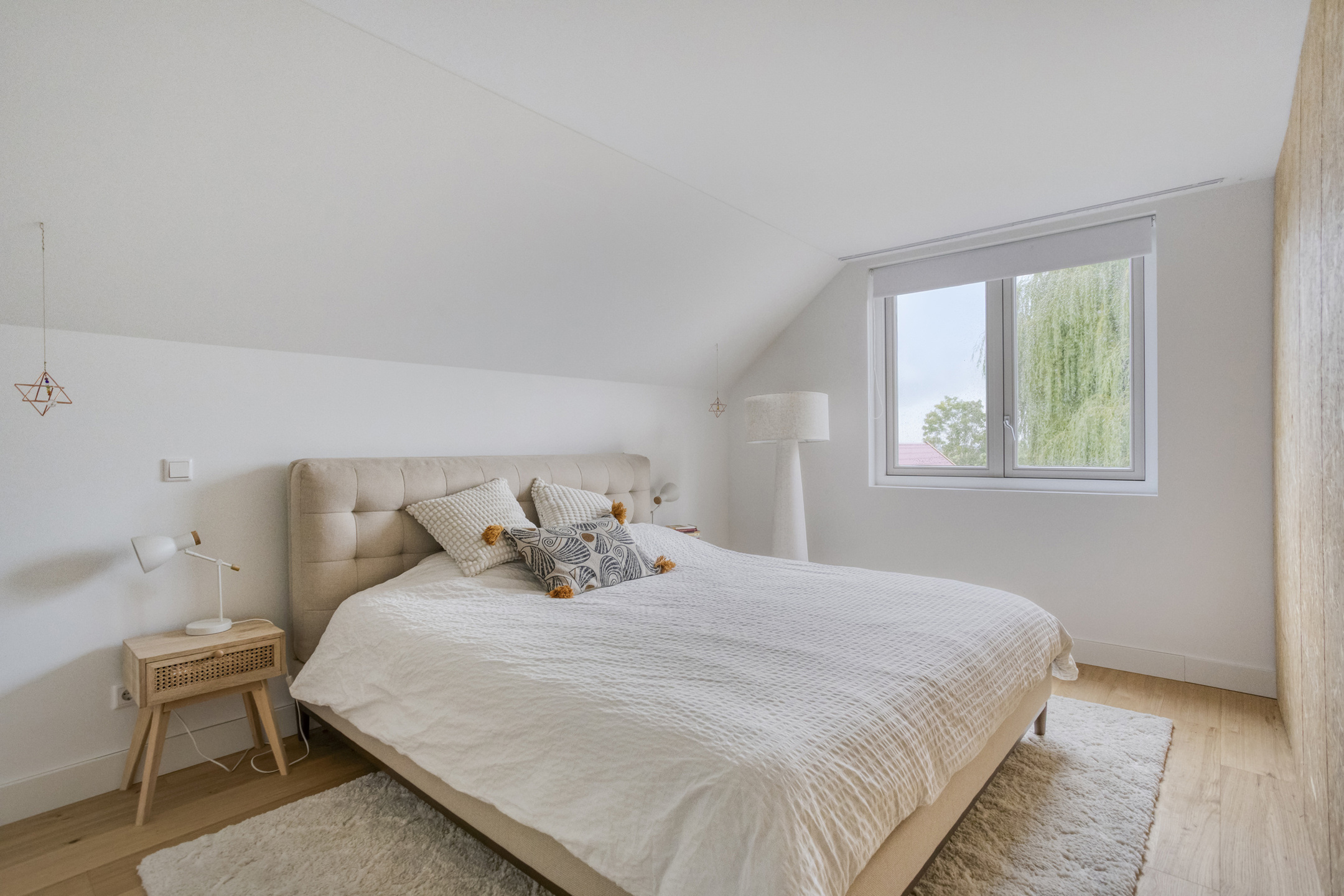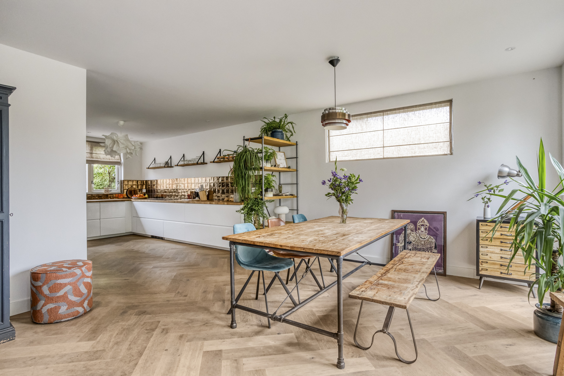 Bright and inviting, with French doors leading to the garden and a cozy wood-burning stove for winter nights. High ceilings and original exposed beams complete the picture. Part of the garage has been integrated into the living area, creating even more space! Planning an extension? The foundation is already in place.