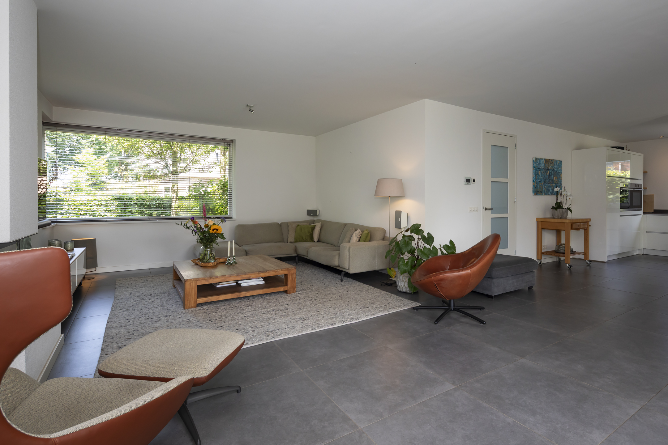 The dining area is also beautifully spacious. While seated at the table, you can enjoy the view of the beautiful garden. Double patio doors in the dining room open onto the generously sized covered terrace.