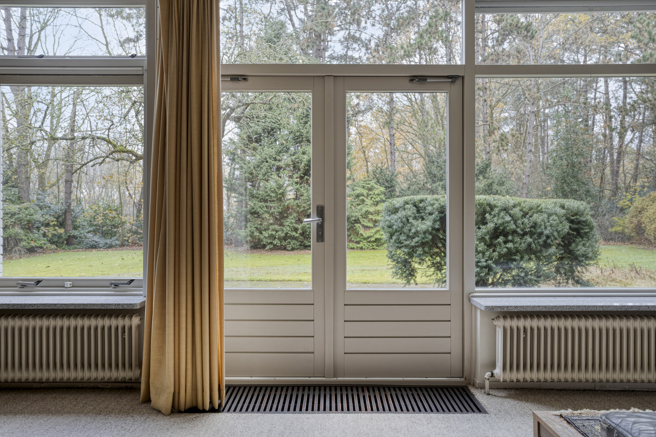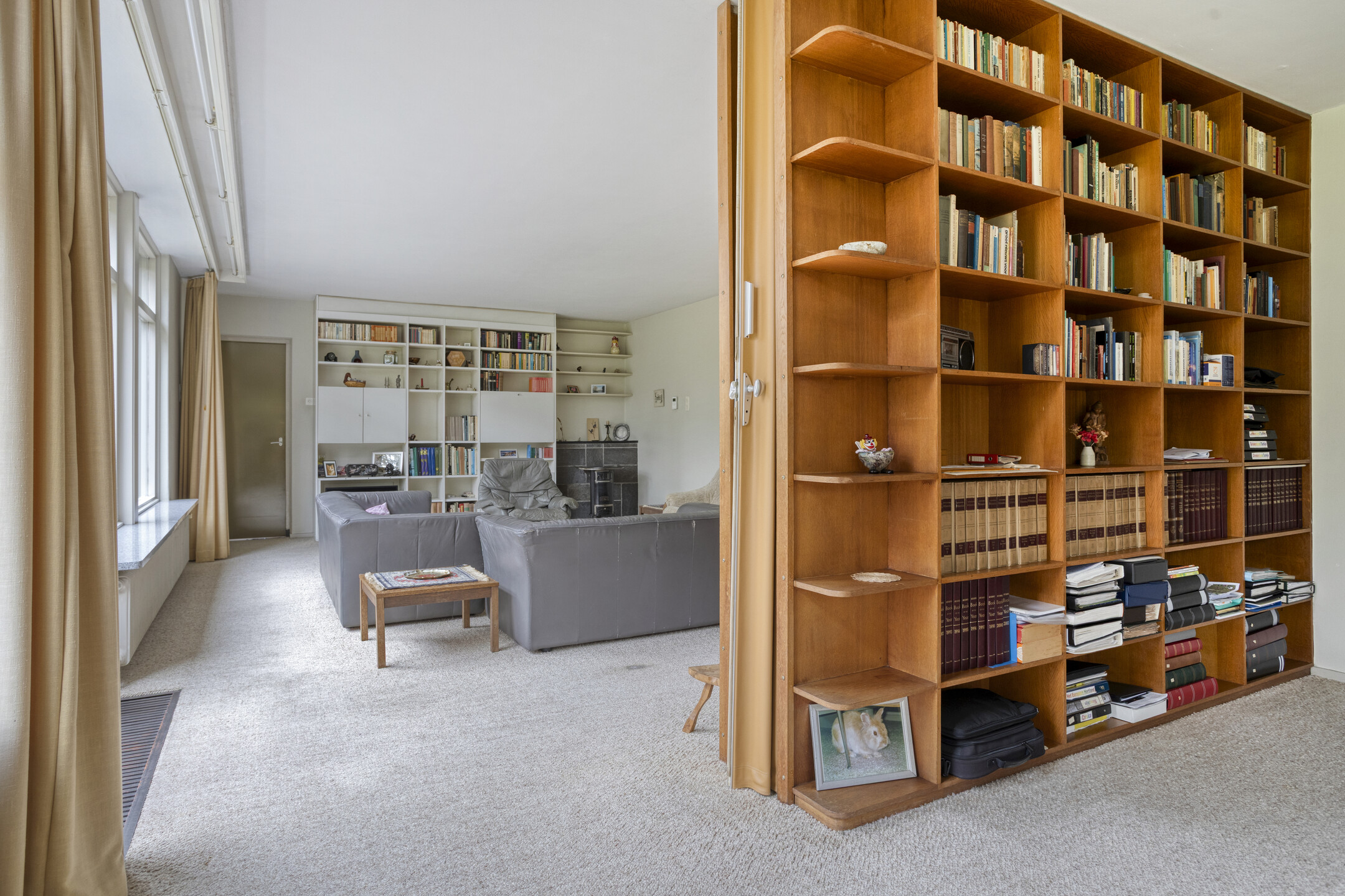 Living room with convector pit, stove connection and solar screens, plastered walls, carpeted floor, plastered ceiling, and door to the garden/terrace;