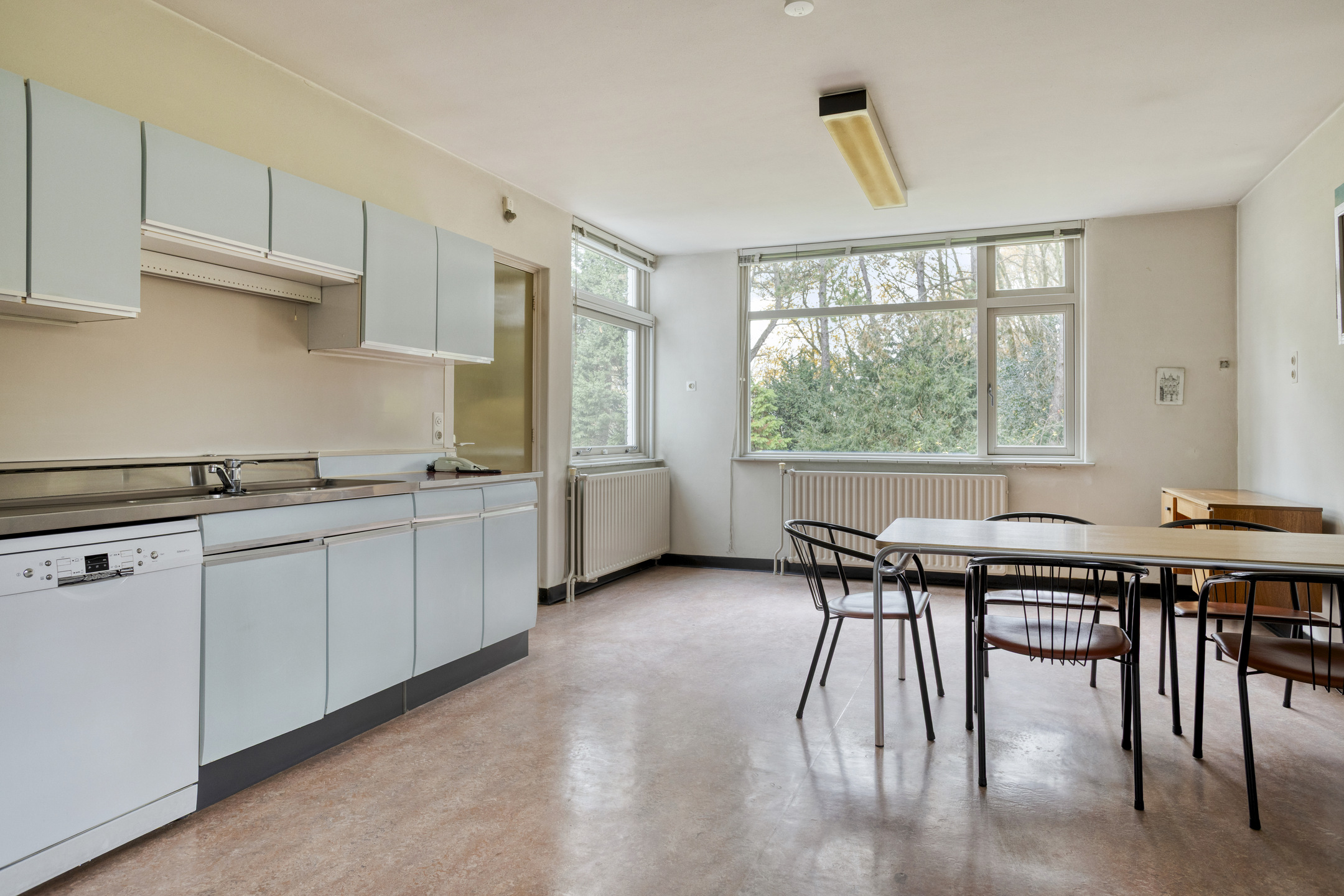 Enclosed kitchen with a linear fitted kitchen unit, featuring a synthetic worktop with double sink, dishwasher connection and extractor hood; plastered walls, linoleum flooring, plastered ceiling;