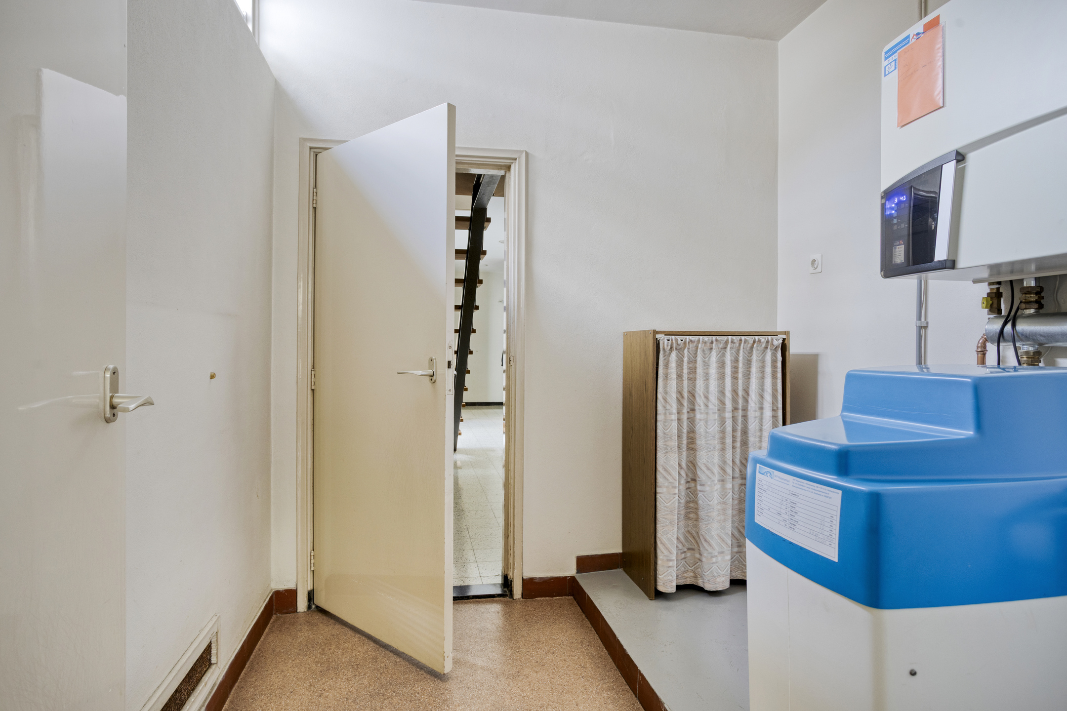Technical room with access to the crawl space, housing the HR high-efficiency combi boiler and water softener.