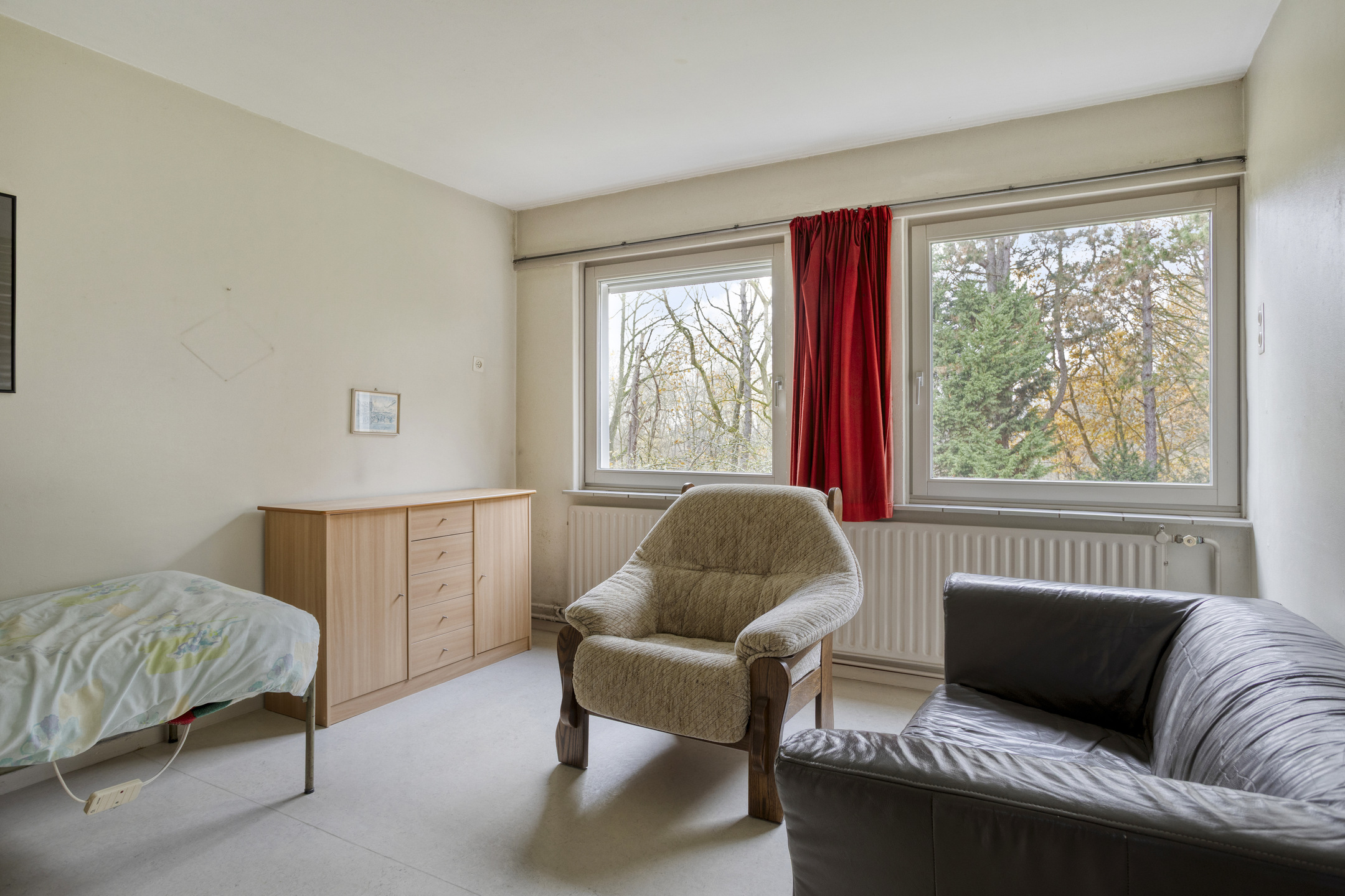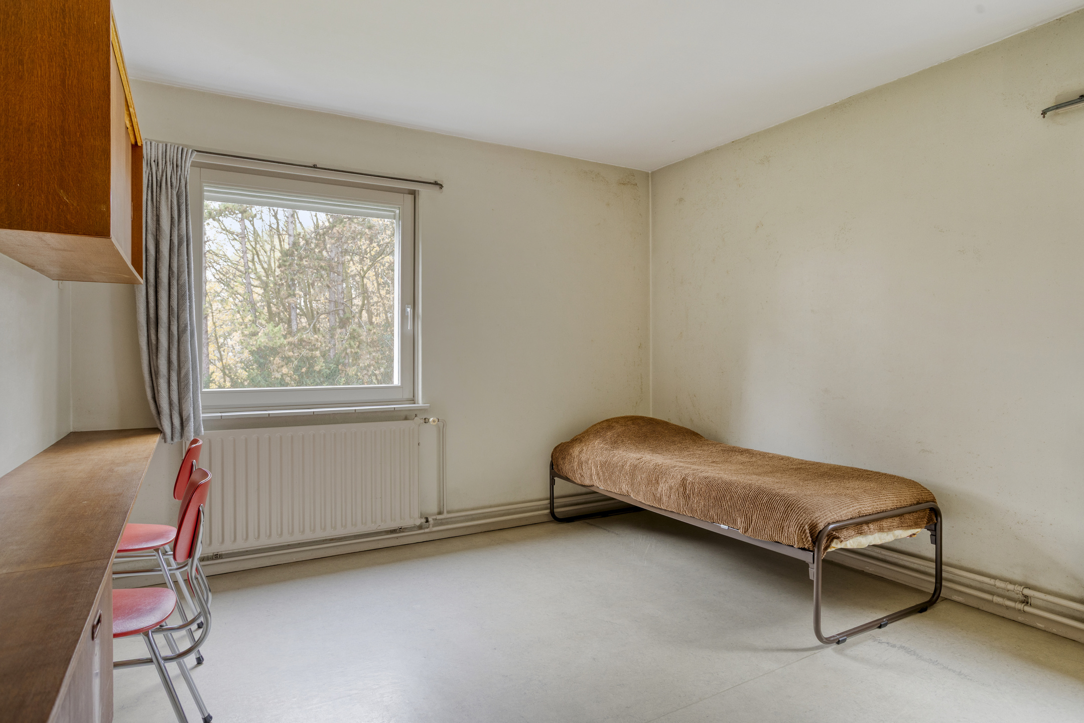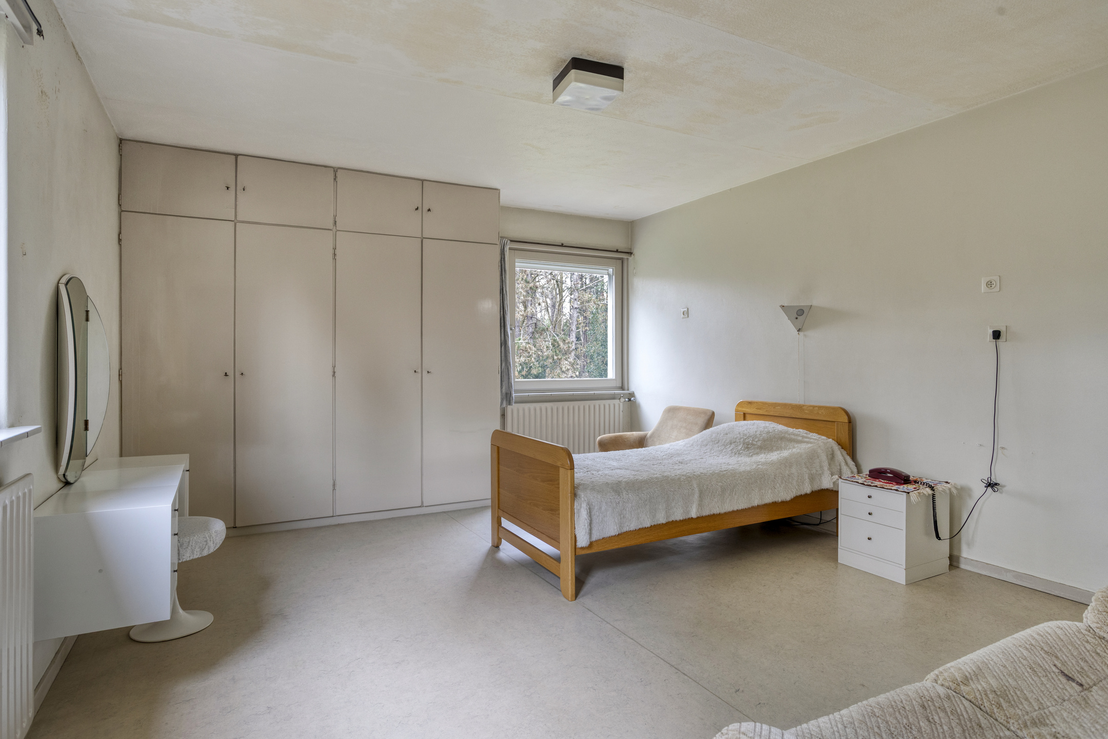 Rear middle bedroom with built-in wardrobe and washbasin connection (not in use), plastered walls, linoleum flooring, plastered ceiling;