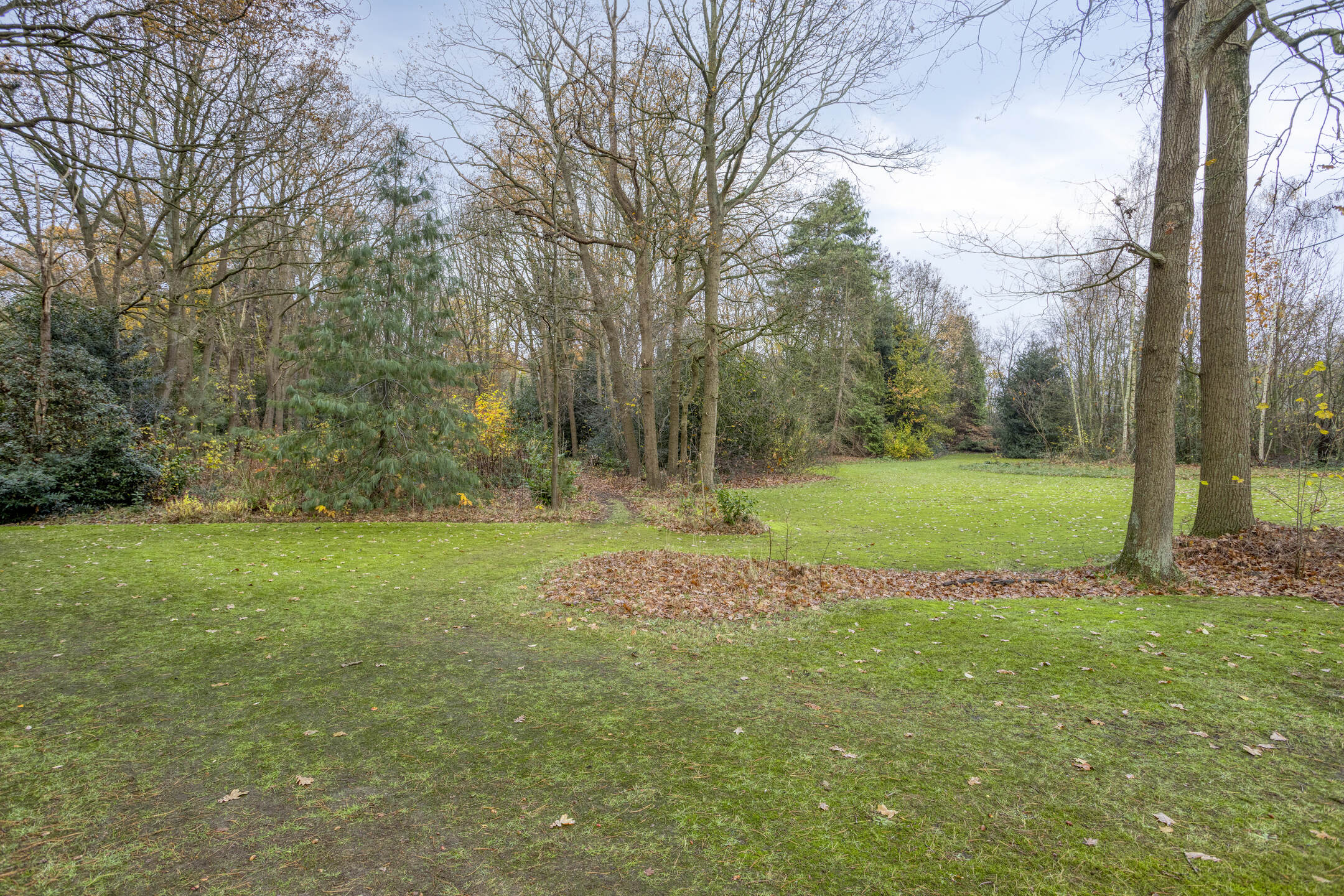 Park-like landscaped garden surrounded by woodland, paved terrace with decorative paving, borders, lawn and two wooden storage sheds;