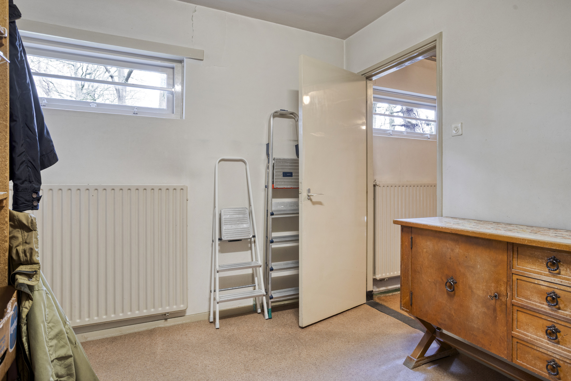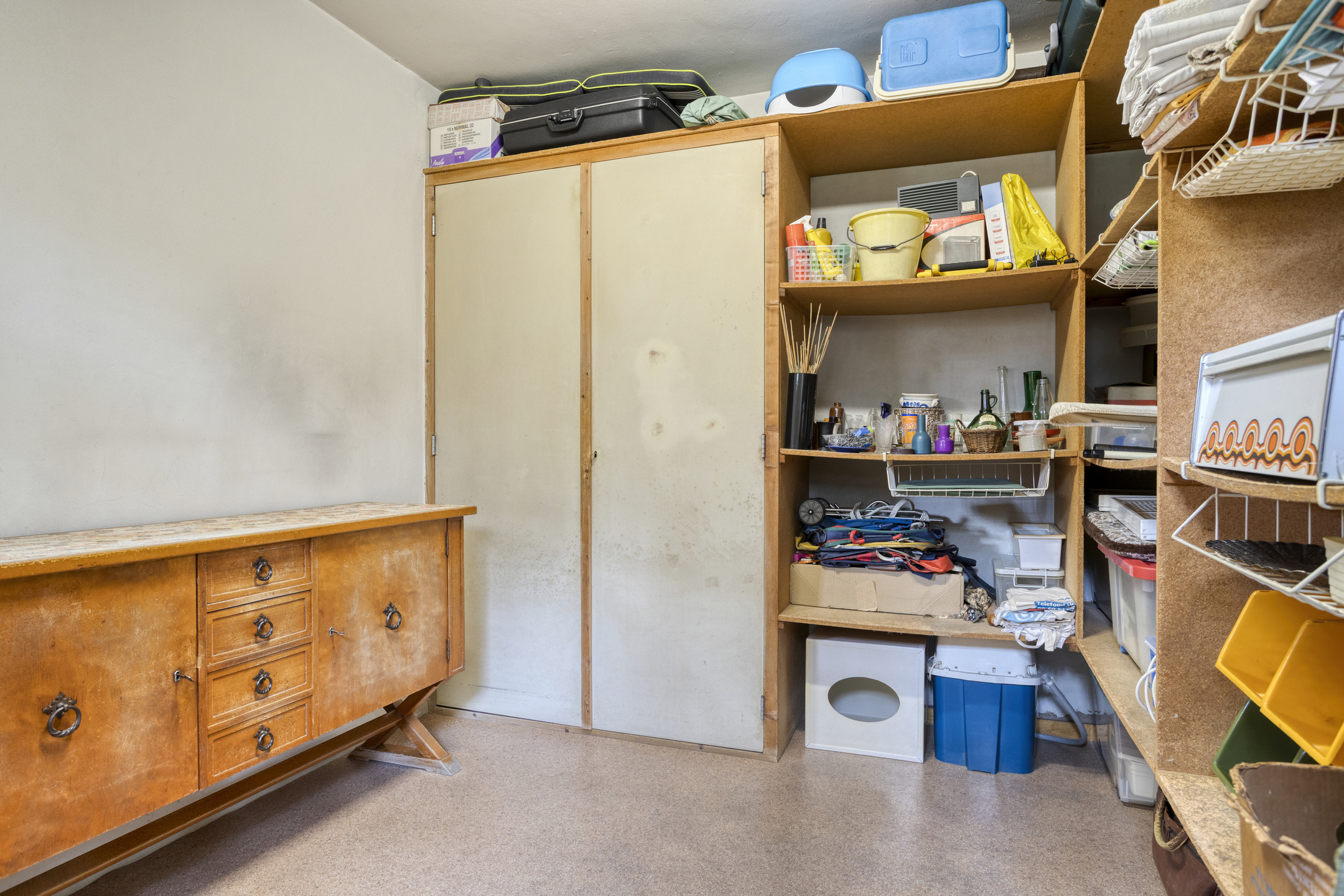Internal storage room with plastered walls, linoleum flooring, plastered ceiling;
