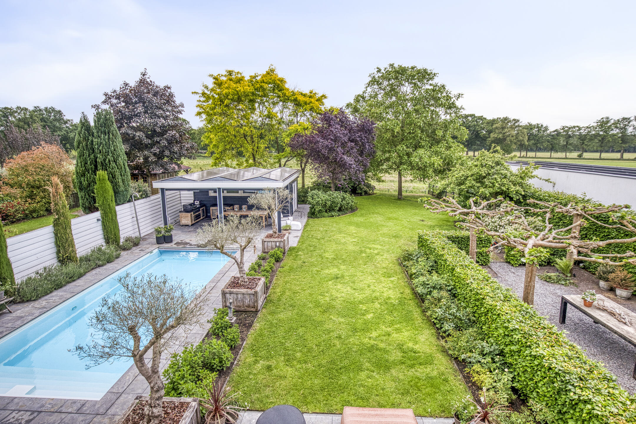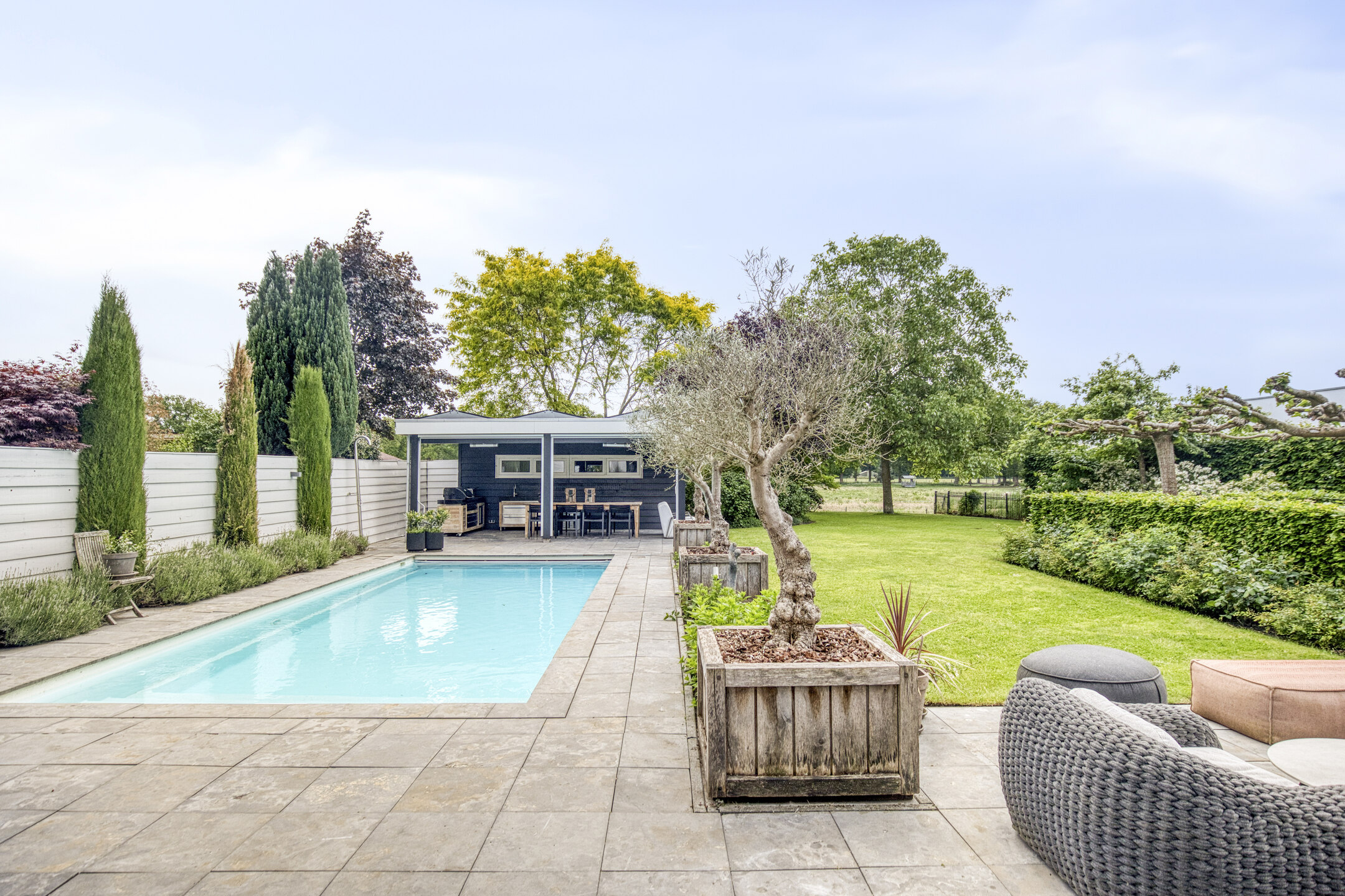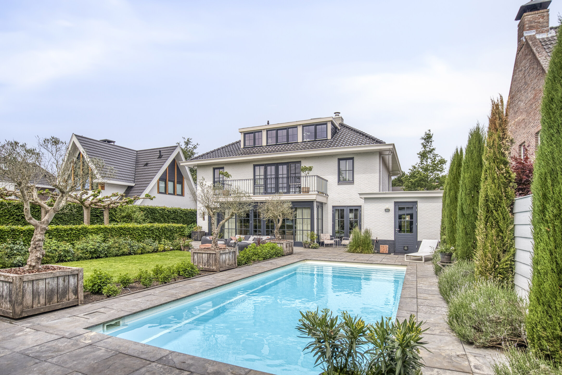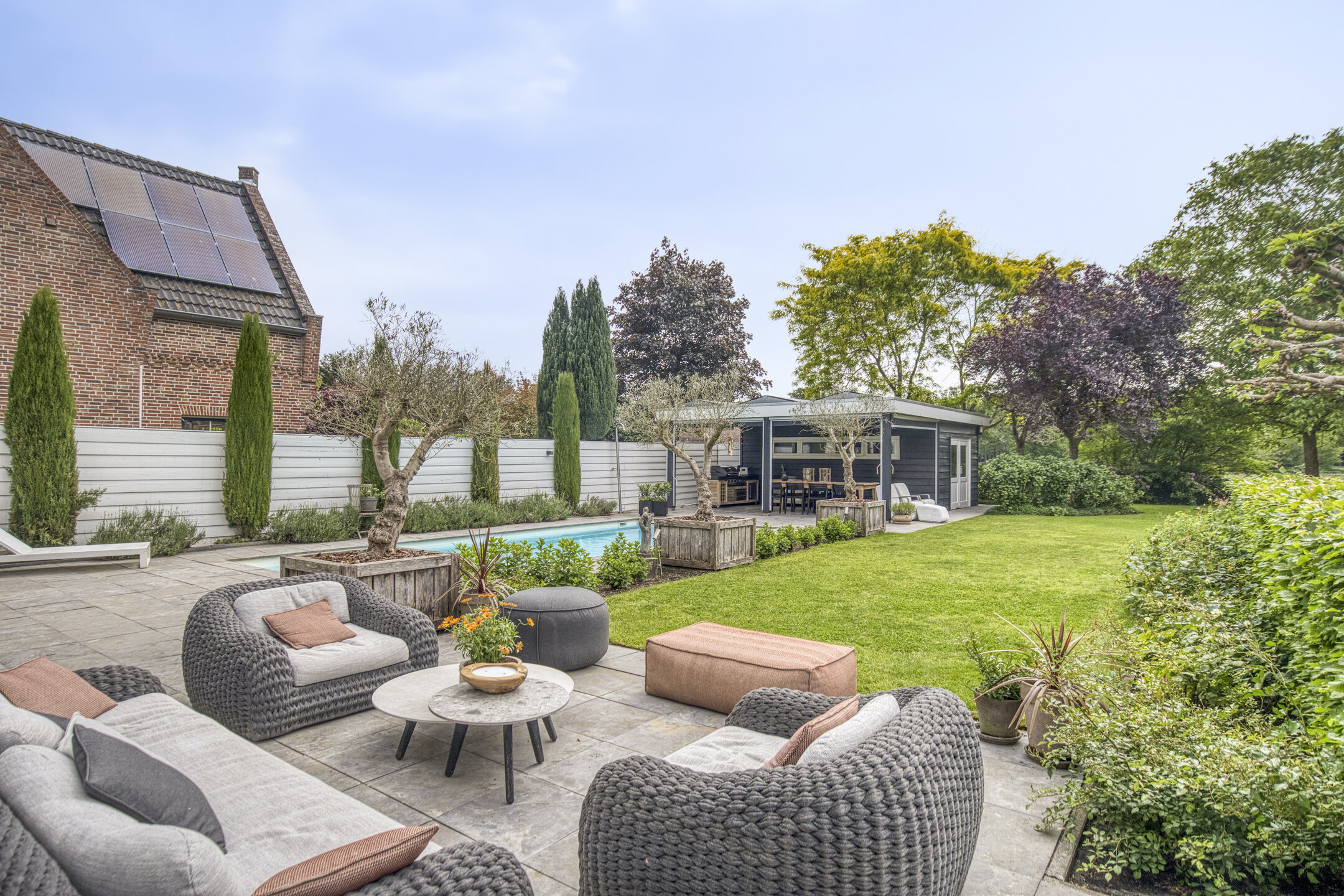 Upstairs, five bedrooms offer space and privacy, including a master with a private balcony, walk-in closet, luxury bathroom, sauna, and generous natural light. A second bathroom and separate storage area support flexibility for family or guest use. Multiple terraces provide the choice of sun or shade throughout the day, and sweeping views over adjoining meadows bring a tranquil backdrop. The landscaped garden features a heated swimming pool and poolhouse with veranda, equipped with automated systems for seamless enjoyment. Sustainability features include 24 solar panels, comprehensive insulation, HR central heating, and complete underfloor heating. This detached villa Huijbergen is a rare opportunity to experience quiet, space, and sophisticated living in the sought-after surroundings of Huijbergen.
