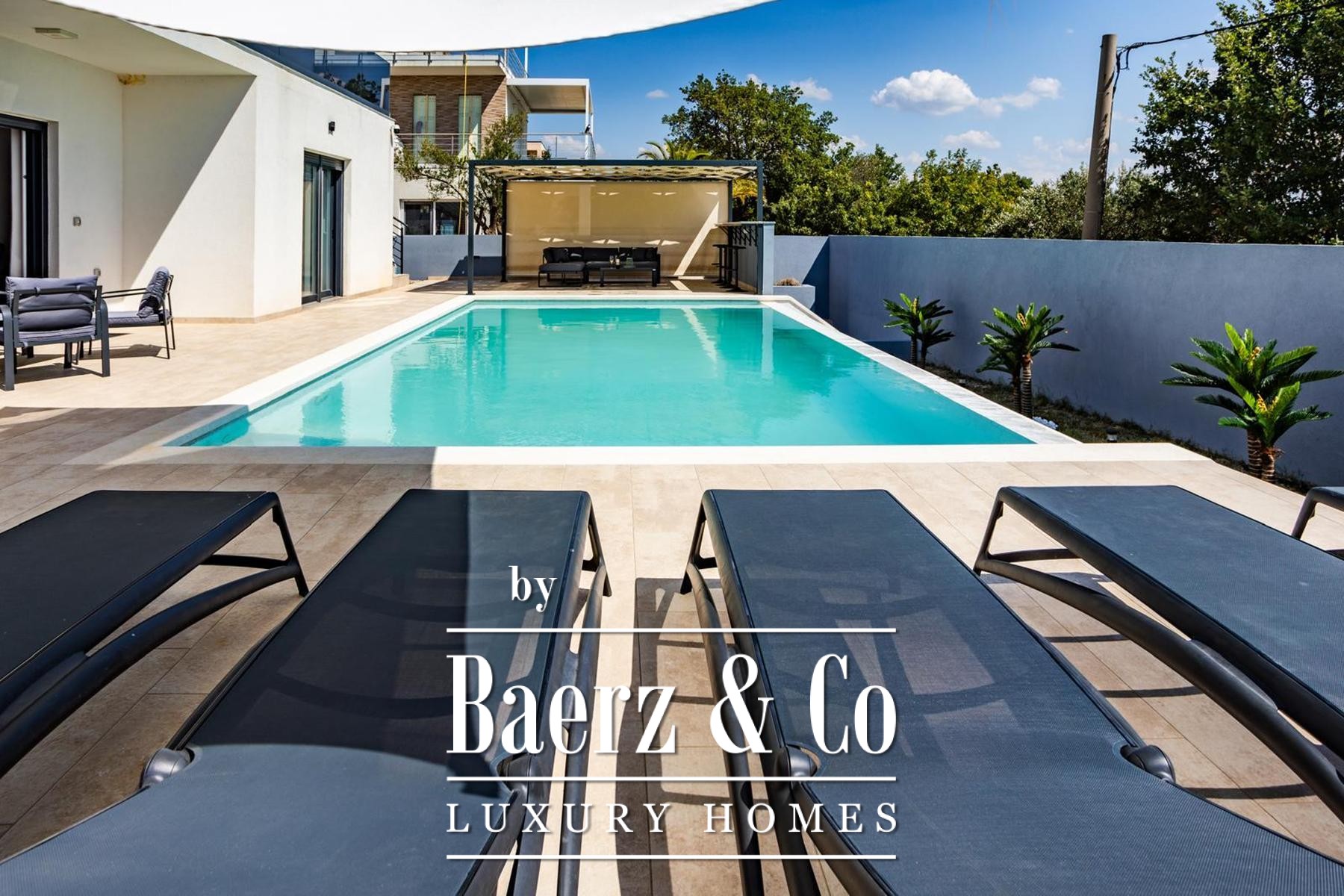 Set on a 531 m² plot, the villa spans three levels connected by an internal staircase and a lift, offering approximately 250 m² of refined living space. The ground floor introduces a children's bedroom, a bathroom, and a master suite with an en suite bathroom, anchored by an open kitchen, dining, and spacious living area. The living room flows onto a landscaped garden terrace crafted for respite and entertainment, featuring a swimming pool, sundeck with deck chairs, a covered lounge, bar, barbecue, and a children's playground.