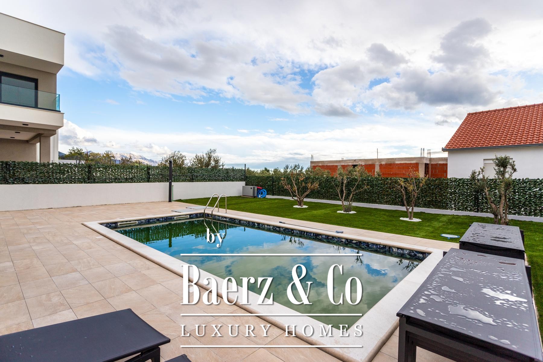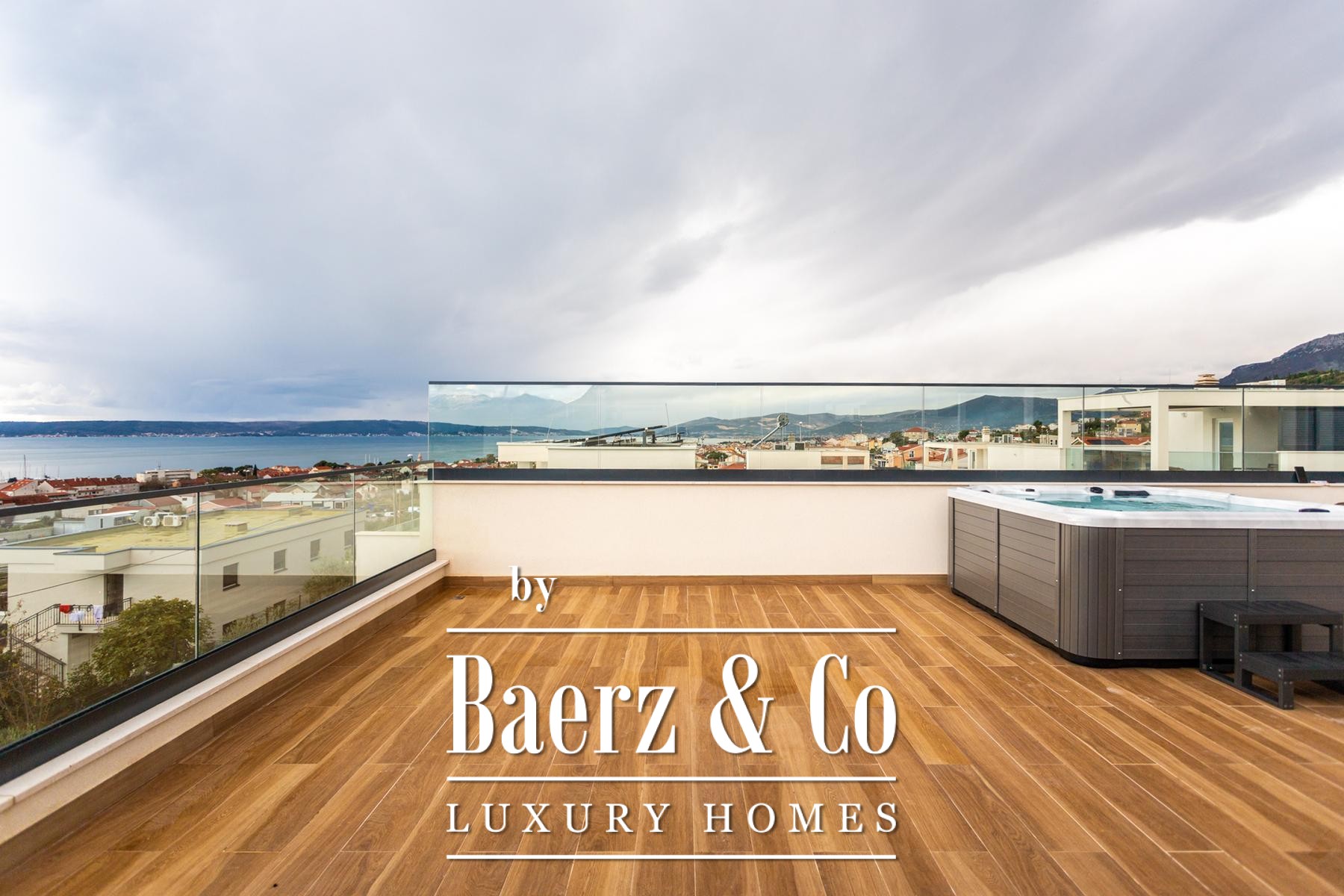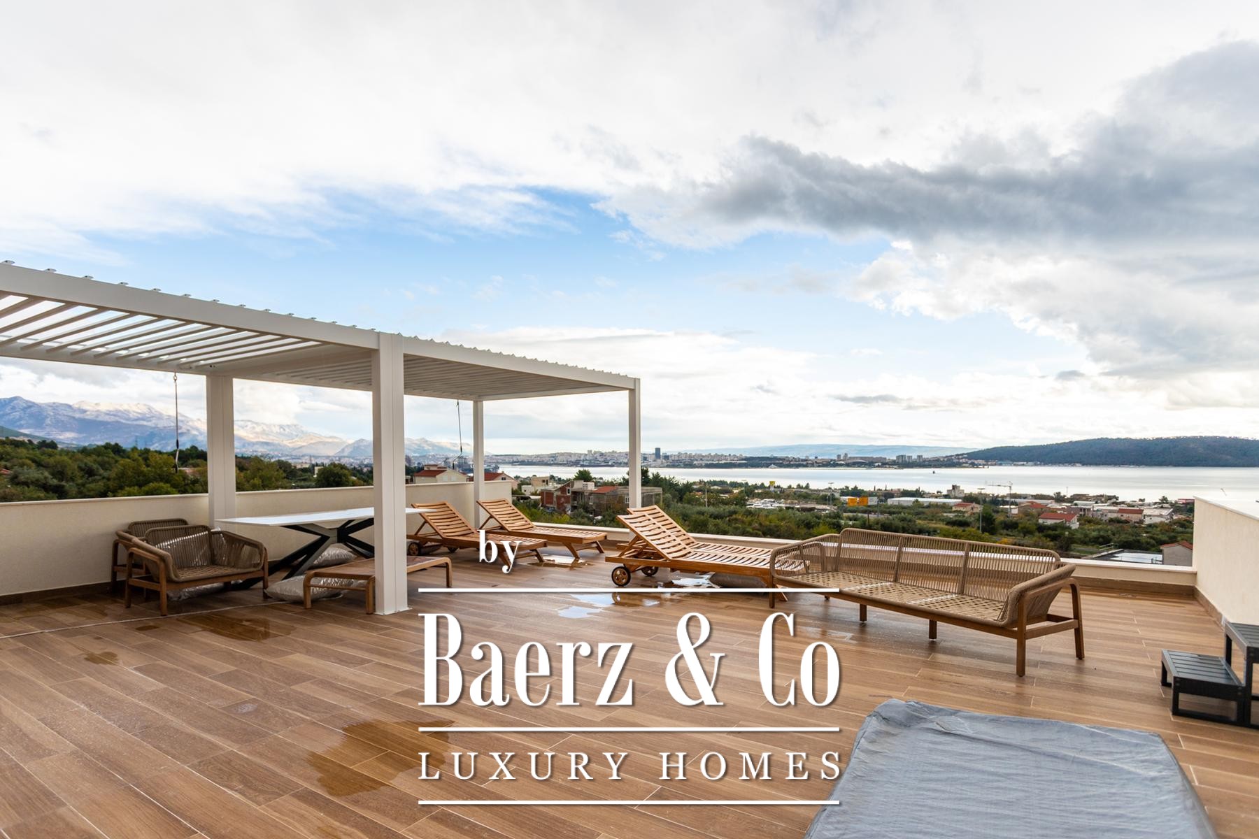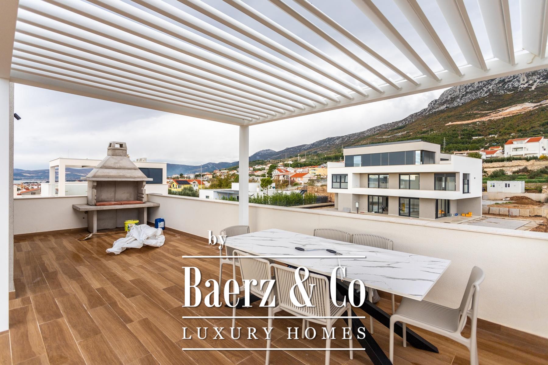 Villa Kaštela stands between Split and the airport, part of a newer enclave of exclusive residences. This villa, with a living area of 300 m² on a 550 m² plot, offers a quiet yet connected retreat in coastal Croatia. The home extends over three levels. The ground floor is designed for open living with a fully equipped kitchen, seamlessly connecting to the terrace and garden. Practical needs are met through a shared toilet, laundry, storage and a sauna at the rear. Upstairs, four bedrooms each enjoy the privacy of an en-suite bathroom. On the top floor, a generous roof terrace features a jacuzzi, barbecue and sheltered lounge, capturing afternoon sun and soft breezes. Every room benefits from underfloor heating and individual air conditioning. The setting balances the privacy of a secure villa complex with swift access to city culture and international travel. Villa Kaštela for sale is an invitation to a lifestyle shaped by light, thoughtful design and ease.