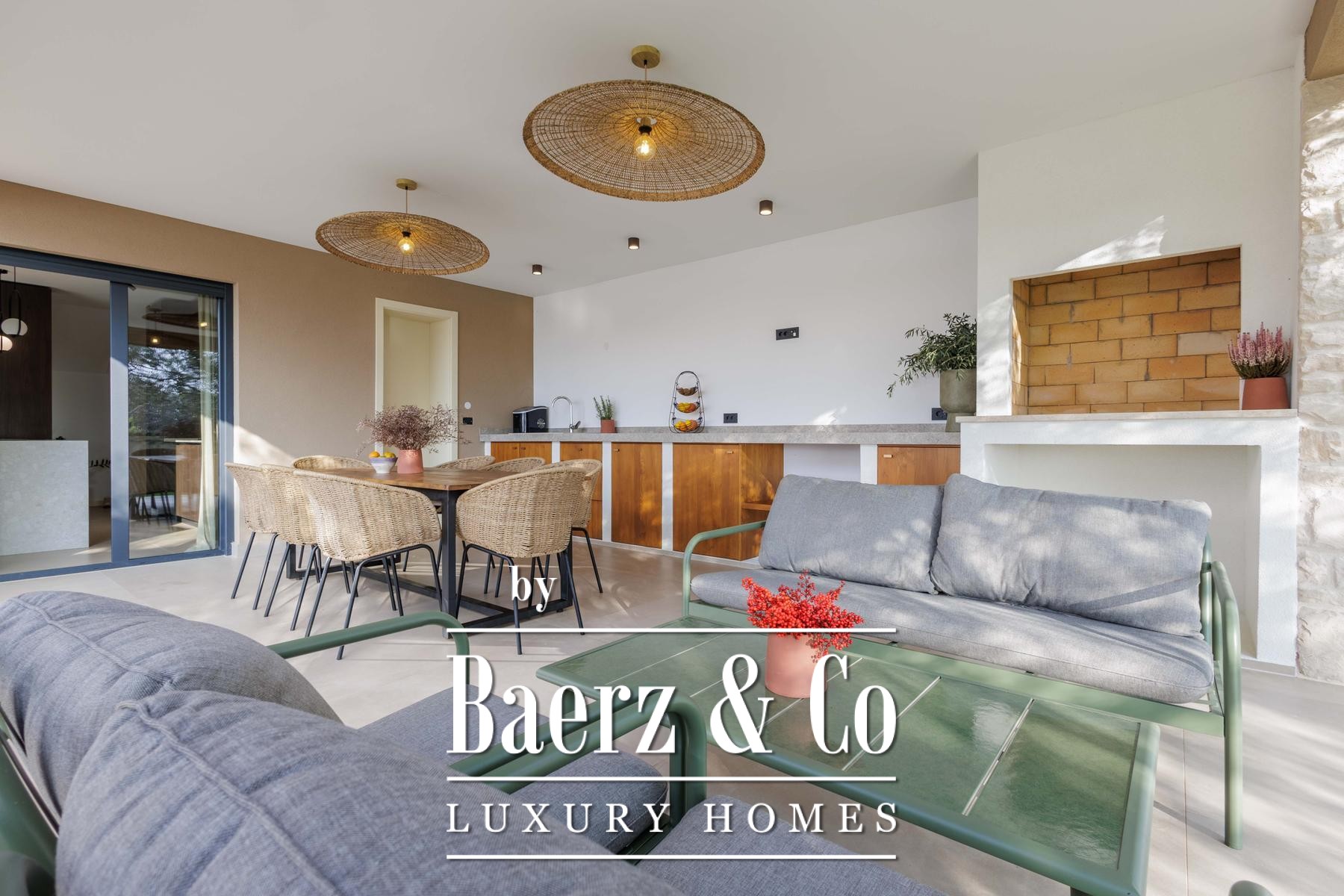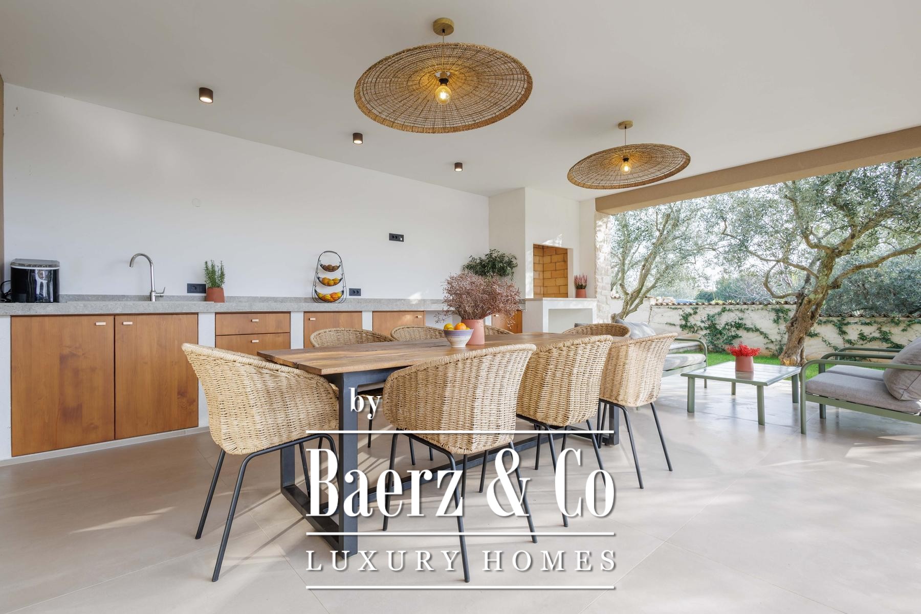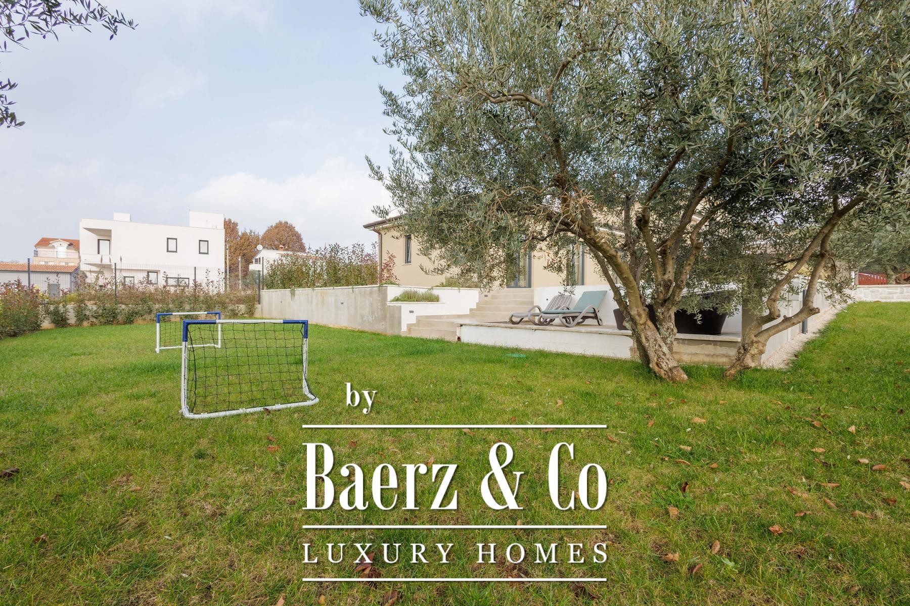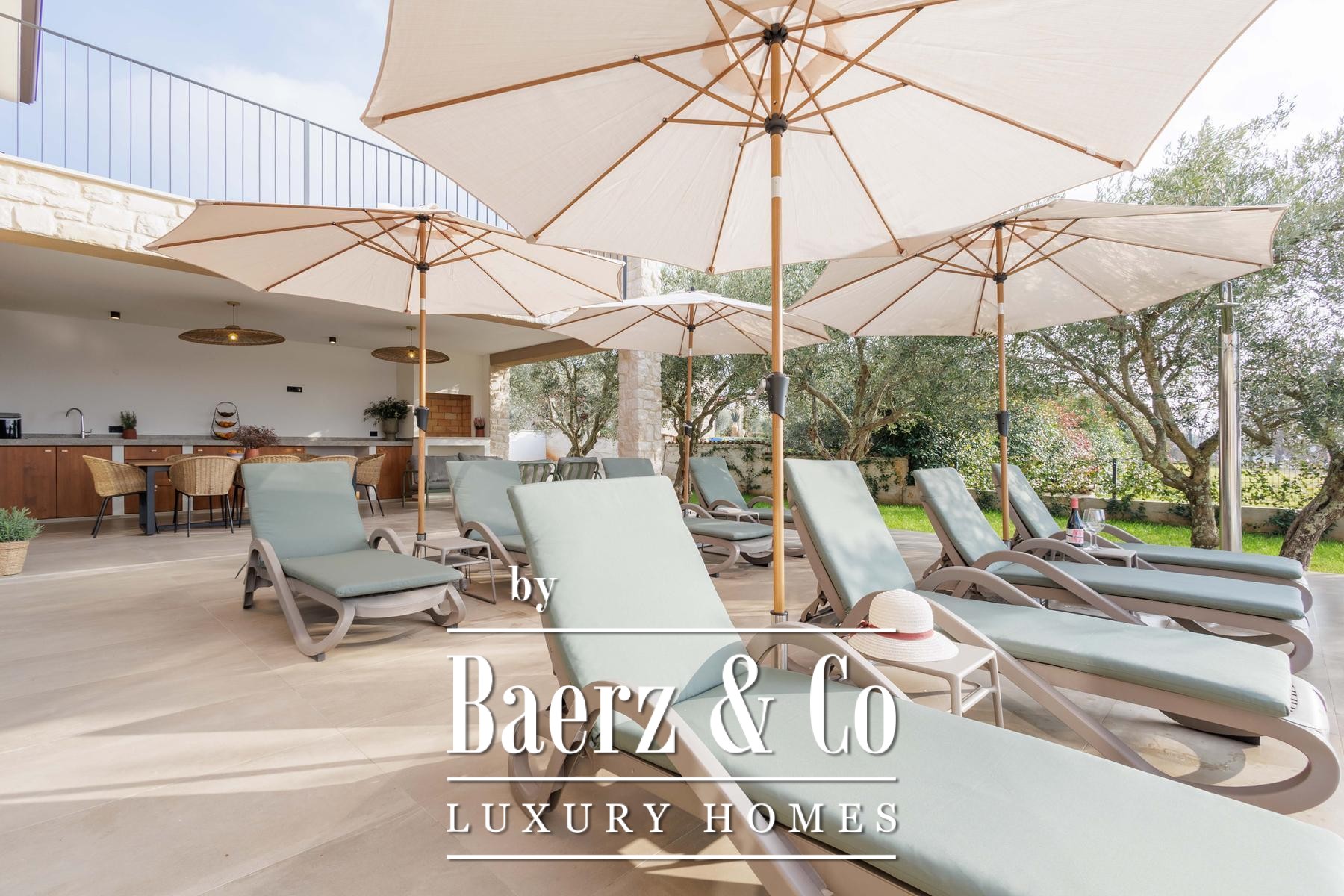 This high-standard, low-energy villa is equipped with underfloor heating powered by a heat pump and seamless air conditioning throughout. Practical design extends to the exterior, where underfloor heating continues into the summer kitchen. The layout includes two separate guest toilets for added convenience. The 1,000 m² plot offers cultivated privacy, with a lush lawn, six olive trees, and an automated irrigation system easing maintenance.