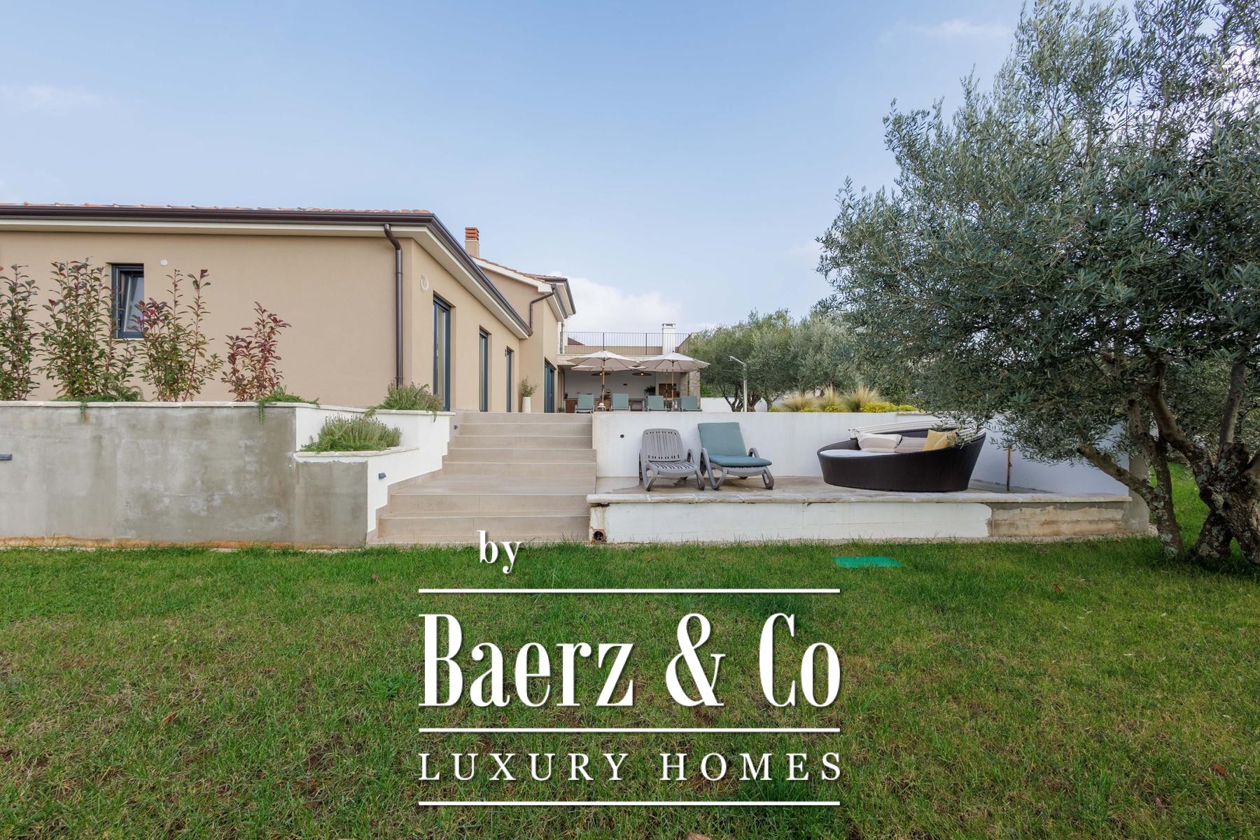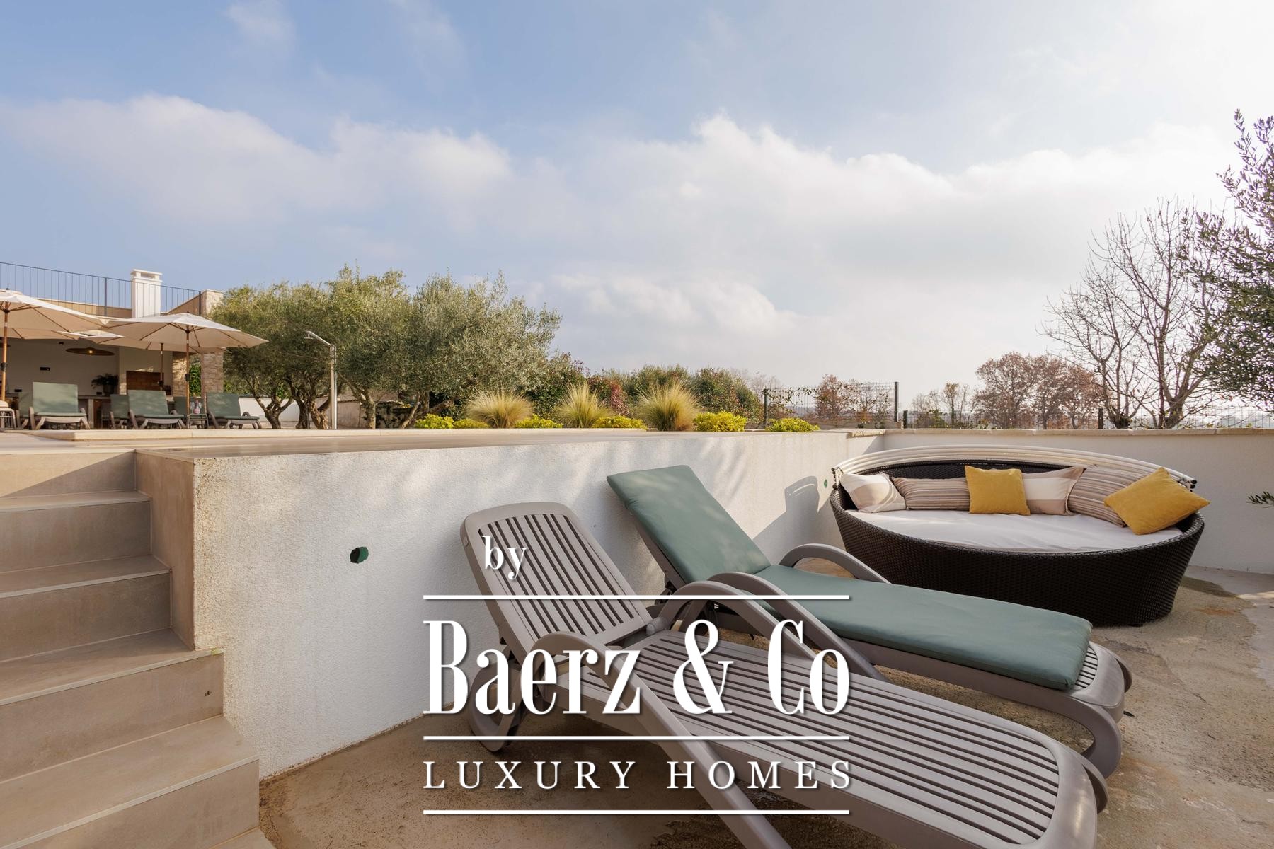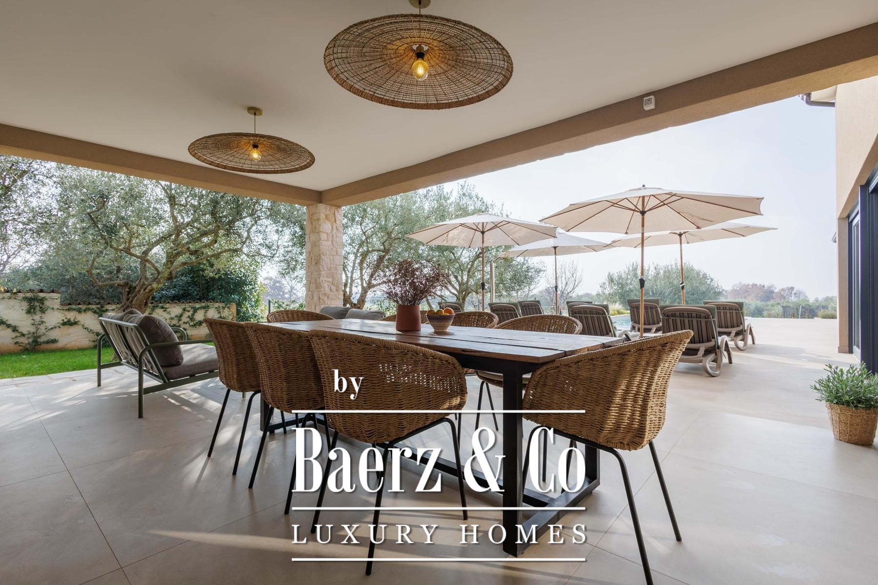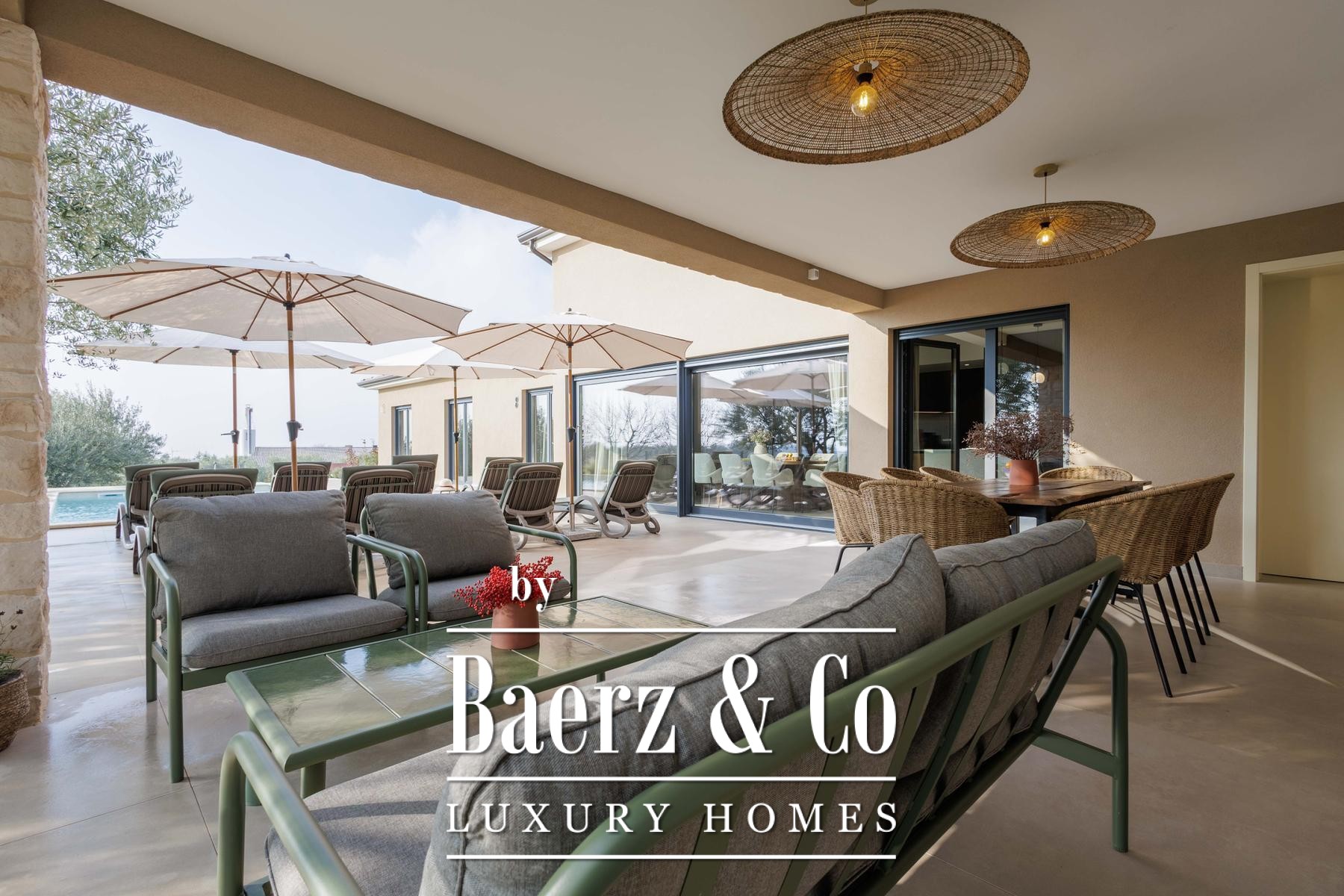 This high-standard, low-energy villa is equipped with underfloor heating powered by a heat pump and seamless air conditioning throughout. Practical design extends to the exterior, where underfloor heating continues into the summer kitchen. The layout includes two separate guest toilets for added convenience. The 1,000 m² plot offers cultivated privacy, with a lush lawn, six olive trees, and an automated irrigation system easing maintenance.