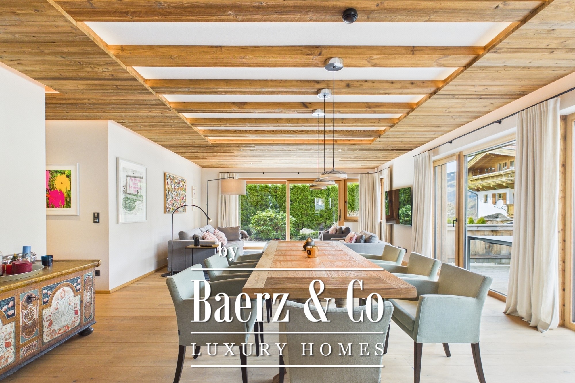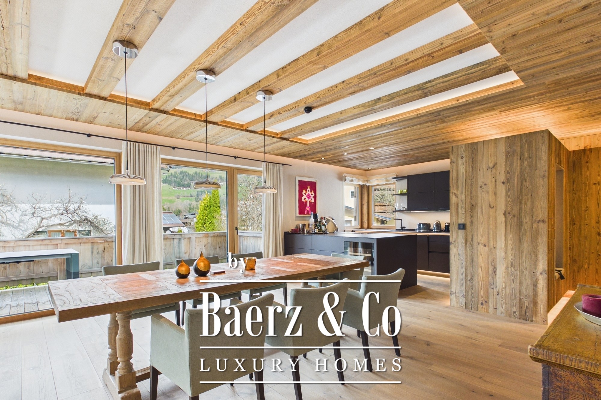 Apartment Kirchberg in Tirol offers a refined living experience at the end of a quiet cul-de-sac, set slightly elevated with close proximity to ski slopes and the town center. Encompassing a generous 135 m² of living area, this residence is distinguished by three rooms each with en-suite bathrooms, two configured as bedrooms, and a large wellness room complete with sauna. An open-plan living, dining, and kitchen area becomes the social heart of the home, featuring reclaimed wood ceilings and a custom-built kitchen fitted with Miele appliances.