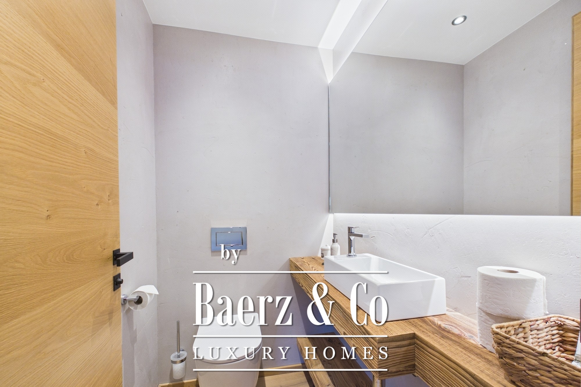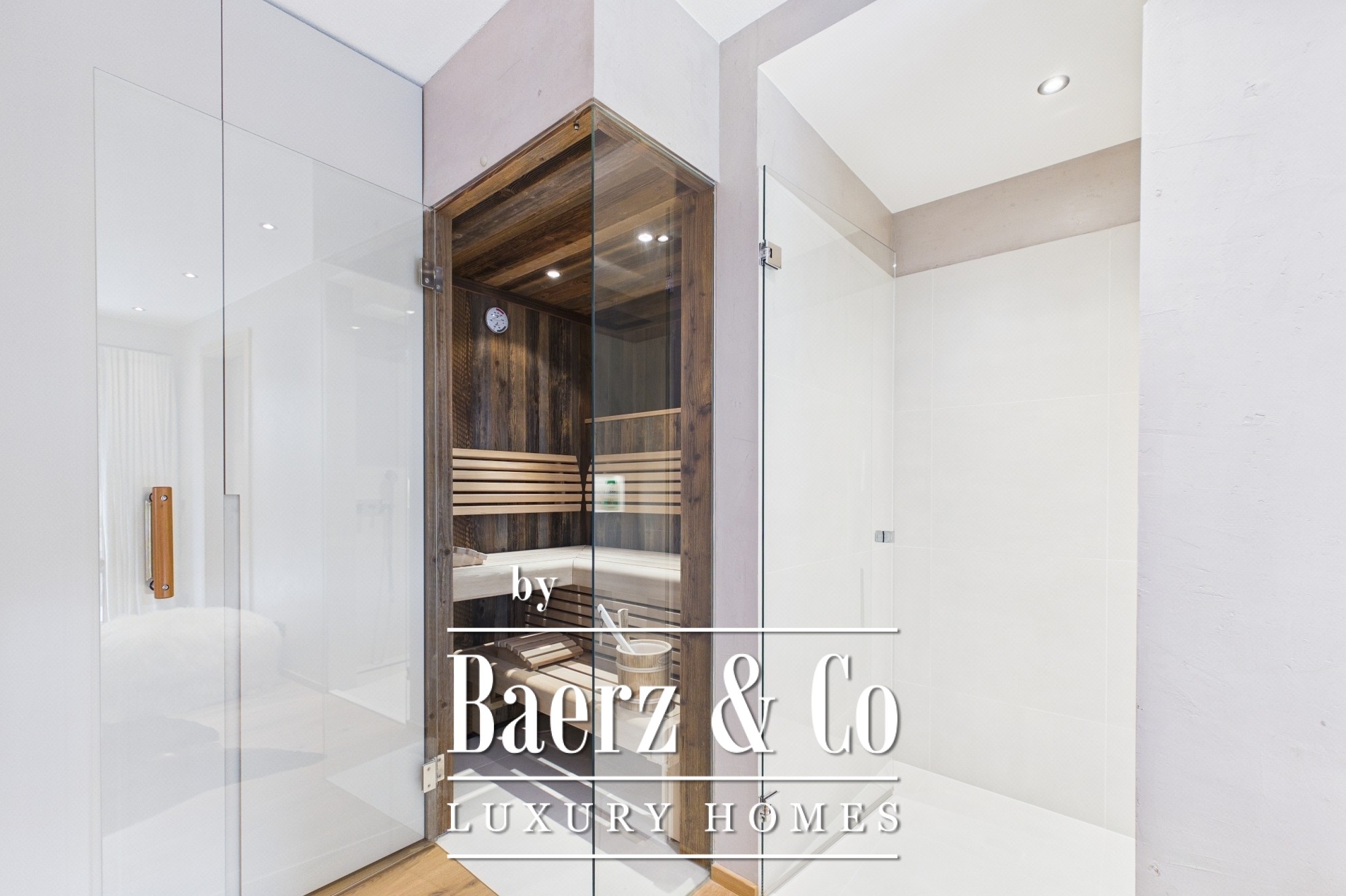 Expansive outdoor spaces are woven into the apartment’s design, including approximately 95 m² of terraces, balcony, and landscaped zones that invite quiet reflection. The living environment is enhanced by thoughtful amenities such as a fireplace, floor heating, smart home system, electric blinds, and an integrated alarm system. Additional offerings include a covered parking space with electric vehicle charging, an outdoor parking bay, and an 8.5 m² storage cellar equipped for winter sports and laundry needs.
