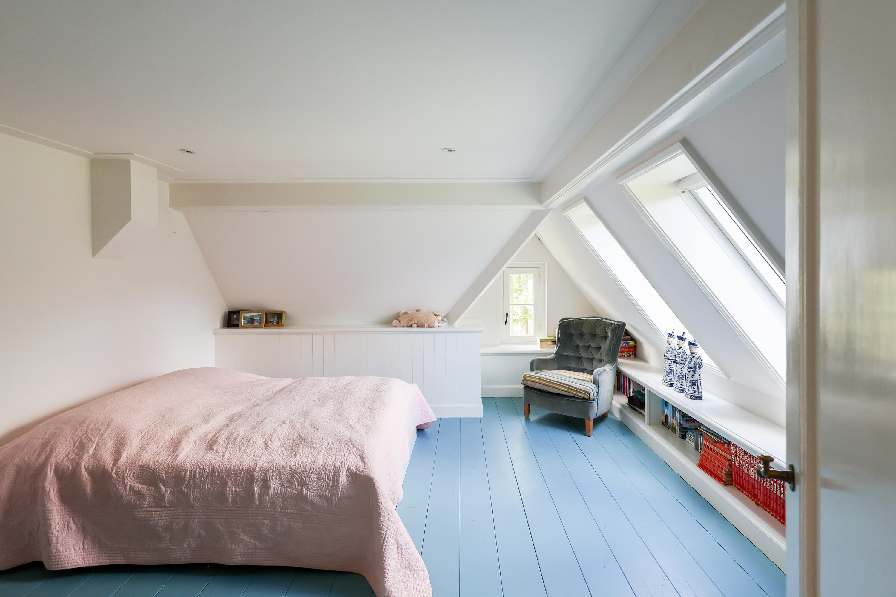 Continuing up the staircase, the second floor reveals a charming attic room, also with a private bathroom.