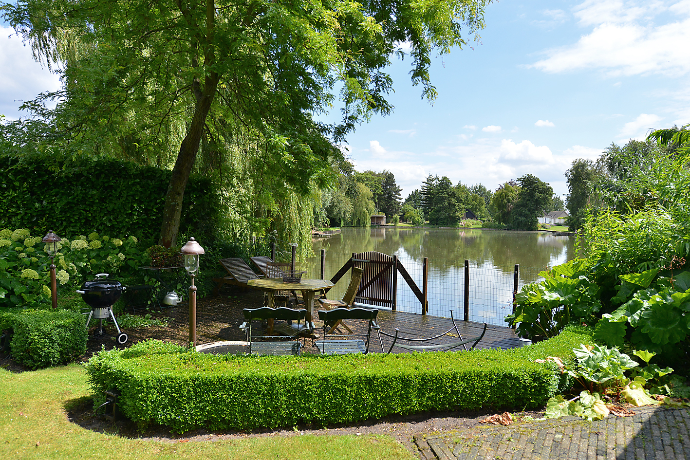 Multiple terraces have been created, including a spacious terrace directly on the water and a large hardstone-paved terrace next to the house, partially shaded by plane trees. The front/side garden also features a decorative pond.