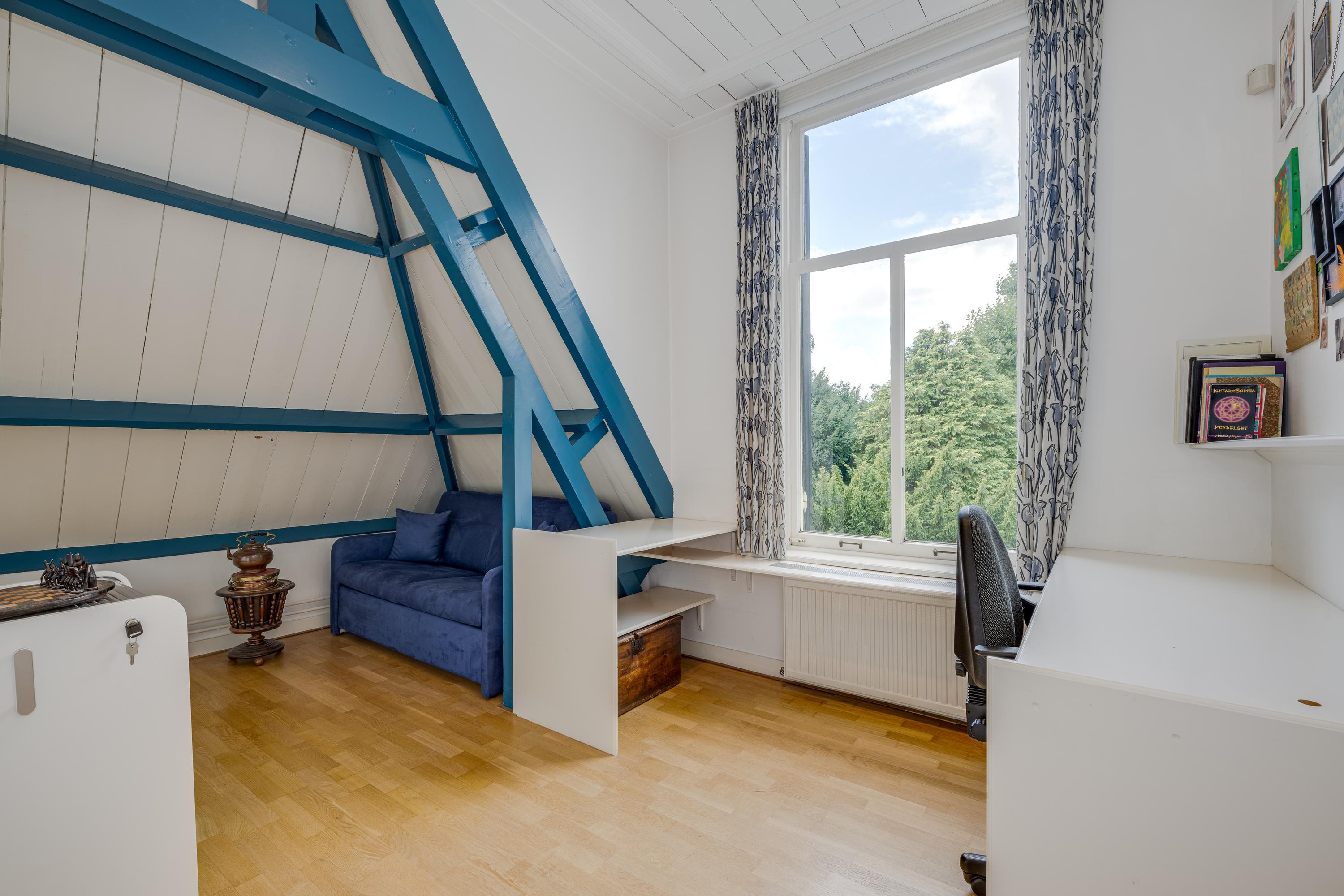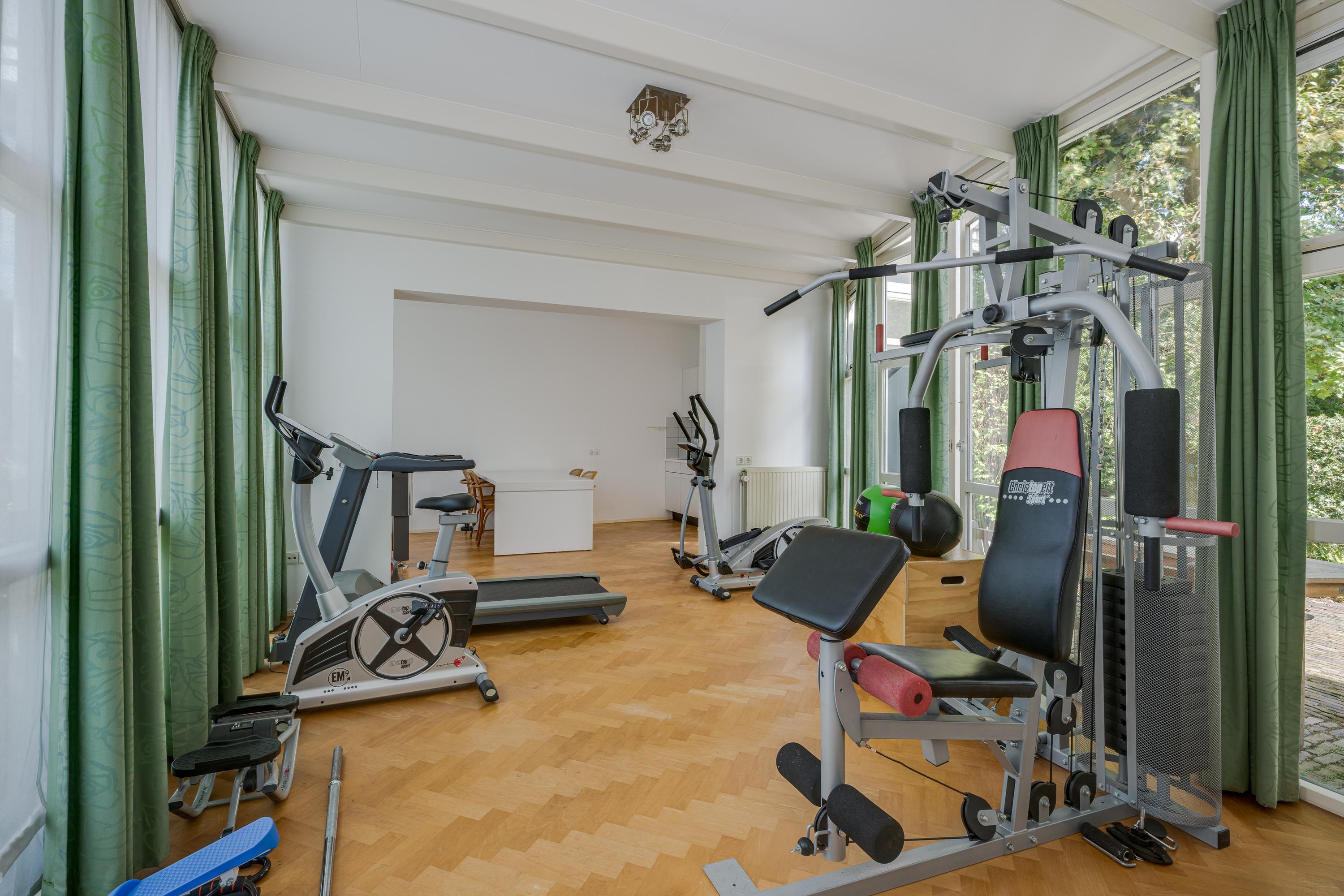 The gatehouse from 1995 is symmetrical in design with a central passage in the middle and on the ground floor an entrance on both the left and right sides. The left wing is used as an office, which also has a toilet, shower and pantry. The right wing is used as a fitness room and also has a toilet, shower and pantry. From both the left and right wings there is a staircase to the room above the gate, which is now furnished as a guest bedroom. The facade of the gatehouse consists largely of glass and has French doors to the garden in both wings, which ensures plenty of light and a connection to the inner garden.